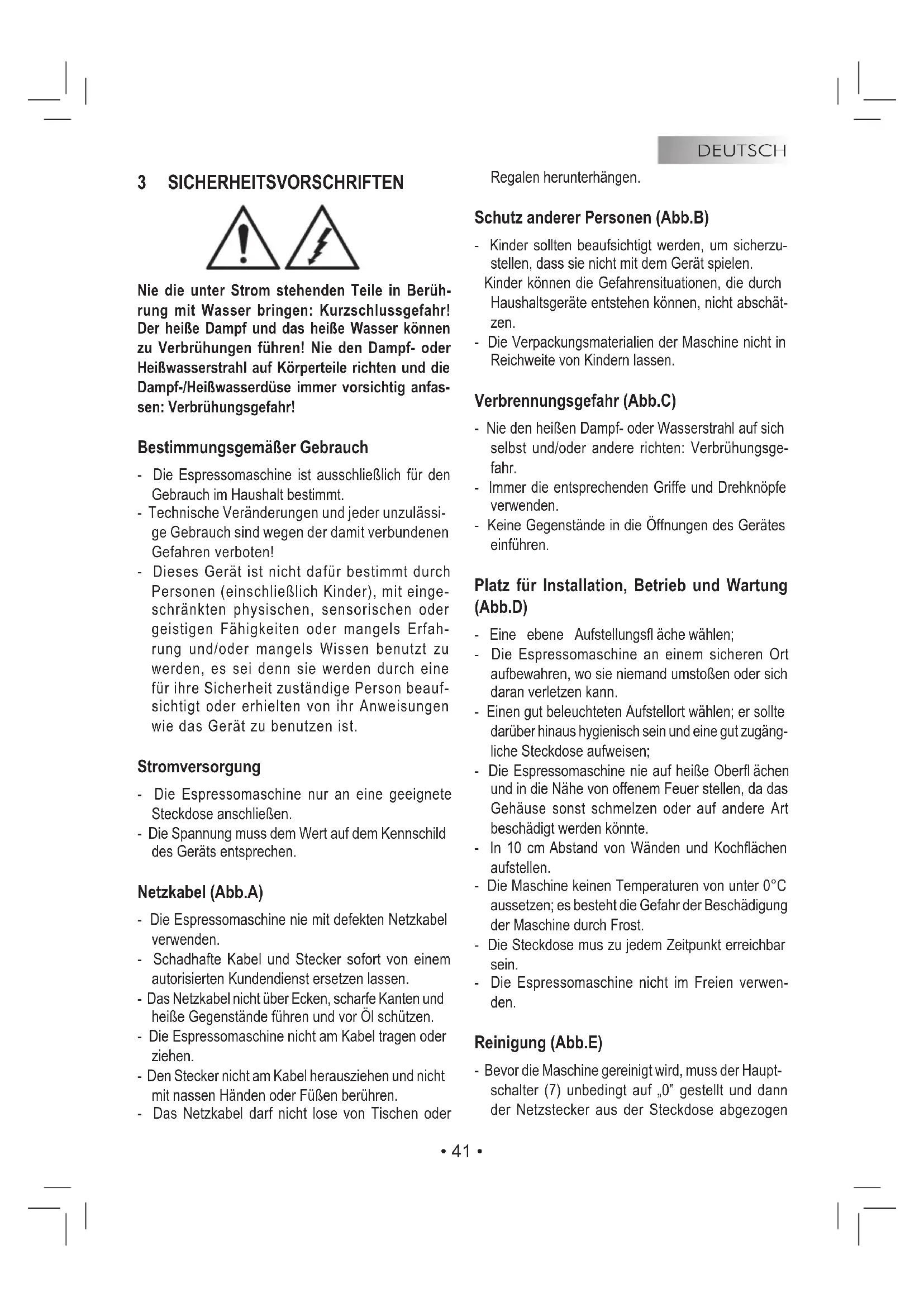 - 41 • 3 SICHERHEITSVORSCHRIFTEN Nie die unter Strom stehenden Teile in Berüh- rung mit Wasser bringen: Kurzschlussgefahr! Der heiße Dampf und das heiße Wasser können zu Verbrühungen führen! Nie den Dampf- oder Heißwasserstrahl auf Körperteile richten und die Dampf-/Heißwasserdüse immer vorsichtig anfas- sen: Verbrühungsgefahr! Bestimmungsgemäßer Gebrauch - Die Espressomaschine ist ausschließlich für den Gebrauch im Haushalt bestimmt. - Technische Veränderungen und jeder unzulässi- ge Gebrauch sind wegen der damit verbundenen Gefahren verboten! - Dieses Gerät ist nicht dafür bestimmt durch Personen (einschließlich Kinder), mit einge- schränkten physischen, sensorischen oder geistigen Fähigkeiten oder mangels Erfah- rung und/oder mangels Wissen benutzt zu werden, es sei denn sie werden durch eine für ihre Sicherheit zuständige Person beauf- sichtigt oder erhielten von ihr Anweisungen wie das Gerät zu benutzen ist. Stromversorgung - Die Espressomaschine nur an eine geeignete Steckdose anschließen. - Die Spannung muss dem Wert auf dem Kennschild des Geräts entsprechen. Netzkabel (Abb.A) - Die Espressomaschine nie mit defekten Netzkabel verwenden. - Schadhafte Kabel und Stecker sofort von einem autorisierten Kundendienst ersetzen lassen. - Das Netzkabel nicht über Ecken, scharfe Kanten und heiße Gegenstände führen und vor Öl schützen. - Die Espressomaschine nicht am Kabel tragen oder ziehen. - Den Stecker nicht am Kabel herausziehen und nicht mit nassen Händen oder Füßen berühren. - Das Netzkabel darf nicht lose von Tischen oder Regalen herunterhängen. Schutz anderer Personen (Abb.B) - Kinder sollten beaufsichtigt werden, um sicherzu- stellen, dass sie nicht mit dem Gerät spielen. Kinder können die Gefahrensituationen, die durch Haushaltsgeräte entstehen können, nicht abschät- zen. - Die Verpackungsmaterialien der Maschine nicht in Reichweite von Kindern lassen. Verbrennungsgefahr (Abb.C) - Nie den heißen Dampf- oder Wasserstrahl auf sich selbst und/oder andere richten: Verbrühungsge- fahr. - Immer die entsprechenden Griffe und Drehknöpfe verwenden. - Keine Gegenstände in die Öffnungen des Gerätes einführen. Platz für Installation, Betrieb und Wartung (Abb.D) - Eine ebene Aufstellungsfl äche wählen; - Die Espressomaschine an einem sicheren Ort aufbewahren, wo sie niemand umstoßen oder sich daran verletzen kann. - Einen gut beleuchteten Aufstellort wählen; er sollte darüber hinaus hygienisch sein und eine gut zugäng- liche Steckdose aufweisen; - Die Espressomaschine nie auf heiße Oberfl ächen und in die Nähe von offenem Feuer stellen, da das Gehäuse sonst schmelzen oder auf andere Art beschädigt werden könnte. - In 10 cm Abstand von Wänden und Kochfl ächen aufstellen. - Die Maschine keinen Temperaturen von unter 0°C aussetzen; es besteht die Gefahr der Beschädigung der Maschine durch Frost. - Die Steckdose mus zu jedem Zeitpunkt erreichbar sein. - Die Espressomaschine nicht im Freien verwen- den. Reinigung (Abb.E) - Bevor die Maschine gereinigt wird, muss der Haupt- schalter (7) unbedingt auf „0” gestellt und dann der Netzstecker aus der Steckdose abgezogenDEUTSCH