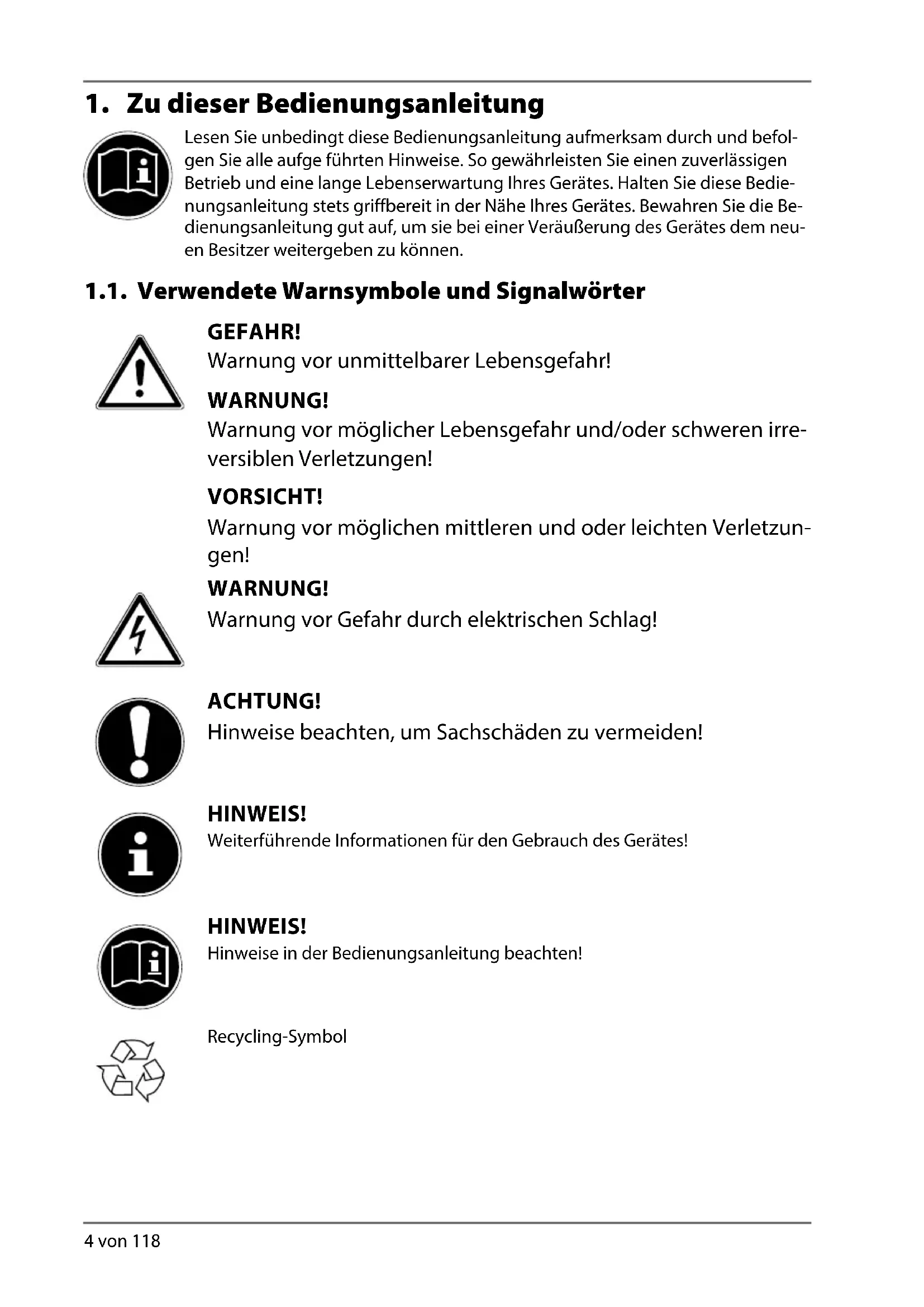 Lesen Sie unbedingt diese Bedienungsanleitung aufmerksam durch und befol- gen Sie alle aufge führten Hinweise. So gewährleisten Sie einen zuverlässigen Betrieb und eine lange Lebenserwartung Ihres Gerätes. Halten Sie diese Bedie- nungsanleitung stets griffbereit in der Nähe Ihres Gerätes. Bewahren Sie die Be- dienungsanleitung gut auf, um sie bei einer Veräußerung des Gerätes dem neu- en Besitzer weitergeben zu können. 1.1. Verwendete Warnsymbole und Signalwörter GEFAHR! Warnung vor unmittelbarer Lebensgefahr! WARNUNG! Warnung vor möglicher Lebensgefahr und/oder schweren irre- versiblen Verletzungen! VORSICHT! Warnung vor möglichen mittleren und oder leichten Verletzun- gen! WARNUNG! Warnung vor Gefahr durch elektrischen Schlag! ACHTUNG! Hinweise beachten, um Sachschäden zu vermeiden! HINWEIS! Weiterführende Informationen für den Gebrauch des Gerätes! HINWEIS! Hinweise in der Bedienungsanleitung beachten! Recycling-SymbolDE