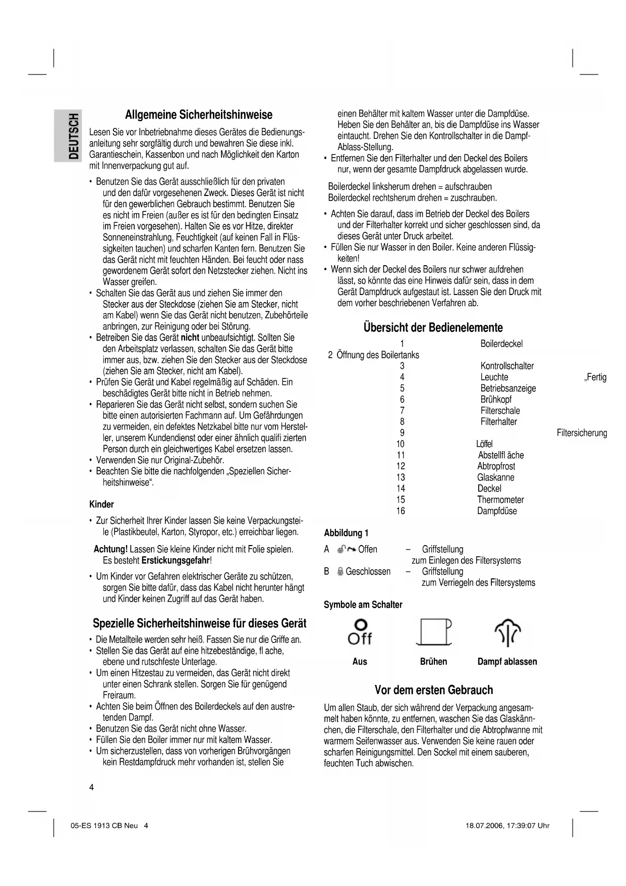 - Wenn sich der Deckel des Boilers nur schwer aufdrehen lässt, so könnte das eine Hinweis dafür sein, dass in dem Gerät Dampfdruck aufgestaut ist. Lassen Sie den Druck mit dem vorher beschriebenen Verfahren ab. Übersicht der Bedienelemente 1 Boilerdeckel 2 Öffnung des Boilertanks 3 Kontrollschalter 4 Leuchte „Fertig“ 5 Betriebsanzeige 6 Brühkopf 7 Filterschale 8 Filterhalter 9 Filtersicherung 10 Löffel 11 Abstellfl äche 12 Abtropfrost 13 Glaskanne 14 Deckel 15 Thermometer 16 Dampfdüse Abbildung 1 A Offen – Griffstellung zum Einlegen des Filtersystems B Geschlossen – Griffstellung zum Verriegeln des Filtersystems Symbole am Schalter Aus Brühen Dampf ablassen Vor dem ersten Gebrauch Um allen Staub, der sich während der Verpackung angesam- melt haben könnte, zu entfernen, waschen Sie das Glaskänn- chen, die Filterschale, den Filterhalter und die Abtropfwanne mit warmem Seifenwasser aus. Verwenden Sie keine rauen oder scharfen Reinigungsmittel. Den Sockel mit einem sauberen, feuchten Tuch abwischen. 05-ES 1913 CB Neu 4 18.07.2006, 17:39:07 UhrDEUTSCH