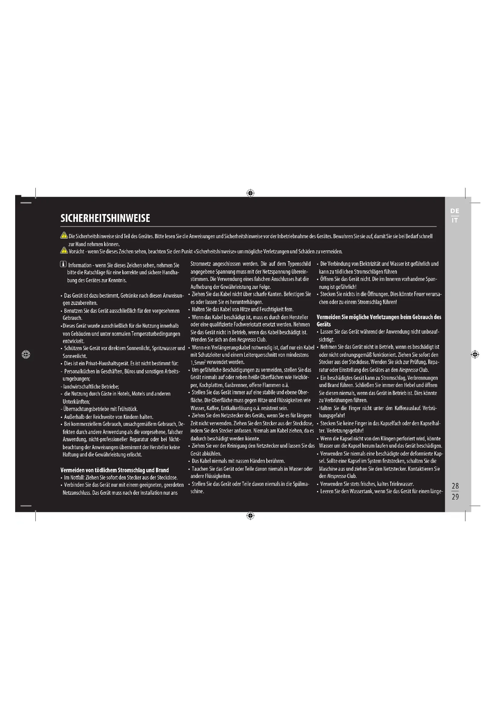 - Nehmen Sie das Gerät nicht in Betrieb, wenn es beschädigt ist oder nicht ordnungsgemäß funktioniert. Ziehen Sie sofort den Stecker aus der Steckdose. Wenden Sie sich zur Prüfung, Reparatur oder Einstellung des Gerätes an den Nespresso Club.