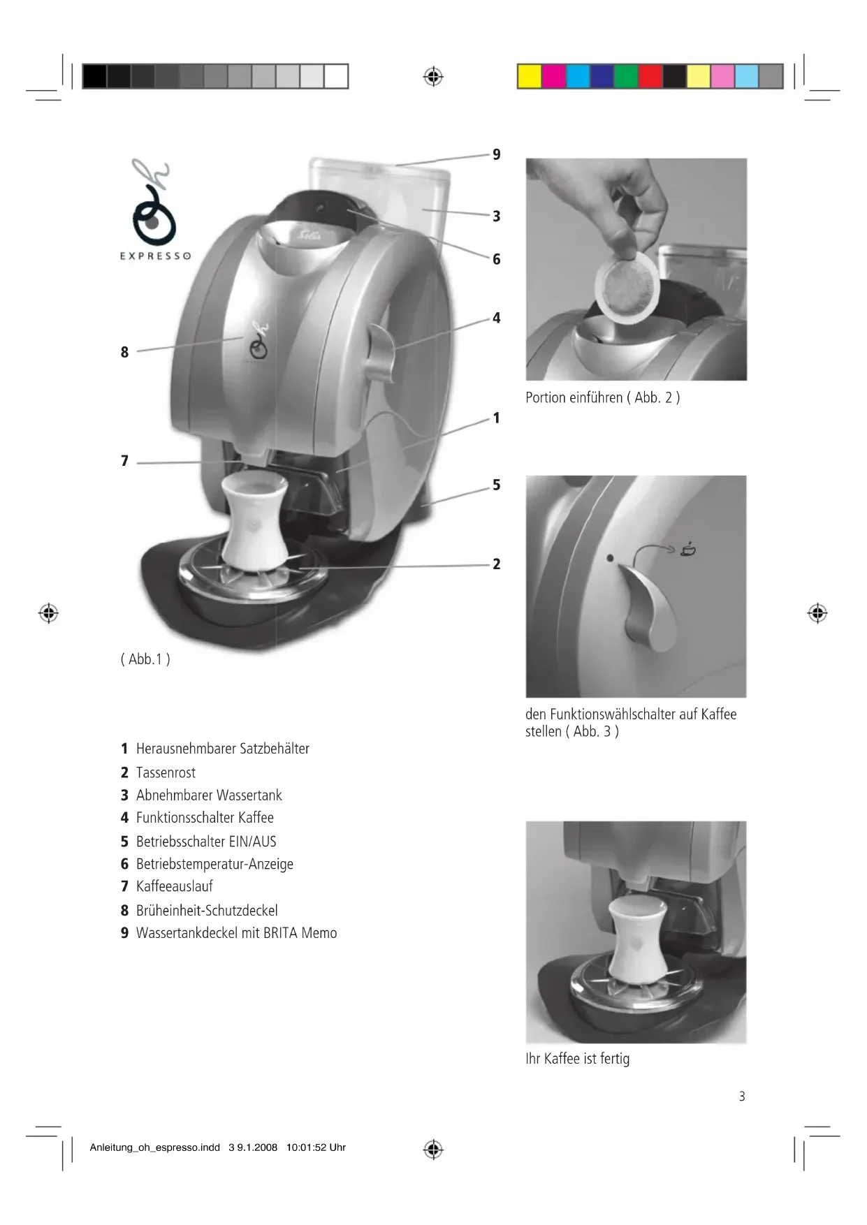 1 Herausnehmbarer Satzbehälter 2 Tassenrost 3 Abnehmbarer Wassertank 4 Funktionsschalter Kaffee 5 Betriebsschalter EIN/AUS 6 Betriebstemperatur-Anzeige 7 Kaffeeauslauf 8 Brüheinheit-Schutzdeckel 9 Wassertankdeckel mit BRITA Memo Portion einführen ( Abb. 2 ) den Funktionswählschalter auf Kaffee stellen ( Abb. 3 ) Ihr Kaffee ist fertig ( Abb.1 ) Anleitung_oh_espresso.indd 3 9.1.2008 10:01:52 UhrVor dem Gebrauch Bitte lesen Sie alle im folgenden aufgeführten Informationen aufmerksam durch. Sie geben wichtige Hinweise für den Gebrauch, die Sicherheit sowie die Pflege des Gerätes. Bewahren Sie die Bedienungsanleitung gut auf.