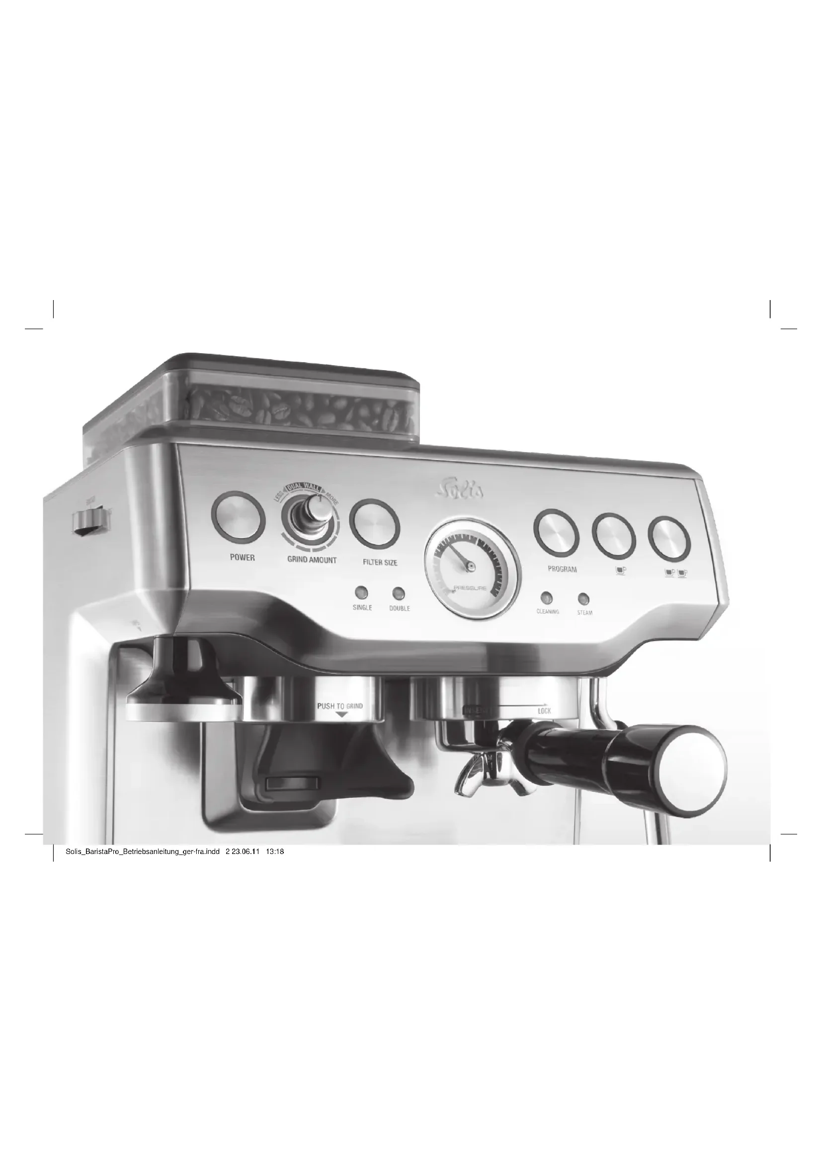 BARISTA PRO Typ/Type 114 Programmierbare Espressomaschine mit Mahlwerk Machine à espresso programmable avec moulin Programmable Espresso Machine with Grinder Gebrauchsanleitung Mode d’emploi User Manual Solis_BaristaPro_Betriebsanleitung_ger-fra.indd 1 23.06.11 13:18Solis_BaristaPro_Betriebsanleitung_ger-fra.indd 2 23.06.11 13:183