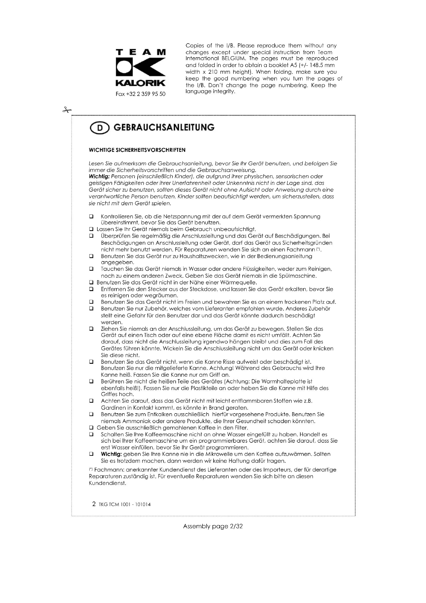 Zum Schutz unserer Umwelt und unserer Gesundheit sind Elektro- und Elektronik-Altgeräte nach bestimmten Regeln zu entsorgen. Dies fordert den Einsatz sowohl des Herstellers bzw. Lieferanten als auch des Verbrauchers. Aus diesem Grund darf dieses Gerät, wie das Symbol auf dem Typenschild bzw. auf der Verpackung zeigt, nicht in den unsortierten Restmüll gegeben werden. Der Verbraucher hat das Recht, dieses Gerät über kommunale Sammelstellen zu entsorgen; von dort aus wird die spezifische Behandlung, Verwertung bzw. das Recycling gem. den Erfordernissen der Richtlinie sichergestellt. Copies of the I/B. Please reproduce them without any changes except under special instruction from Team International BELGIUM. The pages must be reproduced and folded in order to obtain a booklet A5 (+/- 148.5 mm width x 210 mm height). When folding, make sure you keep the good numbering when you turn the pages of the I/B. Don’t change the page numbering. Keep the language integrity.