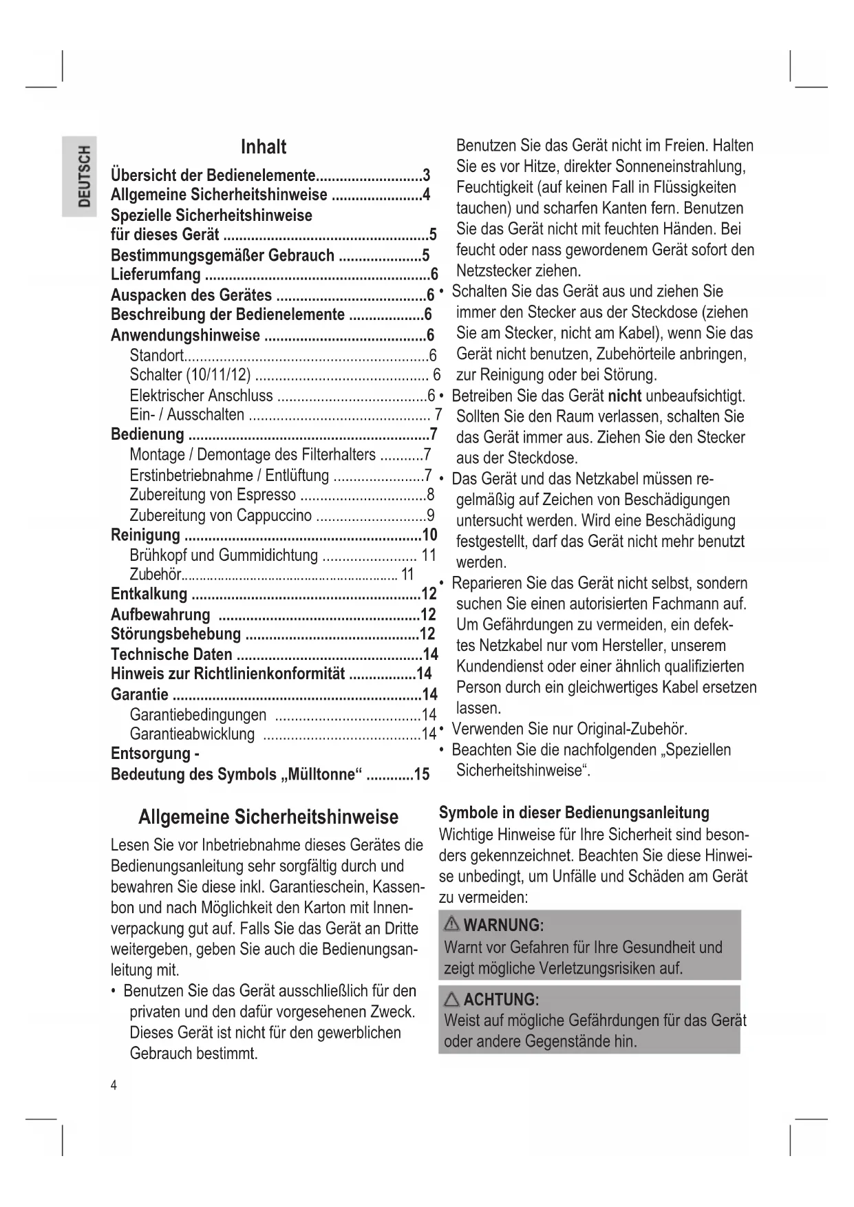 - Entsorgung - Bedeutung des Symbols „Mülltonne“ Allgemeine Sicherheitshinweise Lesen Sie vor Inbetriebnahme dieses Gerätes die Bedienungsanleitung sehr sorgfältig durch und bewahren Sie diese inkl. Garantieschein, Kassen- bon und nach Möglichkeit den Karton mit Innen- verpackung gut auf. Falls Sie das Gerät an Dritte weitergeben, geben Sie auch die Bedienungsan- leitung mit. p. 15
