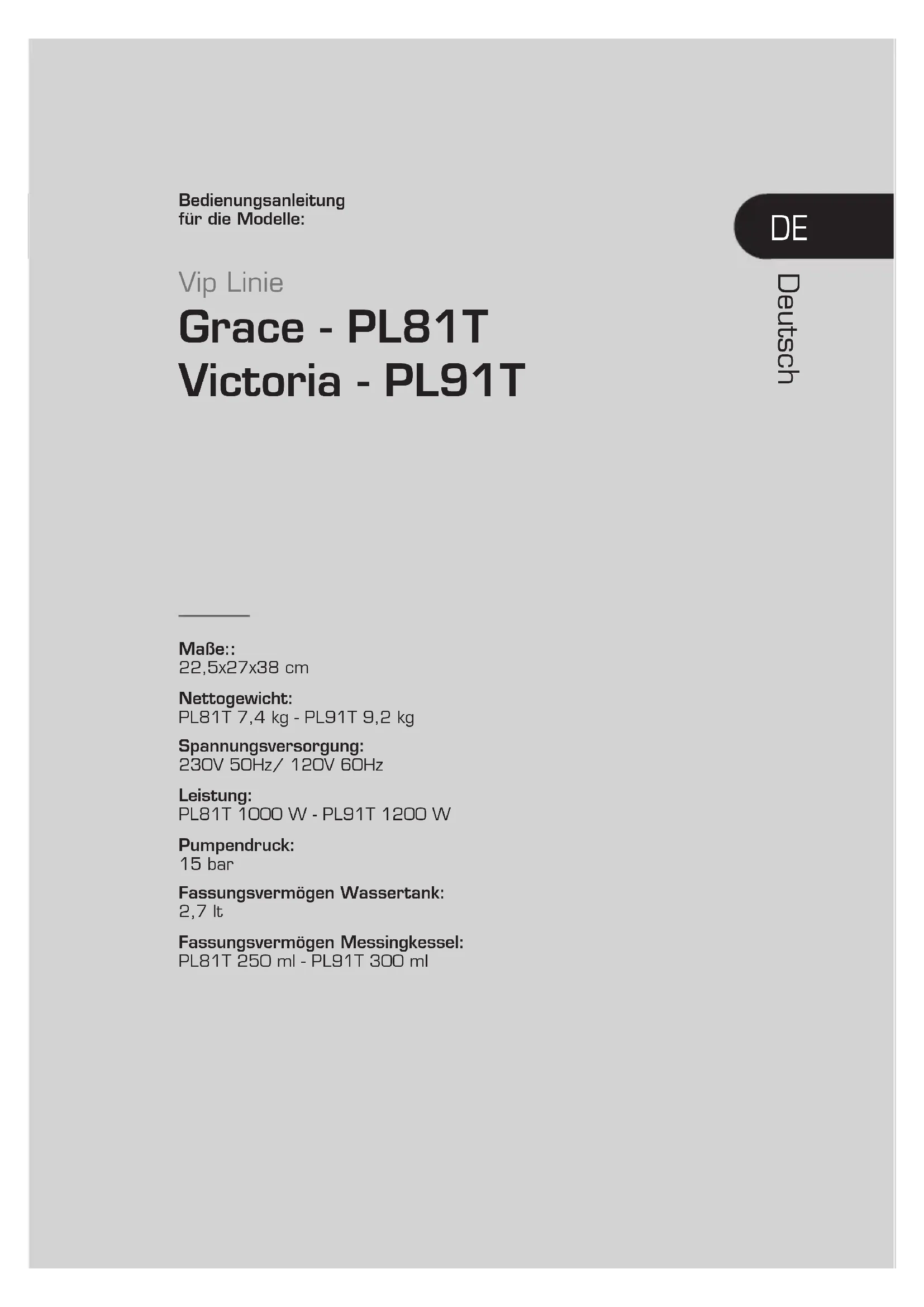 - Berühren Sie das Gerät nicht mit nassen Händen oder Füßen. - Berühren Sie den Netzstecker nicht mit nassen Händen. - Stellen Sie sicher, dass die verwende- te Steckdose immer frei zugänglich ist, denn nur dann können Sie den Stecker bei Bedarf herausziehen. - Wenn Sie den Stecker aus der Steckdo- se herausziehen, sollten Sie direkt am Stecker ziehen. Ziehen Sie niemals am Kabel, weil es dann beschädigt werden könnte. - Um das Gerät vollständig vom Netz zu trennen, ziehen Sie den Stecker aus der Steckdose. - Wenn das Gerät defekt ist, versuchen Sie nicht, es zu reparieren. Schalten Sie es aus, ziehen Sie den Netzstecker aus der Steckdose und kontaktieren Sie den Kundendienst. - Im Falle von Schäden am Stecker oder am Versorgungskabel müssen diese ausschließlich vom Kundendienst ersetzt werden. - Verwenden Sie keine Adapter, Stecker- leisten und/oder Verlängerungskabel. Falls die Verwendung derselben nicht vermeidbar ist, verwenden Sie nur Ein- fachadapter oder Mehrfachadapter und Verlängerungskabel, die den aktuellen Sicherheitsstandards entsprechen. Stel- len Sie jedoch sicher, dass die auf dem Einfachadapter und dem Verlängerungs- kabel angegebene maximale Kapazität und die auf dem Mehrfachadapter an- gegebene maximale Belastbarkeit nicht überschritten wird. - Vor jeder Reinigung der äußeren Teile des Geräts müssen Sie dieses ausschal- ten, den Netzstecker aus der Steckdose ziehen und das Gerät abkühlen lassen. - Um die Verletzungsgefahr zu reduzie- ren, sollten Sie darauf achten, dass das Netzkabel nicht vom Tisch fallen kann und nicht mit heißen Oberächen, schar- fen Kanten oder Gegenständen in Berüh- rung kommt. Warnhinweise über die Gefahren von Verbrühungen Dieses Gerät erzeugt heißes Wasser und Dampf. Halten Sie deshalb sorgfältig die folgenden Sicherheitsanweisungen ein. - Achtung: die heißen Fläche bleiben heiß für eine gewisse Zeit auch nach dem Gebrauch. - Achten Sie darauf, dass Sie nicht mit Spritzwasser oder Dampf in Kontakt kommen. - Wenn das Gerät in Betrieb ist, berührenVip Linie - Grace - PL81T · Victoria - PL91T