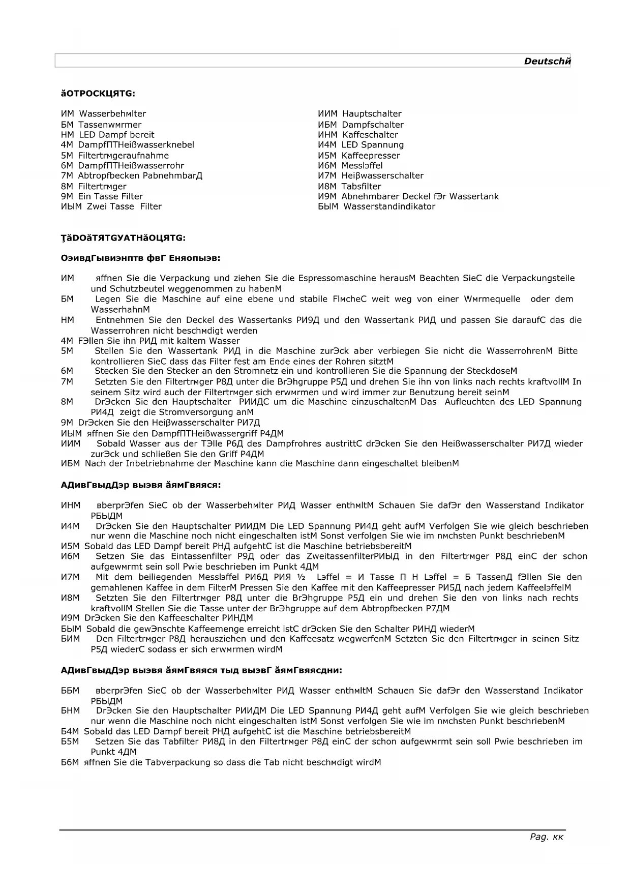 TECHNISHE DATEN: Betriebspannung: 230V-50HZ; 120V-60Hz Leistungsaufnahme Kesselheizung: 1050W Erwärmungszeit: ca. 3 Min. Druckpumpe: 15 Bar Tankvolumen: 2,7 Liter Größe: 34*23*27; Gewicht: 9 Kg Funktioniert mit gemahltem Kaffee und Tabs Ausführung in 240V-50 Hz -> Mod. PL41QEAUSPag. 13 Deutsch