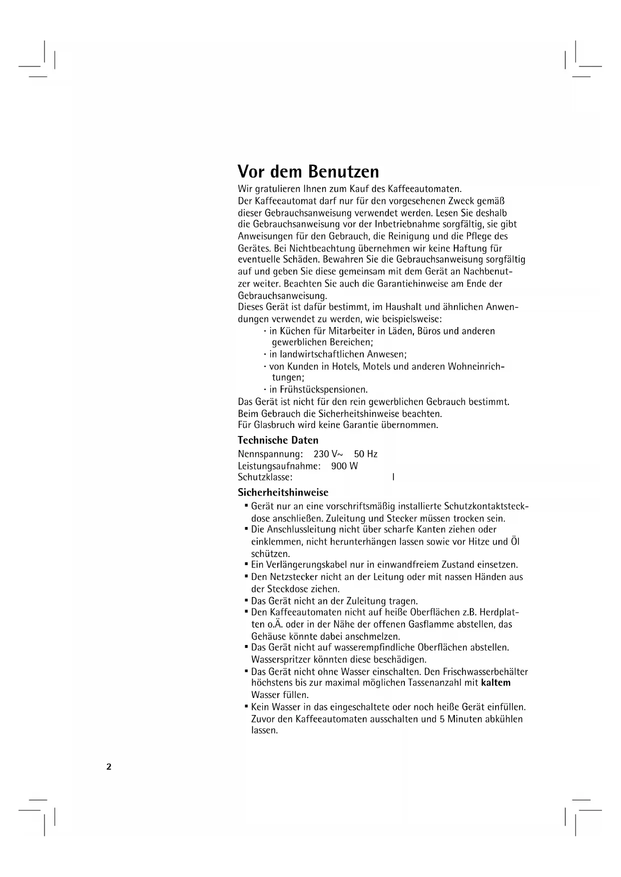 Gebrauchsanweisung Operating Manual Mode d’emploi Istruzioni per l’uso Instrucciones de uso Gebruiksaanwijzing Brugsanvisning Användarguide Käyttöohje Bruksanvisning Kaffeemaschine Glas STELIO, TERRA2 Vor dem Benutzen Wir gratulieren Ihnen zum Kauf des Kaffeeautomaten. Der Kaffeeautomat darf nur für den vorgesehenen Zweck gemäß dieser Gebrauchsanweisung verwendet werden. Lesen Sie deshalb die Gebrauchsanweisung vor der Inbetriebnahme sorgfältig, sie gibt Anweisungen für den Gebrauch, die Reinigung und die Pflege des Gerätes. Bei Nichtbeachtung übernehmen wir keine Haftung für eventuelle Schäden. Bewahren Sie die Gebrauchsanweisung sorgfältig auf und geben Sie diese gemeinsam mit dem Gerät an Nachbenut- zer weiter. Beachten Sie auch die Garantiehinweise am Ende der Gebrauchsanweisung. Dieses Gerät ist dafür bestimmt, im Haushalt und ähnlichen Anwen- dungen verwendet zu werden, wie beispielsweise: ⋅ in Küchen für Mitarbeiter in Läden, Büros und anderen gewerblichen Bereichen; ⋅ in landwirtschaftlichen Anwesen; ⋅ von Kunden in Hotels, Motels und anderen Wohneinrich- tungen; ⋅ in Frühstückspensionen. Das Gerät ist nicht für den rein gewerblichen Gebrauch bestimmt. Beim Gebrauch die Sicherheitshinweise beachten. Für Glasbruch wird keine Garantie übernommen. Technische Daten Nennspannung: 230 V~ 50 Hz Leistungsaufnahme: 900 W Schutzklasse: I Sicherheitshinweise