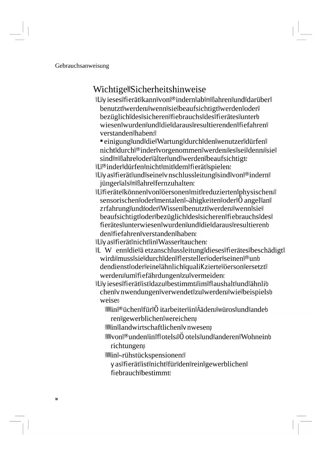 - Geräte können von Personen mit reduzierten physischen, sensorischen oder mentalen Fähigkeiten oder Mangel an Erfahrung und/oder Wissen benutzt werden, wenn sie beaufsichtigt oder bezüglich des sicheren Gebrauchs des Gerätes unterwiesen wurden und die daraus resultieren- den Gefahren verstanden haben.