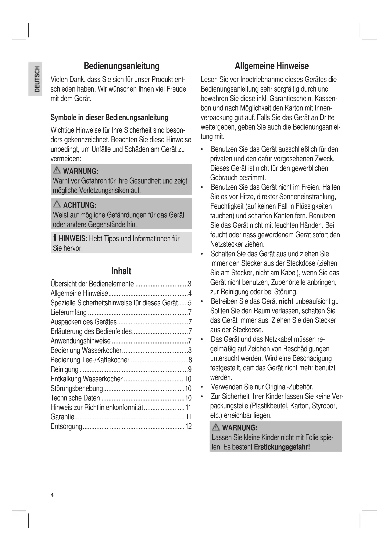 Beschädigungen feststellbar sein, nehmen Sie das Gerät nicht in Betrieb. Bringen Sie es umgehend zum Händler zurück. HINWEIS: Am Gerät können sich noch Staub oder Pro- duktionsreste befinden. Wir empfehlen Ihnen, das Gerät wie unter „Reinigung“ beschrieben zu säubern. Erläuterung des Bedienfeldes 1 Warmhaltetemperatur verringern ( ) 2 Warmhaltetemperatur erhöhen ( ) 3 Temperatur-Anzeige 4 Kontrollleuchten(TEA/COFFEE) 5 Ab Werk eingestellte Warmhaltetemperatur für TeeoderKaffeewählen(MOD) 6 Warmhalteplatte Ein-/Ausschalten ( ) Anwendungshinweise Standort Stellen Sie die Basisstation auf eine ebene Unter- lage. Vorbereitung Wasserkocher: Vor der ersten Verwendung kochen Sie das Gerät 3x mit frischem Wasser aus. Benut- zen Sie nur klares Wasser ohne Zusatzmittel. Tee-/Kaffeekocher: Reinigen Sie den Tee-/ Kaffeekocher und den Filter in gewohnter Weise in einem Spülbad. Spülen Sieanschließendmitklarem Wasser nach. Trocken Sie den Tee-/Kaffeekocher und den Filter mit einem Tuch. Netzkabel Wickeln Sie das benötigte Netzkabel komplett vom Bodenteil der Basis ab. Achten Sie auf die Führung des Netzkabels. Elektrischer Anschluss Prüfen Sie, ob die Netzspannung, die Sie benutzen wollen, mit der des Gerätes übereinstimmt. Die Angaben hierzu finden Sie auf dem Typenschild der Basis. Es ist nicht für die Anwendung in landwirtschaftlichen Anwesen oder Frühstückspensionen bestimmt. ACHTUNG: Dieses Gerät ist nicht dazu bestimmt, bei der Reinigung in Wasser eingetaucht zu werden. Beachten Sie die Anweisungen, die wir Ihnen im Kapitel „Reinigung“ dazu geben.8 Anschlusswert Insgesamt kann das Gerät eine Leistung von 2500 W aufnehmen. Bei diesem Anschlusswert empfiehlt sich eine getrennte Zuleitung mit einer Absicherung über einen 16 A Haushaltsschutz- schalter. ACHTUNG: Überlastung!