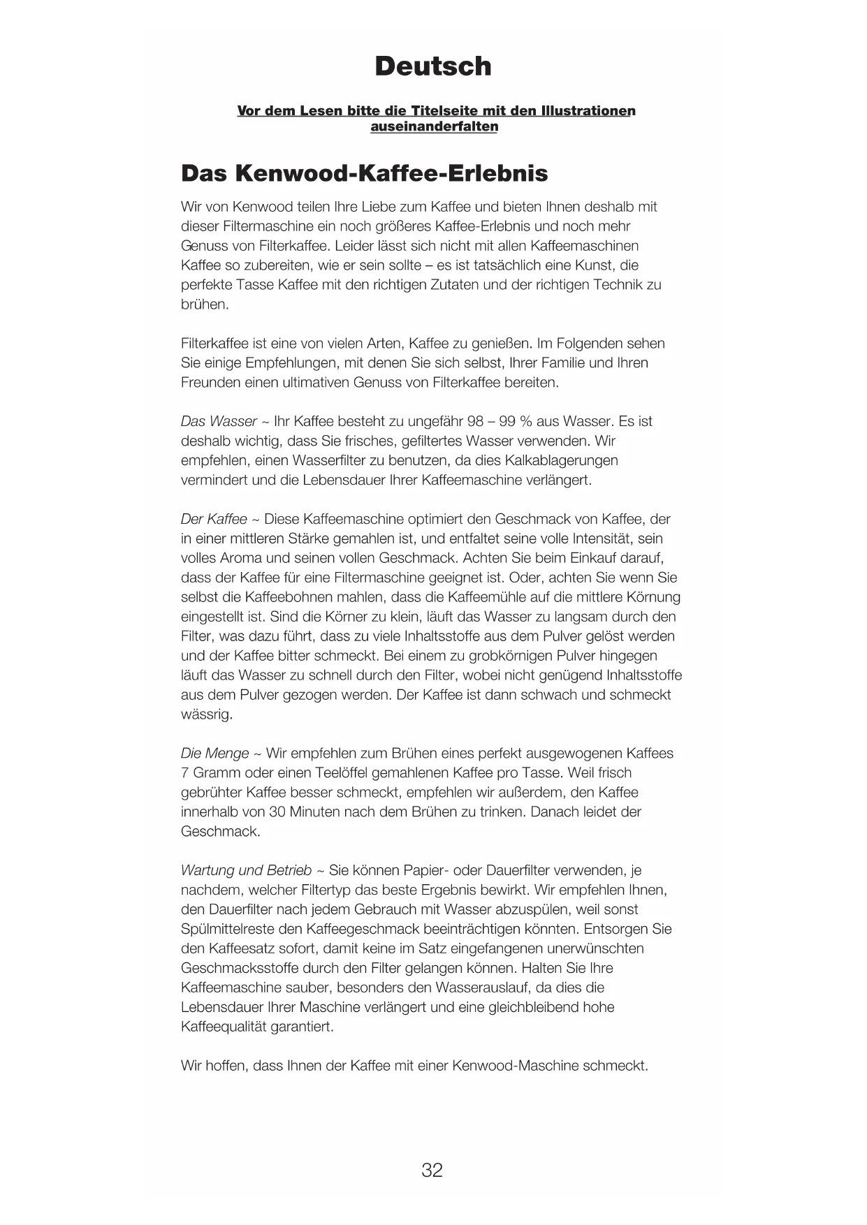 enuss von Filterkaffee. Leider lässt sich nicht mit allen Kaffeemaschinen Kaffee so zubereiten, wie er sein sollte – es ist tatsächlich eine Kunst, die perfekte Tasse Kaffee mit den richtigen Zutaten und der richtigen Technik zu brühen. Filterkaffee ist eine von vielen Arten, Kaffee zu genießen. Im Folgenden sehen Sie einige Empfehlungen, mit denen Sie sich selbst, Ihrer Familie und Ihren Freunden einen ultimativen Genuss von Filterkaffee bereiten. Das Wasser ~ Ihr Kaffee besteht zu ungefähr 98 – 99 % aus Wasser. Es ist deshalb wichtig, dass Sie frisches, gefiltertes Wasser verwenden. Wir empfehlen, einen Wasserfilter zu benutzen, da dies Kalkablagerungen vermindert und die Lebensdauer Ihrer Kaffeemaschine verlängert. Der Kaffee ~ Diese Kaffeemaschine optimiert den Geschmack von Kaffee, der in einer mittleren Stärke gemahlen ist, und entfaltet seine volle Intensität, sein volles Aroma und seinen vollen Geschmack. Achten Sie beim Einkauf darauf, dass der Kaffee für eine Filtermaschine geeignet ist. Oder, achten Sie wenn Sie selbst die Kaffeebohnen mahlen, dass die Kaffeemühle auf die mittlere Körnung eingestellt ist. Sind die Körner zu klein, läuft das Wasser zu langsam durch den Filter, was dazu führt, dass zu viele Inhaltsstoffe aus dem Pulver gelöst werden und der Kaffee bitter schmeckt. Bei einem zu grobkörnigen Pulver hingegen läuft das Wasser zu schnell durch den Filter, wobei nicht genügend Inhaltsstoffe aus dem Pulver gezogen werden. Der Kaffee ist dann schwach und schmeckt wässrig. Die Menge ~ Wir empfehlen zum Brühen eines perfekt ausgewogenen Kaffees 7 Gramm oder einen Teelöffel gemahlenen Kaffee pro Tasse. Weil frisch gebrühter Kaffee besser schmeckt, empfehlen wir außerdem, den Kaffee innerhalb von 30 Minuten nach dem Brühen zu trinken. Danach leidet der Geschmack. Wartung und Betrieb ~ Sie können Papier- oder Dauerfilter verwenden, je nachdem, welcher Filtertyp das beste Ergebnis bewirkt. Wir empfehlen Ihnen, den Dauerfilter nach jedem Gebrauch mit Wasser abzuspülen, weil sonst Spülmittelreste den Kaffeegeschmack beeinträchtigen könnten. Entsorgen Sie den Kaffeesatz sofort, damit keine im Satz eingefangenen unerwünschten Geschmacksstoffe durch den Filter gelangen können. Halten Sie Ihre Kaffeemaschine sauber, besonders den Wasserauslauf, da dies die Lebensdauer Ihrer Maschine verlängert und eine gleichbleibend hohe Kaffeequalität garantiert. Wir hoffen, dass Ihnen der Kaffee mit einer Kenwood-Maschine schmeckt. Deutsch