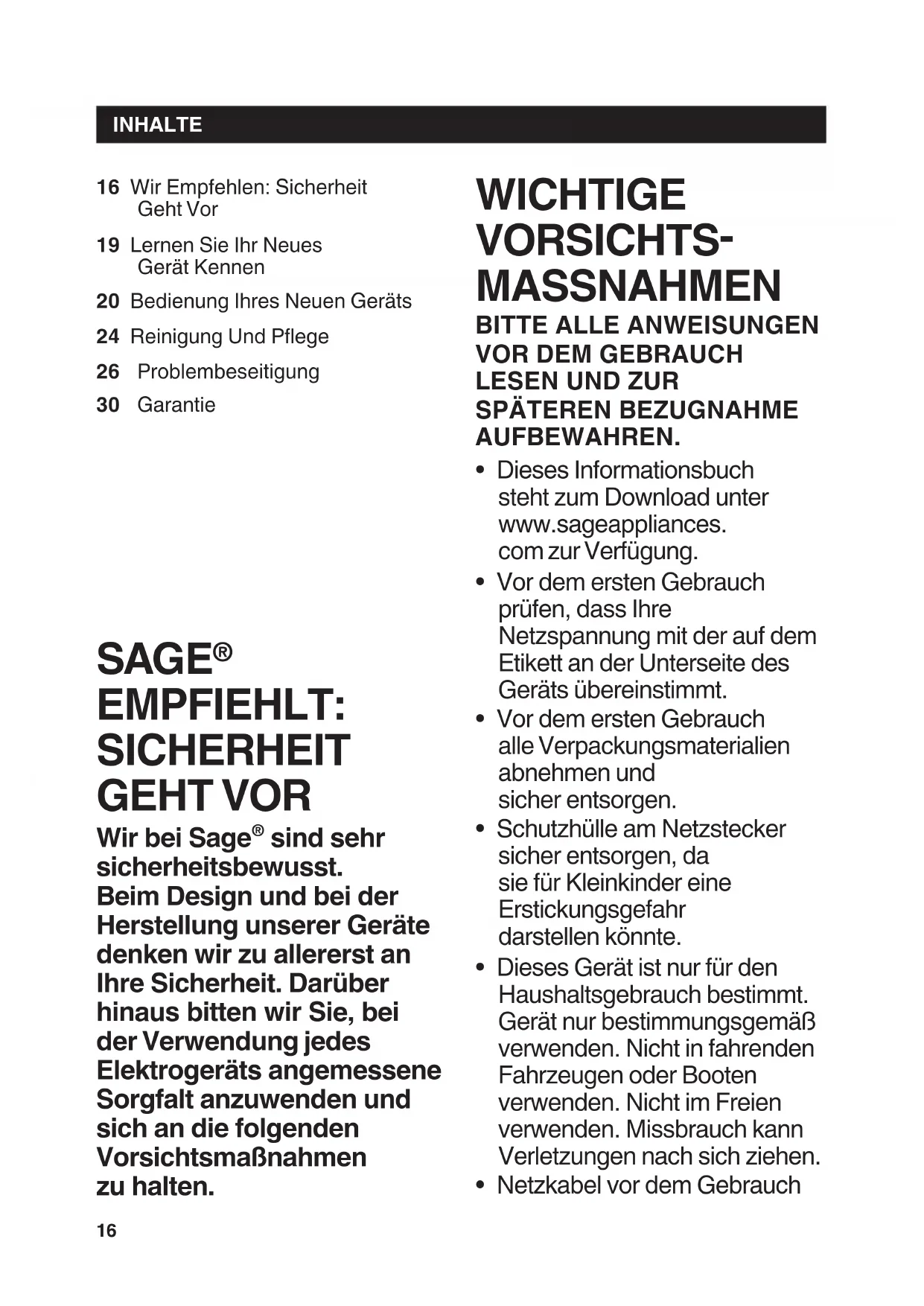 - Dieses Informationsbuch steht zum Download unter www.sageappliances. com zur Verfügung.