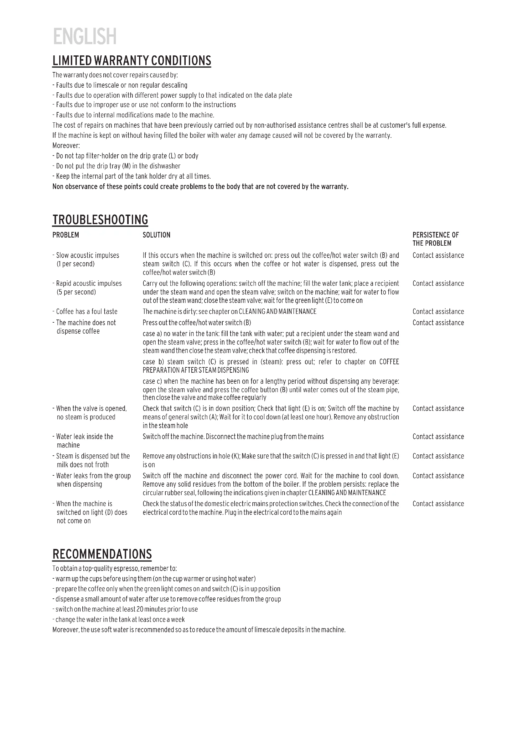 - Langsame akustische Impulse (1 pro Sekunde) - Schnelle akustische Impulse (5 pro Sekunde) - Der Kaffee hat einen schlechten Geschmack - Die Maschine bereitet keinen Kaffee zu - Das Dampfventil ist offen aber die Maschine erzeugt keinen Dampf - Im Inneren der Maschine läuft Wasser aus - Der Dampf tritt aus, aber die Milch schäumt nicht auf - Wasserauslauf während dem Kaffee-Bezug - Die Maschine ist eingeschaltet, aber die Lampe (D) leuchtet nicht auf STÖRUNG Sich mit der Service-Stelle in Verbindung setzen Sich mit der Service-Stelle in Verbindung setzen Sich mit der Service-Stelle in Verbindung setzen Sich mit der Service-Stelle in Verbindung setzen Sich mit der Service-Stelle in Verbindung setzen Sich mit der Service-Stelle in Verbindung setzen Sich mit der Service-Stelle in Verbindung setzen Sich mit der Service-Stelle in Verbindung setzen Sich mit der Service-Stelle in Verbindung setzen WEITERBESTEHEN DER STÖRUNG HINWEISE Um einen Espresso von hoher Qualität zuzubereiten nicht vergessen: - Vor der Verwendung die Tassen vorzuwärmen (auf dem Tassenwärmer oder mit Heißwasser) - den Kaffee erst wenn die grüne Lampe aufleuchtet und der Schalter (C) nach oben geschaltet ist zuzubereiten - nach jeder Verwendung eine kleine Menge Wasser beziehen, um Kaffeereste zu entfernen - die Maschine mindestens 20 Minuten vor der Verwendung einschalten - Das Wasser des Wassertanks mindestens ein Mal in der Woche wechseln. Man empfehlt Wasser mit niedrigem Kalkinhalt zu verwenden, um Kalkablagerungen im Inneren der Maschine zu vermeiden.ESPAÑOLESPAÑOL