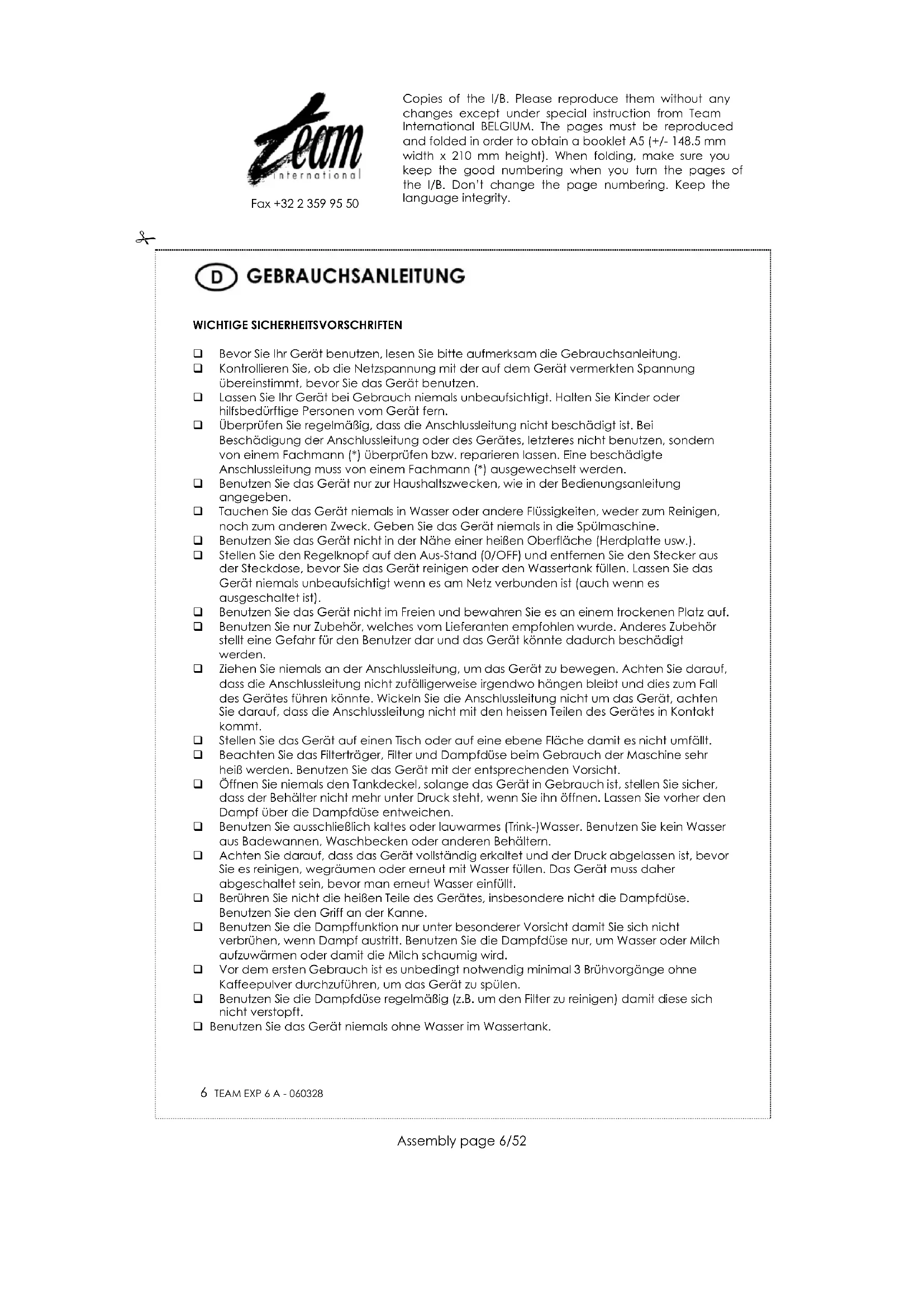 WICHTIGE SICHERHEITSVORSCHRIFTEN Bevor Sie Ihr Gerät benutzen, lesen Sie bitte aufmerksam die Gebrauchsanleitung. Kontrollieren Sie, ob die Netzspannung mit der auf dem Gerät vermerkten Spannung übereinstimmt, bevor Sie das Gerät benutzen. Lassen Sie Ihr Gerät bei Gebrauch niemals unbeaufsichtigt. Halten Sie Kinder oder hilfsbedürftige Personen vom Gerät fern. Überprüfen Sie regelmäßig, dass die Anschlussleitung nicht beschädigt ist. Bei Beschädigung der Anschlussleitung oder des Gerätes, letzteres nicht benutzen, sondern von einem Fachmann (*) überprüfen bzw. reparieren lassen. Eine beschädigte Anschlussleitung muss von einem Fachmann (*) ausgewechselt werden. Benutzen Sie das Gerät nur zur Haushaltszwecken, wie in der Bedienungsanleitung angegeben. Tauchen Sie das Gerät niemals in Wasser oder andere Flüssigkeiten, weder zum Reinigen, noch zum anderen Zweck. Geben Sie das Gerät niemals in die Spülmaschine. Benutzen Sie das Gerät nicht in der Nähe einer heißen Oberfläche (Herdplatte usw.). Stellen Sie den Regelknopf auf den Aus-Stand (0/OFF) und entfernen Sie den Stecker aus der Steckdose, bevor Sie das Gerät reinigen oder den Wassertank füllen. Lassen Sie das Gerät niemals unbeaufsichtigt wenn es am Netz verbunden ist (auch wenn es ausgeschaltet ist). Benutzen Sie das Gerät nicht im Freien und bewahren Sie es an einem trockenen Platz auf. Benutzen Sie nur Zubehör, welches vom Lieferanten empfohlen wurde. Anderes Zubehör stellt eine Gefahr für den Benutzer dar und das Gerät könnte dadurch beschädigt werden. Ziehen Sie niemals an der Anschlussleitung, um das Gerät zu bewegen. Achten Sie darauf, dass die Anschlussleitung nicht zufälligerweise irgendwo hängen bleibt und dies zum Fall des Gerätes führen könnte. Wickeln Sie die Anschlussleitung nicht um das Gerät, achten Sie darauf, dass die Anschlussleitung nicht mit den heissen Teilen des Gerätes in Kontakt kommt. Stellen Sie das Gerät auf einen Tisch oder auf eine ebene Fläche damit es nicht umfällt. Beachten Sie das Filterträger, Filter und Dampfdüse beim Gebrauch der Maschine sehr heiß werden. Benutzen Sie das Gerät mit der entsprechenden Vorsicht. Öffnen Sie niemals den Tankdeckel, solange das Gerät in Gebrauch ist, stellen Sie sicher, dass der Behälter nicht mehr unter Druck steht, wenn Sie ihn öffnen. Lassen Sie vorher den Dampf über die Dampfdüse entweichen. Benutzen Sie ausschließlich kaltes oder lauwarmes (Trink-)Wasser. Benutzen Sie kein Wasser aus Badewannen, Waschbecken oder anderen Behältern. Achten Sie darauf, dass das Gerät vollständig erkaltet und der Druck abgelassen ist, bevor Sie es reinigen, wegräumen oder erneut mit Wasser füllen. Das Gerät muss daher abgeschaltet sein, bevor man erneut Wasser einfüllt. Berühren Sie nicht die heißen Teile des Gerätes, insbesondere nicht die Dampfdüse. Benutzen Sie den Griff an der Kanne. Benutzen Sie die Dampffunktion nur unter besonderer Vorsicht damit Sie sich nicht verbrühen, wenn Dampf austritt. Benutzen Sie die Dampfdüse nur, um Wasser oder Milch aufzuwärmen oder damit die Milch schaumig wird. Vor dem ersten Gebrauch ist es unbedingt notwendig minimal 3 Brühvorgänge ohne Kaffeepulver durchzuführen, um das Gerät zu spülen. Benutzen Sie die Dampfdüse regelmäßig (z.B. um den Filter zu reinigen) damit diese sich nicht verstopft. Benutzen Sie das Gerät niemals ohne Wasser im Wassertank. Copies of the I/B. Please reproduce them without any changes except under special instruction from Team International BELGIUM. The pages must be reproduced and folded in order to obtain a booklet A5 (+/- 148.5 mm width x 210 mm height). When folding, make sure you keep the good numbering when you turn the pages of the I/B. Don’t change the page numbering. Keep the language integrity.