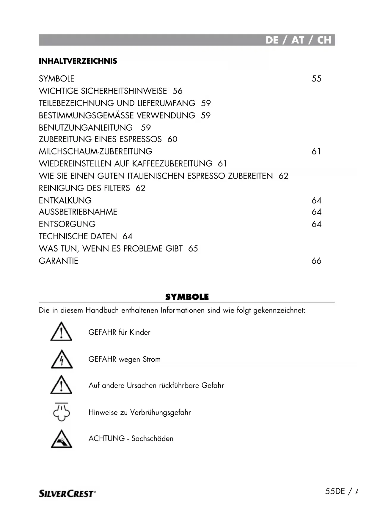 ..............................................................IT DE / AT / CH 55DE / AT / CH SYMBOLE Die in diesem Handbuch enthaltenen Informationen sind wie folgt gekennzeichnet: GEFAHR für Kinder GEFAHR wegen Strom Auf andere Ursachen rückführbare Gefahr Hinweise zu Verbrühungsgefahr ACHTUNG - Sachschäden SYMBOLE 55 WICHTIGE SICHERHEITSHINWEISE 56