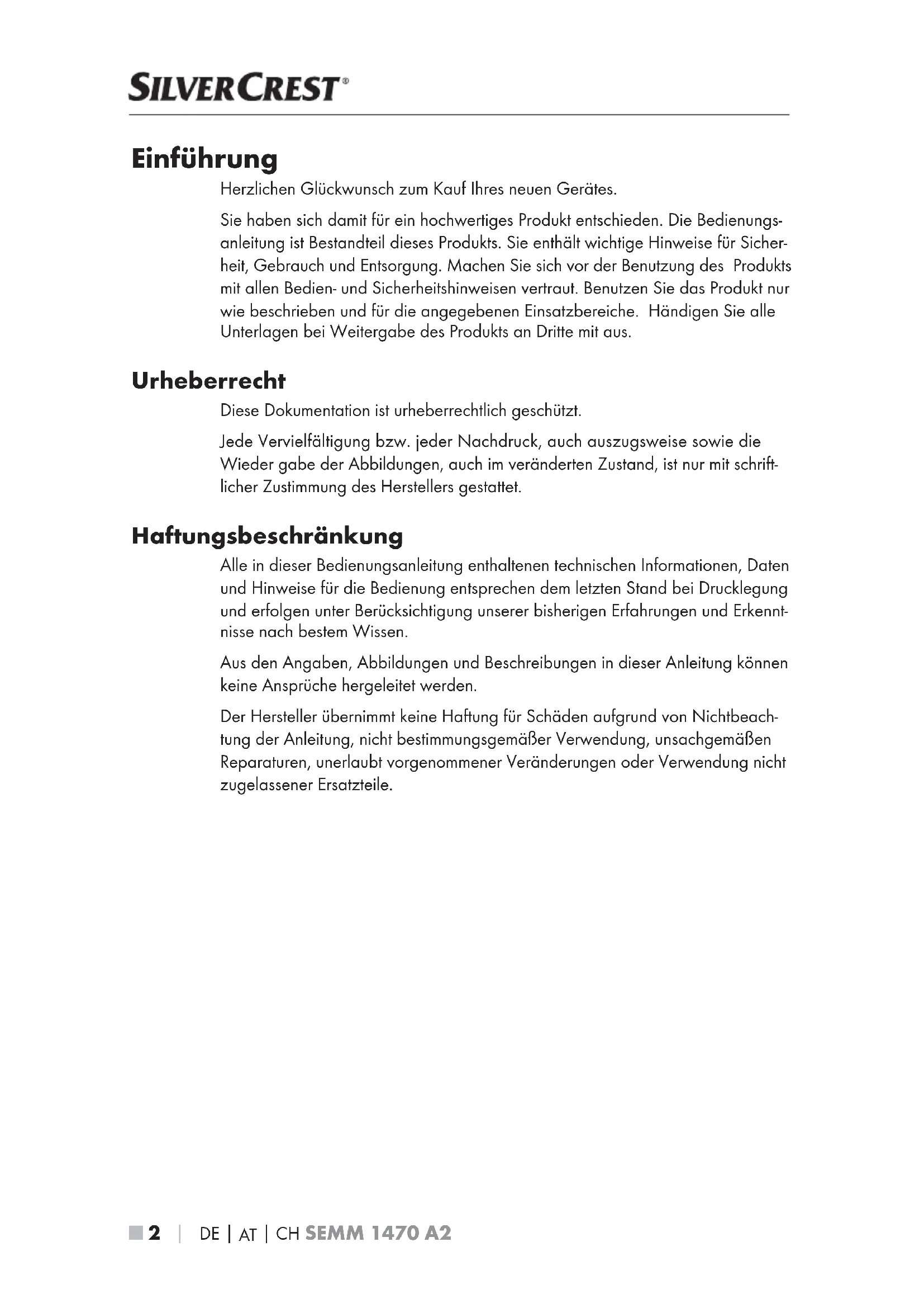 Einführung Herzlichen Glückwunsch zum Kauf Ihres neuen Gerätes. Sie haben sich damit für ein hochwertiges Produkt entschieden. Die Bedienungs- anleitung ist Bestandteil dieses Produkts. Sie enthält wichtige Hinweise für Sicher- heit, Gebrauch und Entsorgung. Machen Sie sich vor der Benutzung des Produkts mit allen Bedien- und Sicherheitshinweisen vertraut. Benutzen Sie das Produkt nur wie beschrieben und für die angegebenen Einsatzbereiche. Händigen Sie alle Unterlagen bei Weitergabe des Produkts an Dritte mit aus. Urheberrecht Diese Dokumentation ist urheberrechtlich geschützt. Jede Vervielfältigung bzw. jeder Nachdruck, auch auszugsweise sowie die Wieder gabe der Abbildungen, auch im veränderten Zustand, ist nur mit schrift- licher Zustimmung des Herstellers gestattet. Haftungsbeschränkung Alle in dieser Bedienungsanleitung enthaltenen technischen Informationen, Daten und Hinweise für die Bedienung entsprechen dem letzten Stand bei Drucklegung und erfolgen unter Berücksichtigung unserer bisherigen Erfahrungen und Erkennt- nisse nach bestem Wissen. Aus den Angaben, Abbildungen und Beschreibungen in dieser Anleitung können keine Ansprüche hergeleitet werden. Der Hersteller übernimmt keine Haftung für Schäden aufgrund von Nichtbeach- tung der Anleitung, nicht bestimmungsgemäßer Verwendung, unsachgemäßen Reparaturen, unerlaubt vorgenommener Veränderungen oder Verwendung nicht zugelassener Ersatzteile. IB_341821_SEMM1470A2_LB8.indb 2 05.05.2020 15:08:56DE