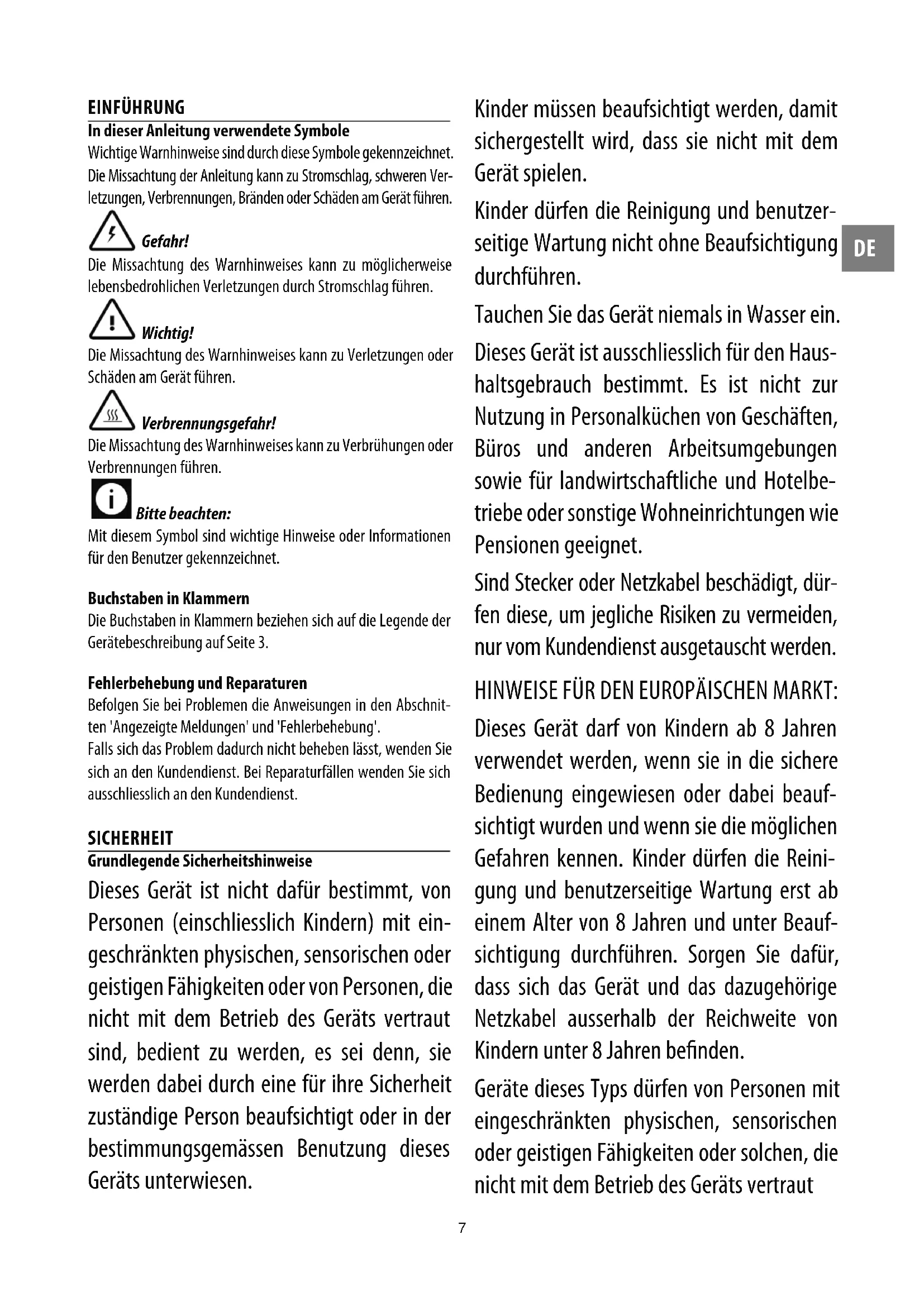 EINFÜHRUNG In dieser Anleitung verwendete Symbole Wichtige Warnhinweise sind durch diese Symbole gekennzeichnet. Die Missachtung der Anleitung kann zu Stromschlag, schweren Ver- letzungen, Verbrennungen, Bränden oder Schäden am Gerät führen. Gefahr! Die Missachtung des Warnhinweises kann zu möglicherweise lebensbedrohlichen Verletzungen durch Stromschlag führen. Wichtig! Die Missachtung des Warnhinweises kann zu Verletzungen oder Schäden am Gerät führen. Verbrennungsgefahr! Die Missachtung des Warnhinweises kann zu Verbrühungen oder Verbrennungen führen. Bitte beachten: Mit diesem Symbol sind wichtige Hinweise oder Informationen für den Benutzer gekennzeichnet. Buchstaben in Klammern Die Buchstaben in Klammern beziehen sich auf die Legende der Gerätebeschreibung auf Seite 3. Fehlerbehebung und Reparaturen Befolgen Sie bei Problemen die Anweisungen in den Abschnit- ten 'Angezeigte Meldungen' und 'Fehlerbehebung'. Falls sich das Problem dadurch nicht beheben lässt, wenden Sie sich an den Kundendienst. Bei Reparaturfällen wenden Sie sich ausschliesslich an den Kundendienst. SICHERHEIT Grundlegende Sicherheitshinweise Dieses Gerät ist nicht dafür bestimmt, von Personen (einschliesslich Kindern) mit ein- geschränkten physischen, sensorischen oder geistigen Fähigkeiten oder von Personen, die nicht mit dem Betrieb des Geräts vertraut sind, bedient zu werden, es sei denn, sie werden dabei durch eine für ihre Sicherheit zuständige Person beaufsichtigt oder in der bestimmungsgemässen Benutzung dieses Geräts unterwiesen. Kinder müssen beaufsichtigt werden, damit sichergestellt wird, dass sie nicht mit dem Gerät spielen. Kinder dürfen die Reinigung und benutzer- seitige Wartung nicht ohne Beaufsichtigung durchführen. Tauchen Sie das Gerät niemals in Wasser ein. Dieses Gerät ist ausschliesslich für den Haus- haltsgebrauch bestimmt. Es ist nicht zur Nutzung in Personalküchen von Geschäften, Büros und anderen Arbeitsumgebungen sowie für landwirtschaftliche und Hotelbe- triebe oder sonstige Wohneinrichtungen wie Pensionen geeignet. Sind Stecker oder Netzkabel beschädigt, dür- fen diese, um jegliche Risiken zu vermeiden, nur vom Kundendienst ausgetauscht werden. HINWEISE FÜR DEN EUROPÄISCHEN MARKT: Dieses Gerät darf von Kindern ab 8 Jahren verwendet werden, wenn sie in die sichere Bedienung eingewiesen oder dabei beauf- sichtigt wurden und wenn sie die möglichen Gefahren kennen. Kinder dürfen die Reini- gung und benutzerseitige Wartung erst ab einem Alter von 8 Jahren und unter Beauf- sichtigung durchführen. Sorgen Sie dafür, dass sich das Gerät und das dazugehörige Netzkabel ausserhalb der Reichweite von Kindern unter 8 Jahren benden. Geräte dieses Typs dürfen von Personen mit eingeschränkten physischen, sensorischen oder geistigen Fähigkeiten oder solchen, die nicht mit dem Betrieb des Geräts vertraut8 sind, bedient werden, wenn sie in die sichere Bedienung eingewiesen oder dabei beauf- sichtigt wurden und wenn sie die möglichen Gefahren kennen. Kinder dürfen nicht mit dem Gerät spielen. Ziehen Sie bei Nichtverwendung des Geräts und vor der Reinigung immer den Netzste- cker aus der Steckdose. Mit diesem Symbol gekennzeichnete Oberächen werden bei der Verwendung heiss (das Symbol wird nur bei bestimmten Modellen angezeigt). Gefahr! Das Gerät wird mit elektrischem Strom betrie- ben. Halten Sie sich daher an folgende Sicherheitshinweise: