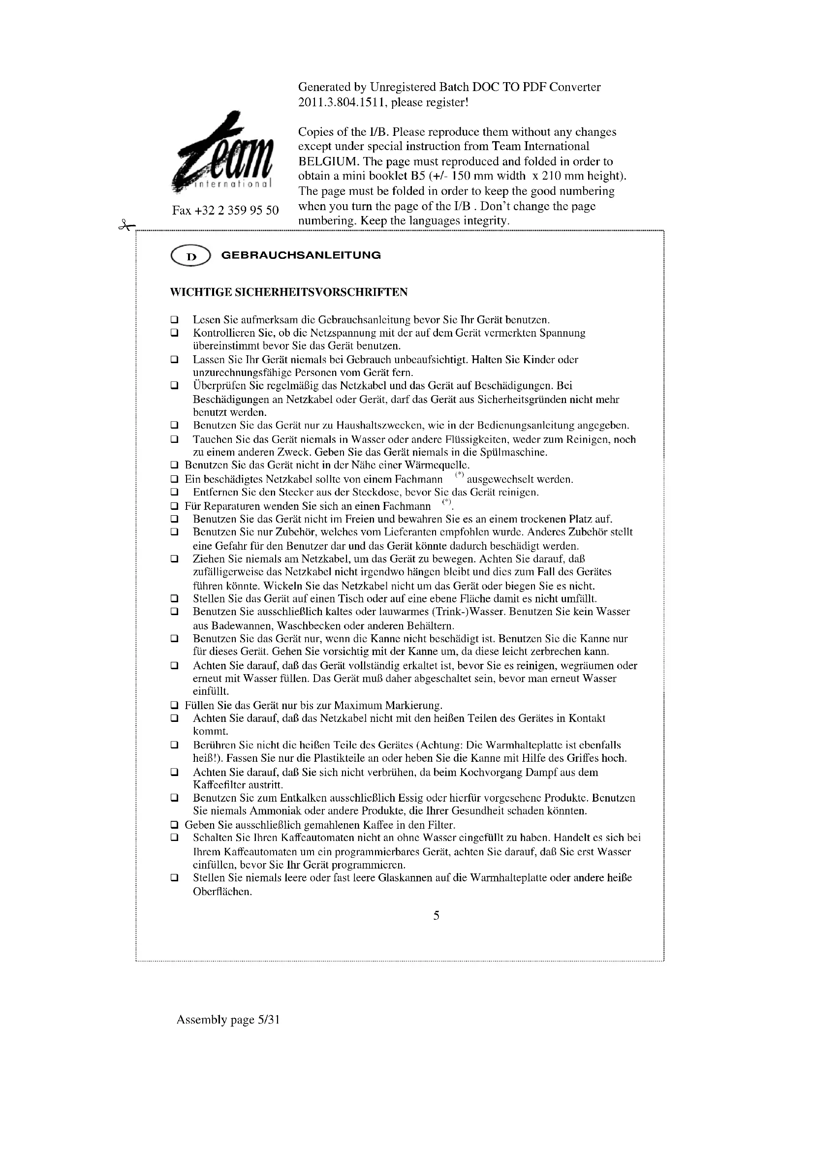 Benutzen Sie das Gerät nicht im Freien und bewahren Sie es an einem trockenen Platz auf. Benutzen Sie nur Zubehör, welches vom Lieferanten empfohlen wurde. Anderes Zubehör stellt eine Gefahr für den Benutzer dar und das Gerät könnte dadurch beschädigt werden. Ziehen Sie niemals am Netzkabel, um das Gerät zu bewegen. Achten Sie darauf, daß zufälligerweise das Netzkabel nicht irgendwo hängen bleibt und dies zum Fall des Gerätes führen könnte. Wickeln Sie das Netzkabel nicht um das Gerät oder biegen Sie es nicht. Stellen Sie das Gerät auf einen Tisch oder auf eine ebene Fläche damit es nicht umfällt. Benutzen Sie ausschließlich kaltes oder lauwarmes (Trink-)Wasser. Benutzen Sie kein Wasser aus Badewannen, Waschbecken oder anderen Behältern. Benutzen Sie das Gerät nur, wenn die Kanne nicht beschädigt ist. Benutzen Sie die Kanne nur für dieses Gerät. Gehen Sie vorsichtig mit der Kanne um, da diese leicht zerbrechen kann. Achten Sie darauf, daß das Gerät vollständig erkaltet ist, bevor Sie es reinigen, wegräumen oder erneut mit Wasser füllen. Das Gerät muß daher abgeschaltet sein, bevor man erneut Wasser einfüllt. Füllen Sie das Gerät nur bis zur Maximum Markierung. Achten Sie darauf, daß das Netzkabel nicht mit den heißen Teilen des Gerätes in Kontakt kommt. Berühren Sie nicht die heißen Teile des Gerätes (Achtung: Die Warmhalteplatte ist ebenfalls heiß!). Fassen Sie nur die Plastikteile an oder heben Sie die Kanne mit Hilfe des Griffes hoch. Achten Sie darauf, daß Sie sich nicht verbrühen, da beim Kochvorgang Dampf aus dem Kaffeefilter austritt. Benutzen Sie zum Entkalken ausschließlich Essig oder hierfür vorgesehene Produkte. Benutzen Sie niemals Ammoniak oder andere Produkte, die Ihrer Gesundheit schaden könnten. Geben Sie ausschließlich gemahlenen Kaffee in den Filter. Schalten Sie Ihren Kaffeautomaten nicht an ohne Wasser eingefüllt zu haben. Handelt es sich bei Ihrem Kaffeautomaten um ein programmierbares Gerät, achten Sie darauf, daß Sie erst Wasser einfüllen, bevor Sie Ihr Gerät programmieren. Stellen Sie niemals leere oder fast leere Glaskannen auf die Warmhalteplatte oder andere heiße Oberflächen.Generated by Unregistered Batch DOC TO PDF Converter 2011.3.804.1511, please register! Copies of the I/B. Please reproduce them without any changes except under special instruction from Team International BELGIUM. The page must reproduced and folded in order to obtain a mini booklet B5 (+/- 150 mm width x 210 mm height). The page must be folded in order to keep the good numbering when you turn the page of the I/B . Don’t change the page numbering. Keep the languages integrity.