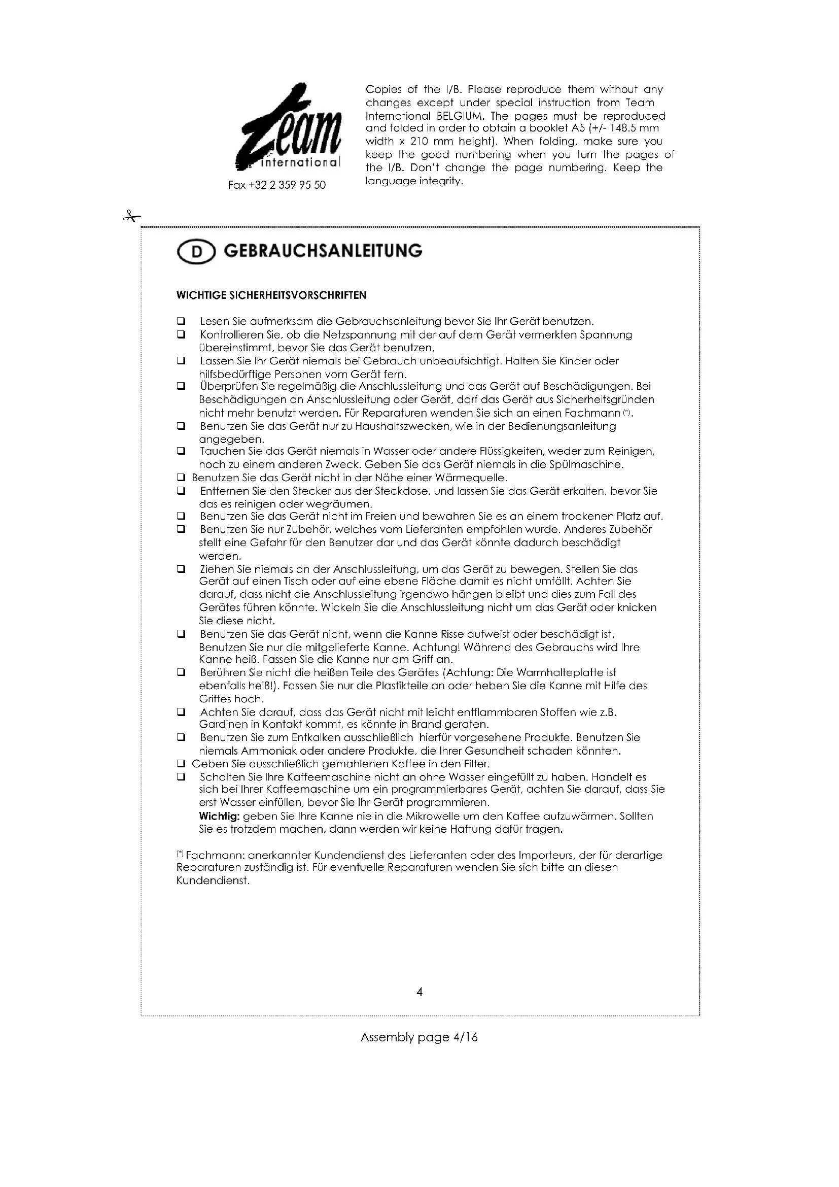 Zur Verlängerung der Lebensdauer des Gerätes empfehlen wir Ihnen, das Gerät regelmäßig zu entkalken. Die Häufigkeit der Entkalkung hängt von der Härte des Wassers ab. Verwenden Sie hierzu nur handelsübliche Entkalkungsmittel und beachten Sie die entsprechenden Gebrauchsanweisungen. Die Pflege Ihres Kaffeeautomaten verlängert seine Lebensdauer, und der Ersatz eines verkalkten Heizelementes ist von der Garantie ausgeschlossen. Niemals Gerät und Zubehör in die Spülmaschine stellen. Reinigen Sie die Plastikteile mit einem leicht feuchten Tuch. Der Filterhalter Ihrer Kaffeemaschine ist abnehmbar. Damit können Sie ihn leichter reinigen. Dafür ziehen Sie ihn nach oben. Um die Warmhalteplatte zu reinigen, benutzen Sie keine harten oder schleifende Gegenstände, um die Beschichtung nicht zu beschädigen. Reinigen Sie Ihre Glaskanne mit einem üblichen Reinigungsmittel und einem Schwamm und dann spülen Sie diese mit klarem Wasser ab. Copies of the I/B. Please reproduce them without any changes except under special instruction from Team International BELGIUM. The pages must be reproduced and folded in order to obtain a booklet A5 (+/- 148.5 mm width x 210 mm height). When folding, make sure you keep the good numbering when you turn the pages of the I/B. Don’t change the page numbering. Keep the language integrity.
