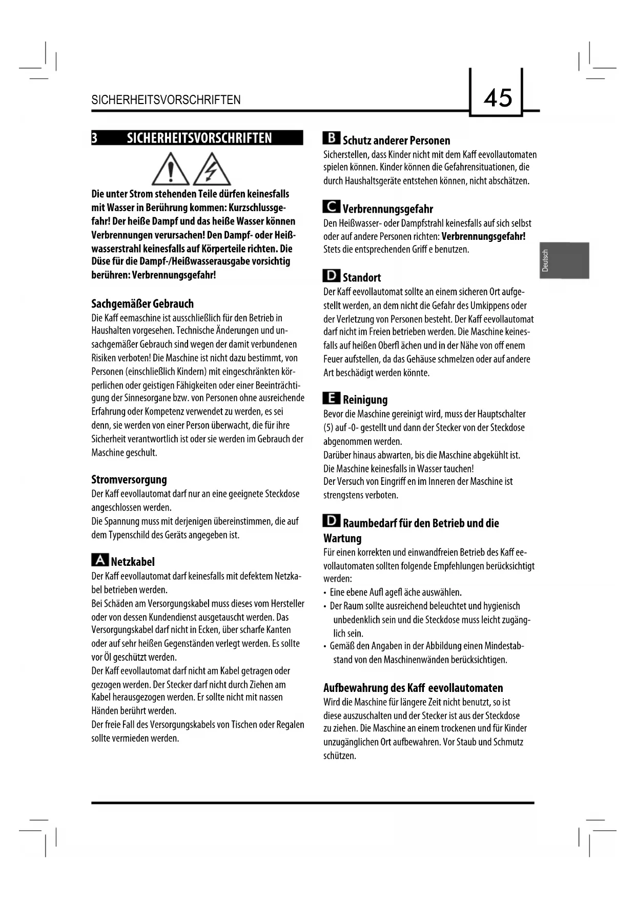 AUFBEWAHREN HINWEISE Dieser Kaffeevollautomat wurde ausschließlich für den Haushalt entwickelt. Sämtliche Eingriffe mit Ausnahme der Reinigung oder normalen Wartung dürfen ausschließlich durch den autorisierten Kundendienst vorgenommen werden. Das Gerät nicht in Wasser tauchen. Reparaturen dürfen nur durch Fachpersonal des autorisierten Kundendienstes erfolgen. 1 Sicherstellen, dass die auf dem Datenschild des Geräts angegebene Spannung mit der Ihres Netzanschlusses übereinstimmt. 2 Nie lauwarmes oder heißes Wasser in den Was- serbehälter füllen. Ausschließlich kaltes Wasser verwenden. 3 Während des Betriebs nie die heißen Teile oder das Netzkabel der Maschine berühren. 4 Keine Schleif- oder Scheuermittel zum Reinigen verwen- den. Es genügt ein weicher Lappen mit Wasser. 5 Zur Vermeidung von Kalkablagerungen kohlen- säurefreies Mineralwasser verwenden. BETRIEBSANLEITUNGEN ZUM NETZKABEL A Das mitgelieferte Netzkabel ist relativ kurz, damit es sich nicht verdrehen kann oder Sie darüber stolpern. B Längere Netzkabel können verwendet werden, doch sollte man dabei mit größter Vorsicht vorgehen. C Sollte ein längeres Netzkabel verwendet werden, folgendes überprüfen: 1 dass die auf der Verlängerungsschnur vermerk- te Spannung mindestens der des Elektrogerätes entspricht; 2 dass es einen Stecker mit drei Stiften (Erdung) hat, falls das Netzkabel des Elektrogerätes ebenfalls drei hat; 3 Das Netzkabel darf nicht am Tisch herunter- hängen; Sie könnten darüber stolpern.43 Deutsch
