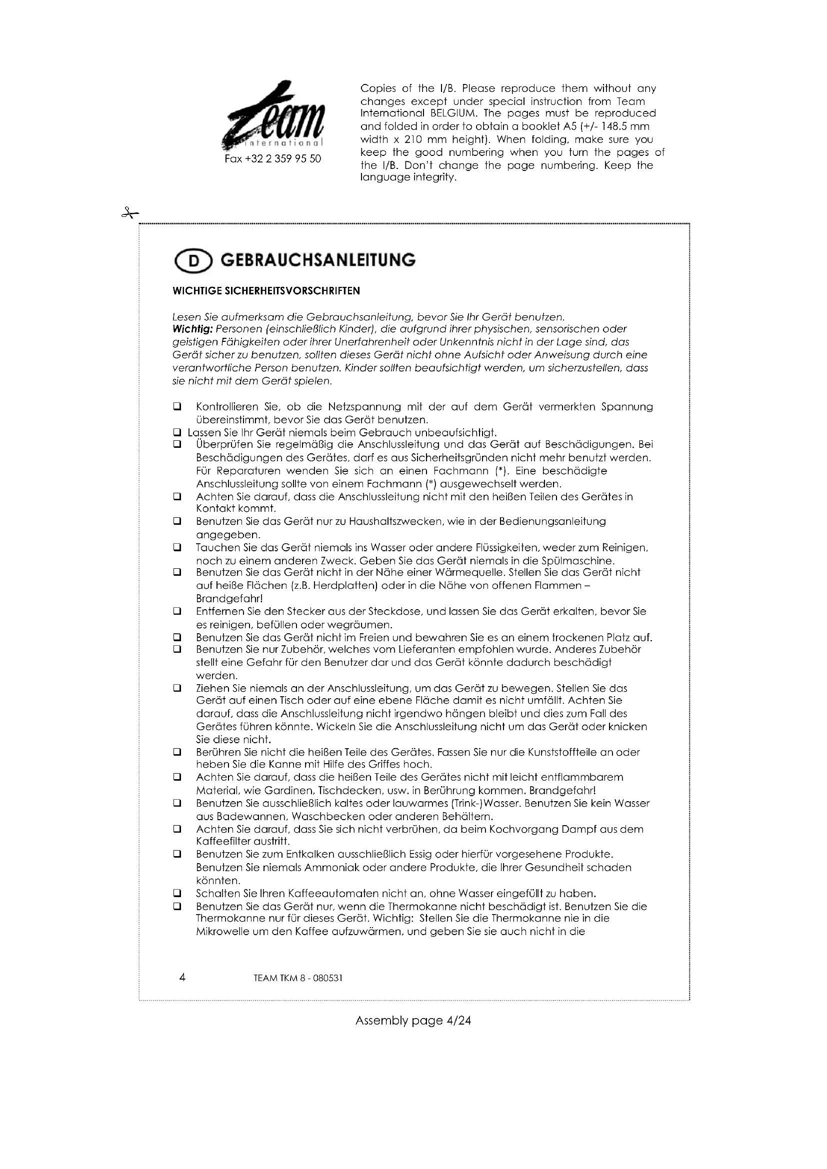 WICHTIGE SICHERHEITSVORSCHRIFTEN Lesen Sie aufmerksam die Gebrauchsanleitung, bevor Sie Ihr Gerät benutzen. Wichtig: Personen (einschließlich Kinder), die aufgrund ihrer physischen, sensorischen oder geistigen Fähigkeiten oder ihrer Unerfahrenheit oder Unkenntnis nicht in der Lage sind, das Gerät sicher zu benutzen, sollten dieses Gerät nicht ohne Aufsicht oder Anweisung durch eine verantwortliche Person benutzen. Kinder sollten beaufsichtigt werden, um sicherzustellen, dass sie nicht mit dem Gerät spielen. Kontrollieren Sie, ob die Netzspannung mit der auf dem Gerät vermerkten Spannung übereinstimmt, bevor Sie das Gerät benutzen. Lassen Sie Ihr Gerät niemals beim Gebrauch unbeaufsichtigt. Überprüfen Sie regelmäßig die Anschlussleitung und das Gerät auf Beschädigungen. Bei Beschädigungen des Gerätes, darf es aus Sicherheitsgründen nicht mehr benutzt werden. Für Reparaturen wenden Sie sich an einen Fachmann (*). Eine beschädigte Anschlussleitung sollte von einem Fachmann (*) ausgewechselt werden. Achten Sie darauf, dass die Anschlussleitung nicht mit den heißen Teilen des Gerätes in Kontakt kommt. Benutzen Sie das Gerät nur zu Haushaltszwecken, wie in der Bedienungsanleitung angegeben. Tauchen Sie das Gerät niemals ins Wasser oder andere Flüssigkeiten, weder zum Reinigen, noch zu einem anderen Zweck. Geben Sie das Gerät niemals in die Spülmaschine. Benutzen Sie das Gerät nicht in der Nähe einer Wärmequelle. Stellen Sie das Gerät nicht auf heiße Flächen (z.B. Herdplatten) oder in die Nähe von offenen Flammen – Brandgefahr! Entfernen Sie den Stecker aus der Steckdose, und lassen Sie das Gerät erkalten, bevor Sie es reinigen, befüllen oder wegräumen. Benutzen Sie das Gerät nicht im Freien und bewahren Sie es an einem trockenen Platz auf. Benutzen Sie nur Zubehör, welches vom Lieferanten empfohlen wurde. Anderes Zubehör stellt eine Gefahr für den Benutzer dar und das Gerät könnte dadurch beschädigt werden. Ziehen Sie niemals an der Anschlussleitung, um das Gerät zu bewegen. Stellen Sie das Gerät auf einen Tisch oder auf eine ebene Fläche damit es nicht umfällt. Achten Sie darauf, dass die Anschlussleitung nicht irgendwo hängen bleibt und dies zum Fall des Gerätes führen könnte. Wickeln Sie die Anschlussleitung nicht um das Gerät oder knicken Sie diese nicht. Berühren Sie nicht die heißen Teile des Gerätes. Fassen Sie nur die Kunststoffteile an oder heben Sie die Kanne mit Hilfe des Griffes hoch. Achten Sie darauf, dass die heißen Teile des Gerätes nicht mit leicht entflammbarem Material, wie Gardinen, Tischdecken, usw. in Berührung kommen. Brandgefahr! Benutzen Sie ausschließlich kaltes oder lauwarmes (Trink-)Wasser. Benutzen Sie kein Wasser aus Badewannen, Waschbecken oder anderen Behältern. Achten Sie darauf, dass Sie sich nicht verbrühen, da beim Kochvorgang Dampf aus dem Kaffeefilter austritt. Benutzen Sie zum Entkalken ausschließlich Essig oder hierfür vorgesehene Produkte. Benutzen Sie niemals Ammoniak oder andere Produkte, die Ihrer Gesundheit schaden könnten. Schalten Sie Ihren Kaffeeautomaten nicht an, ohne Wasser eingefüllt zu haben. Benutzen Sie das Gerät nur, wenn die Thermokanne nicht beschädigt ist. Benutzen Sie die Thermokanne nur für dieses Gerät. Wichtig: Stellen Sie die Thermokanne nie in die Mikrowelle um den Kaffee aufzuwärmen, und geben Sie sie auch nicht in die Copies of the I/B. Please reproduce them without any changes except under special instruction from Team International BELGIUM. The pages must be reproduced and folded in order to obtain a booklet A5 (+/- 148.5 mm width x 210 mm height). When folding, make sure you keep the good numbering when you turn the pages of the I/B. Don’t change the page numbering. Keep the language integrity.