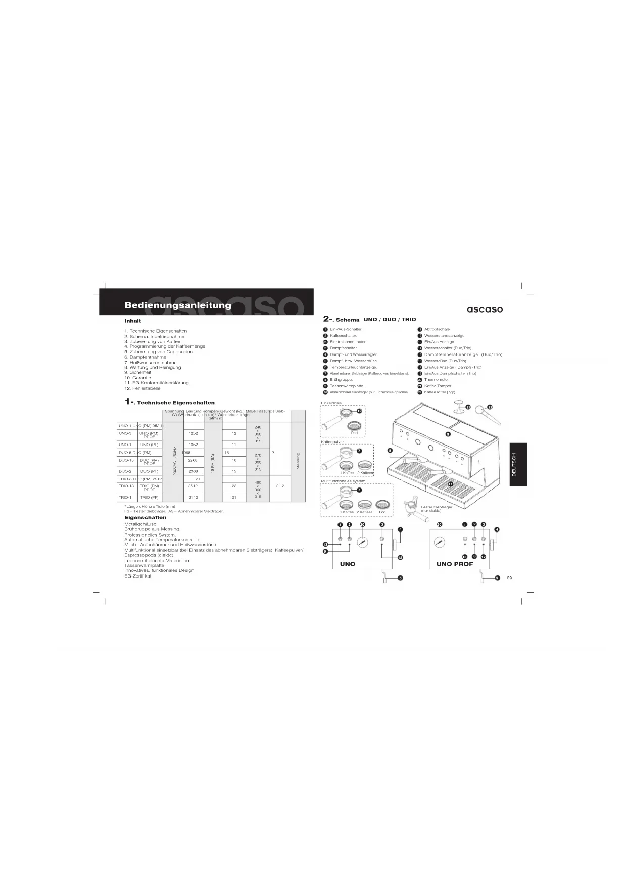 Spannung Leistung Pompen- Gewicht (kg.) Maße Fassungs Sieb-(V) (W) druck (l x h x p)* Wassertank träger(atm) (l)UNO-4 UNO (PM) 952 11UNO-3 UNO (PM) 1252 12 PROF UNO-1 UNO (PF) 1052 11DUO-5 DUO (PM) 1968 15 2DUO-15 DUO (PM) 2268 16 PROF