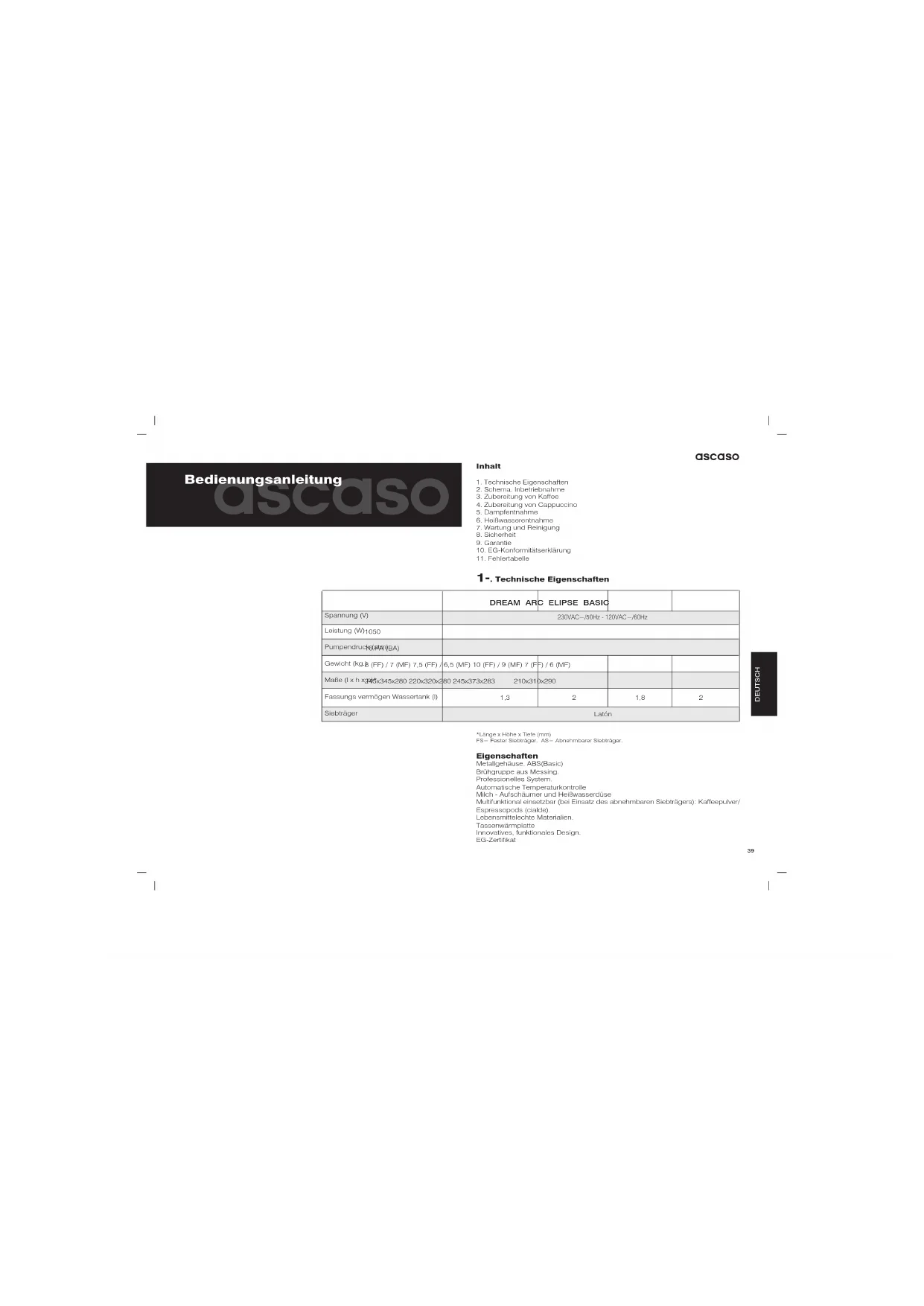 1-. Technische Eigenschaften *Länge x Höhe x Tiefe (mm)FS= Fester Siebträger. AS= Abnehmbarer Siebträger. Eigenschaften Metallgehäuse. ABS(Basic) Brühgruppe aus Messing. Professionelles System. Automatische Temperaturkontrolle Milch - Aufschäumer und Heißwasserdüse Multifunktional einsetzbar (bei Einsatz des abnehmbaren Siebträgers): Kaffeepulver/ Espressopods (cialde). Lebensmittelechte Materialien. Tassenwärmplatte Innovatives, funktionales Design. EG-Zertifikat ascaso ascaso Bedienungsanleitung