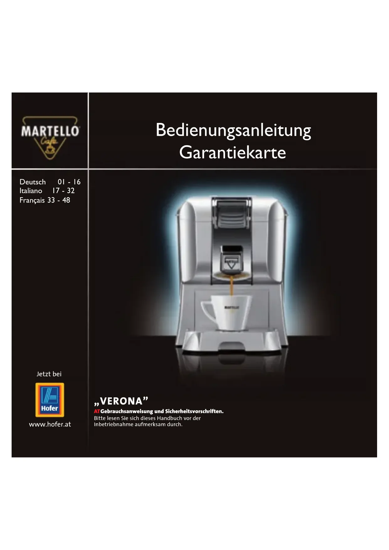 Bedienungsanleitung Garantiekarte Jetzt bei www.hofer.at „VERONA” AT Gebrauchsanweisung und Sicherheitsvorschriften. Bitte lesen Sie sich dieses Handbuch vor der Inbetriebnahme aufmerksam durch. Deutsch 01 - 16 Italiano 17 - 32 Français 33 - 48 Hofer_Verona_silber_TA_Bedanleitung_Garantiekarte__ATDE_2011-05-18_Layout 1 09.09.11 15:23 Seite 1Das vorliegende Handbuch muss aufmerksam gelesen werden, da es wichtige Hinweise für Sicherheit, Gebrauch und Wartung Ihres Gerätes enthält. Bewahren Sie es sorgfältig auf! Bei Nichtbeachtung der Sicherheitsanweisungen übernimmt MARTELLO keine Verantwortung.