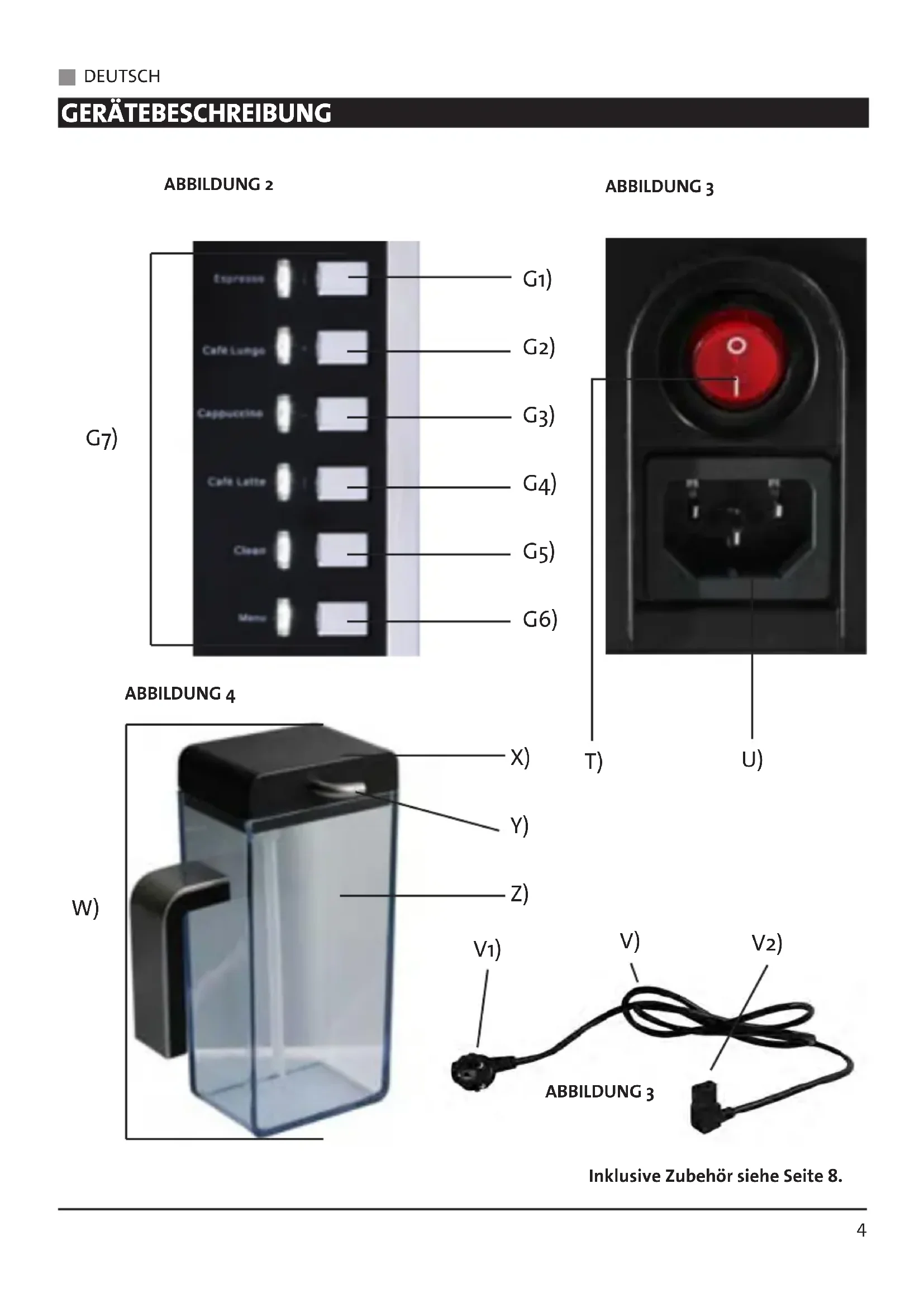 ABBILDUNG 2 ABBILDUNG 4 ABBILDUNG 3 ABBILDUNG 3 Inklusive Zubehör siehe Seite 8. Martello_Raffinato_2012-08-03_Layout 1 13.08.12 19:25 Seite 4DEUTSCH g GERÄTEBESCHREIBUNG ABBILDUNG 1 A. . . . Griff B . . . . Klappe C . . . . Kapselschieber D. . . . Wassertank Deckel E . . . . Wassertank F . . . . Display G. . . . Bedienfeld H. . . . höhenverstellbare Tassenabstellfläche I . . . . Kapseleinschuböffnung J . . . . Tassenwärmer K . . . . Düsenhalterungsstift L . . . . Düsenabdeckungsgriff M . . . Düsenabdeckung N. . . . Milchanschlussöffnung O. . . . Milchdüse P . . . . Cafè-Düse Q. . . . Herausnehmbarer Kapselbehälter R . . . . Abtropfgitter S . . . . Tropfwanne ABBILDUNG 2 G 1. . . ESPRESSO-Taste (↓) G 2 . . CAFÈ LUNGO-Taste (+) G 3 . . CAPPUCCINO-Taste (-) G 4 . . CAFÈ LATTE -Taste (↑) G 5 . . CLEAN-Taste G 6 . . MENU-Taste G 7 . . Kontrollleuchten ABBILDUNG 3 T . . . . EIN-/AUS-Schalter U . . . . Stromversorgungsbuchse V . . . . Netzkabel V1 . . . Netzkabelstecker V2 . . . Netzkabel Steckdose ABBILDUNG 4 W . . . Milchbehälter X . . . . Milchtankdeckel Y . . . . Rohr Z . . . . Milchtank