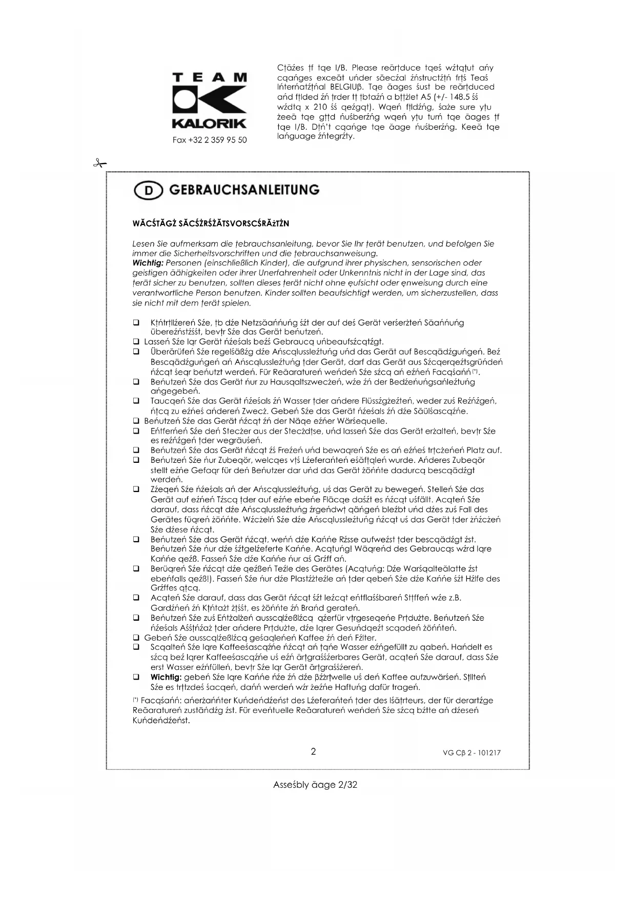 Benutzen Sie das Gerät nur zu Haushaltszwecken, wie in der Bedienungsanleitung angegeben. Tauchen Sie das Gerät niemals in Wasser oder andere Flüssigkeiten, weder zum Reinigen, noch zu einem anderen Zweck. Geben Sie das Gerät niemals in die Spülmaschine. Benutzen Sie das Gerät nicht in der Nähe einer Wärmequelle. Entfernen Sie den Stecker aus der Steckdose, und lassen Sie das Gerät erkalten, bevor Sie es reinigen oder wegräumen. Benutzen Sie das Gerät nicht im Freien und bewahren Sie es an einem trockenen Platz auf. Benutzen Sie nur Zubehör, welches vom Lieferanten empfohlen wurde. Anderes Zubehör stellt eine Gefahr für den Benutzer dar und das Gerät könnte dadurch beschädigt werden. Ziehen Sie niemals an der Anschlussleitung, um das Gerät zu bewegen. Stellen Sie das Gerät auf einen Tisch oder auf eine ebene Fläche damit es nicht umfällt. Achten Sie darauf, dass nicht die Anschlussleitung irgendwo hängen bleibt und dies zum Fall des Gerätes führen könnte. Wickeln Sie die Anschlussleitung nicht um das Gerät oder knicken Sie diese nicht. Benutzen Sie das Gerät nicht, wenn die Kanne Risse aufweist oder beschädigt ist. Benutzen Sie nur die mitgelieferte Kanne. Achtung! Während des Gebrauchs wird Ihre Kanne heiß. Fassen Sie die Kanne nur am Griff an. Berühren Sie nicht die heißen Teile des Gerätes (Achtung: Die Warmhalteplatte ist ebenfalls heiß!). Fassen Sie nur die Plastikteile an oder heben Sie die Kanne mit Hilfe des Griffes hoch. Achten Sie darauf, dass das Gerät nicht mit leicht entflammbaren Stoffen wie z.B. Gardinen in Kontakt kommt, es könnte in Brand geraten. Benutzen Sie zum Entkalken ausschließlich hierfür vorgesehene Produkte. Benutzen Sie niemals Ammoniak oder andere Produkte, die Ihrer Gesundheit schaden könnten. Geben Sie ausschließlich gemahlenen Kaffee in den Filter. Schalten Sie Ihre Kaffeemaschine nicht an ohne Wasser eingefüllt zu haben. Handelt es sich bei Ihrer Kaffeemaschine um ein programmierbares Gerät, achten Sie darauf, dass Sie erst Wasser einfüllen, bevor Sie Ihr Gerät programmieren. Wichtig: geben Sie Ihre Kanne nie in die Mikrowelle um den Kaffee aufzuwärmen. Sollten Sie es trotzdem machen, dann werden wir keine Haftung dafür tragen.