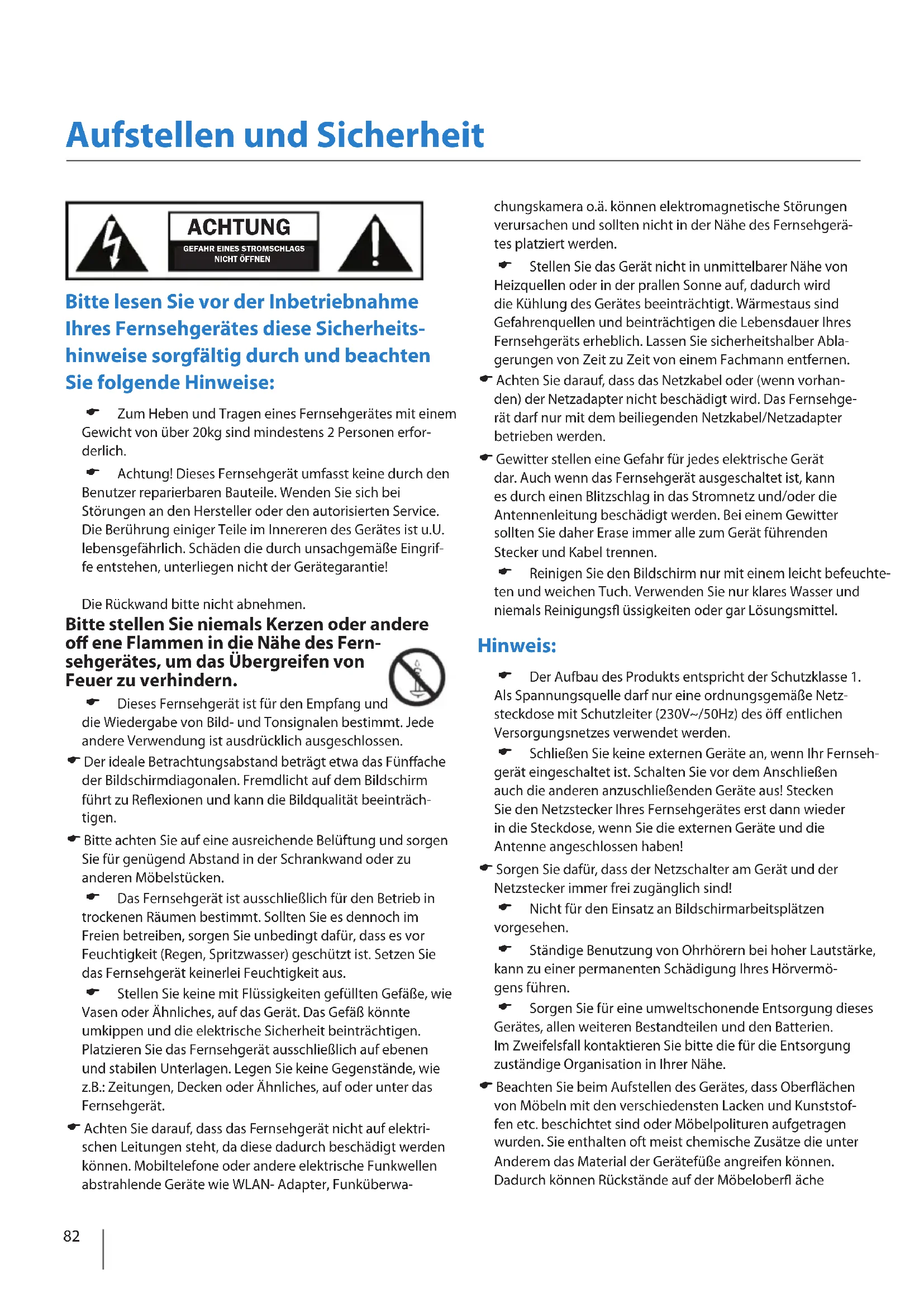 manuale PS3. Console videogame Ho connesso una Xbox 360 alla TV attraverso i cavi Component (Rosso, Verde e Blu), ma non si sente nessun suono. I cavi Component forniscono soltanto immagini in HD. Per il suono sarà necessario connettere i cavi audio rossi e bianchi della Xbox agli ingressi rossi e bianchi sul retro della TV. Si rimanda alle pagine sulla “Connessione”. Modalità USB Ho inserito una chiave USB ma la TV non la riconosce. Assicurarsi che la chiave USB sia formattata come tipo FAT32. Modalità USB Uso di hard drive USB Se si desidera impiegare un hard drive portatile superiore a 32GB, questo dispositivo dovrà essere formattato come sistema le FAT32 al ne di poter funzionare con la TV. I computer Windows XP/Vista sono in grado di formattare no a 32GB; sarà pertanto necessario un programma/utility software per formattare hard drive più grandi. Per ulteriori informazioni si rimanda al sito web. Registrazione USB / TV Non riesco a cambiare canale, ad accedere al menu o ad utilizzare il tasto rosso. Durante questa programmazione non è possibile cambiare canale, accedere al menu o utilizzare il tasto rosso. Registrazione USB / TV Quando si usa l’USB per registrare, l’immagine “si spezzetta” o si veri ca una perdita del suono. Veri care che la chiave USB soddis i requisiti minimi di velocità lettura - 20 MB/s (megabyte al secondo) e velocità scrittura - 6 MB/s (megabyte al secondo). Blocco sistema Ho cambiato la password della TV ma l’ho dimenticata. Esiste una password master (4711) per accedere al menu TV e resettare la normale password. FAQ82 Aufstellen und Sicherheit Bitte lesen Sie vor der Inbetriebnahme Ihres Fernsehgerätes diese Sicherheits- hinweise sorgfältig durch und beachten Sie folgende Hinweise: Zum Heben und Tragen eines Fernsehgerätes mit einem Gewicht von über 20kg sind mindestens 2 Personen erfor-derlich. Achtung! Dieses Fernsehgerät umfasst keine durch den Benutzer reparierbaren Bauteile. Wenden Sie sich bei Störungen an den Hersteller oder den autorisierten Service. Die Berührung einiger Teile im Innereren des Gerätes ist u.U. lebensgefährlich. Schäden die durch unsachgemäße Eingrif-fe entstehen, unterliegen nicht der Gerätegarantie!Die Rückwand bitte nicht abnehmen. Bitte stellen Sie niemals Kerzen oder andere o ene Flammen in die Nähe des Fern- sehgerätes, um das Übergreifen von Feuer zu verhindern. Dieses Fernsehgerät ist für den Empfang und die Wiedergabe von Bild- und Tonsignalen bestimmt. Jede andere Verwendung ist ausdrücklich ausgeschlossen. Der ideale Betrachtungsabstand beträgt etwa das Fün ache der Bildschirmdiagonalen. Fremdlicht auf dem Bildschirm führt zu Re exionen und kann die Bildqualität beeinträch- tigen. Bitte achten Sie auf eine ausreichende Belüftung und sorgen Sie für genügend Abstand in der Schrankwand oder zu anderen Möbelstücken. Das Fernsehgerät ist ausschließlich für den Betrieb in trockenen Räumen bestimmt. Sollten Sie es dennoch im Freien betreiben, sorgen Sie unbedingt dafür, dass es vor Feuchtigkeit (Regen, Spritzwasser) geschützt ist. Setzen Sie das Fernsehgerät keinerlei Feuchtigkeit aus. Stellen Sie keine mit Flüssigkeiten gefüllten Gefäße, wie Vasen oder Ähnliches, auf das Gerät. Das Gefäß könnte umkippen und die elektrische Sicherheit beinträchtigen. Platzieren Sie das Fernsehgerät ausschließlich auf ebenen und stabilen Unterlagen. Legen Sie keine Gegenstände, wie z.B.: Zeitungen, Decken oder Ähnliches, auf oder unter das Fernsehgerät. Achten Sie darauf, dass das Fernsehgerät nicht auf elektri- schen Leitungen steht, da diese dadurch beschädigt werden können. Mobiltelefone oder andere elektrische Funkwellen abstrahlende Geräte wie WLAN- Adapter, Funküberwa-chungskamera o.ä. können elektromagnetische Störungen verursachen und sollten nicht in der Nähe des Fernsehgerä-tes platziert werden. Stellen Sie das Gerät nicht in unmittelbarer Nähe von Heizquellen oder in der prallen Sonne auf, dadurch wird die Kühlung des Gerätes beeinträchtigt. Wärmestaus sind Gefahrenquellen und beinträchtigen die Lebensdauer Ihres Fernsehgeräts erheblich. Lassen Sie sicherheitshalber Abla-gerungen von Zeit zu Zeit von einem Fachmann entfernen. Achten Sie darauf, dass das Netzkabel oder (wenn vorhan- den) der Netzadapter nicht beschädigt wird. Das Fernsehge-rät darf nur mit dem beiliegenden Netzkabel/Netzadapter betrieben werden. Gewitter stellen eine Gefahr für jedes elektrische Gerät dar. Auch wenn das Fernsehgerät ausgeschaltet ist, kann es durch einen Blitzschlag in das Stromnetz und/oder die Antennenleitung beschädigt werden. Bei einem Gewitter sollten Sie daher Erase immer alle zum Gerät führenden Stecker und Kabel trennen. Reinigen Sie den Bildschirm nur mit einem leicht befeuchte- ten und weichen Tuch. Verwenden Sie nur klares Wasser und niemals Reinigungs üssigkeiten oder gar Lösungsmittel. Hinweis: Der Aufbau des Produkts entspricht der Schutzklasse 1. Als Spannungsquelle darf nur eine ordnungsgemäße Netz-steckdose mit Schutzleiter (230V~/50Hz) des ö entlichen Versorgungsnetzes verwendet werden. Schließen Sie keine externen Geräte an, wenn Ihr Fernseh- gerät eingeschaltet ist. Schalten Sie vor dem Anschließen auch die anderen anzuschließenden Geräte aus! Stecken Sie den Netzstecker Ihres Fernsehgerätes erst dann wieder in die Steckdose, wenn Sie die externen Geräte und die Antenne angeschlossen haben! Sorgen Sie dafür, dass der Netzschalter am Gerät und der Netzstecker immer frei zugänglich sind! Nicht für den Einsatz an Bildschirmarbeitsplätzen vorgesehen. Ständige Benutzung von Ohrhörern bei hoher Lautstärke, kann zu einer permanenten Schädigung Ihres Hörvermö-gens führen. Sorgen Sie für eine umweltschonende Entsorgung dieses Gerätes, allen weiteren Bestandteilen und den Batterien. Im Zweifelsfall kontaktieren Sie bitte die für die Entsorgung zuständige Organisation in Ihrer Nähe. Beachten Sie beim Aufstellen des 