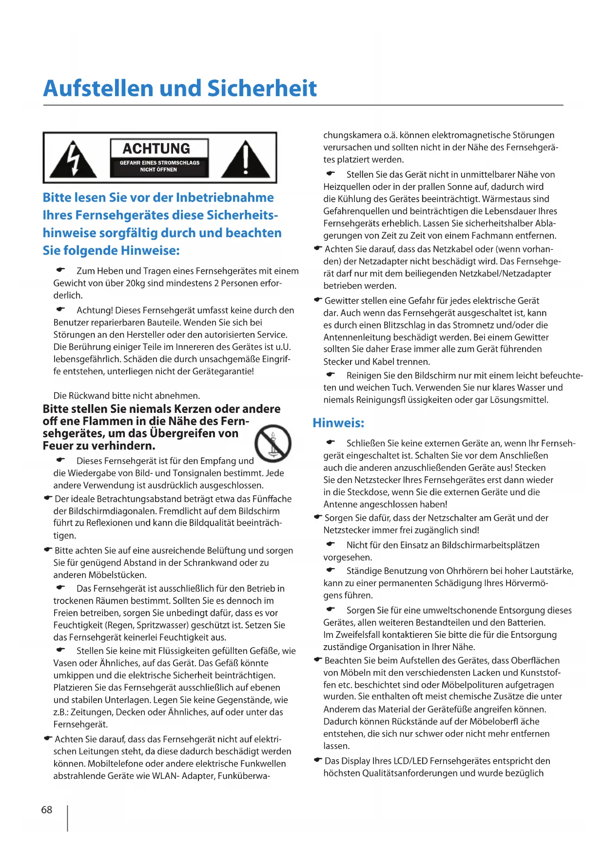 VEAL LANG 1x TV 1x Standfuß 1x Standfußhals Installationspaket für Standfuß 1x Diese Bedienungsanleitung 1x Schnellstart Anleitung „Quick Start Guide“71 Deutsch Aufstellen des Gerätes Bitte folgen Sie der Aufbauanleitung, diese be ndet sich in der Zubehörtüte Ihres Fernsehgerätes. Wichtiger Hinweis Wie nachstehend beschrieben, stellt die Montage des Gerätes an der Wand eine sichere Variante der Befestigung dar.Können Sie den Fernseher nicht an seiner Unterlage befestigen, empfehlen wir Ihnen den Fernseher mit einer Sicherheitsleine und Ösenschrauben an der Wand zu xieren. Stellen Sie in jedem Fall sicher, dass Kinder das Fernsehgerät nicht kippen, sich daran hängen oder darauf klettern können. Ein umkippendes Fernsehgerät kann Ihnen und Ihrem Kind schwerste Verletzungen zufügen.Die Sicherheitsleine sollte nicht durchhängen und horizontal zwischen Fernseher und Wand angebracht sein. Wandmontage Ihr Fernseher ist für Wandhalterungen des VESA Standards vorbereitet: