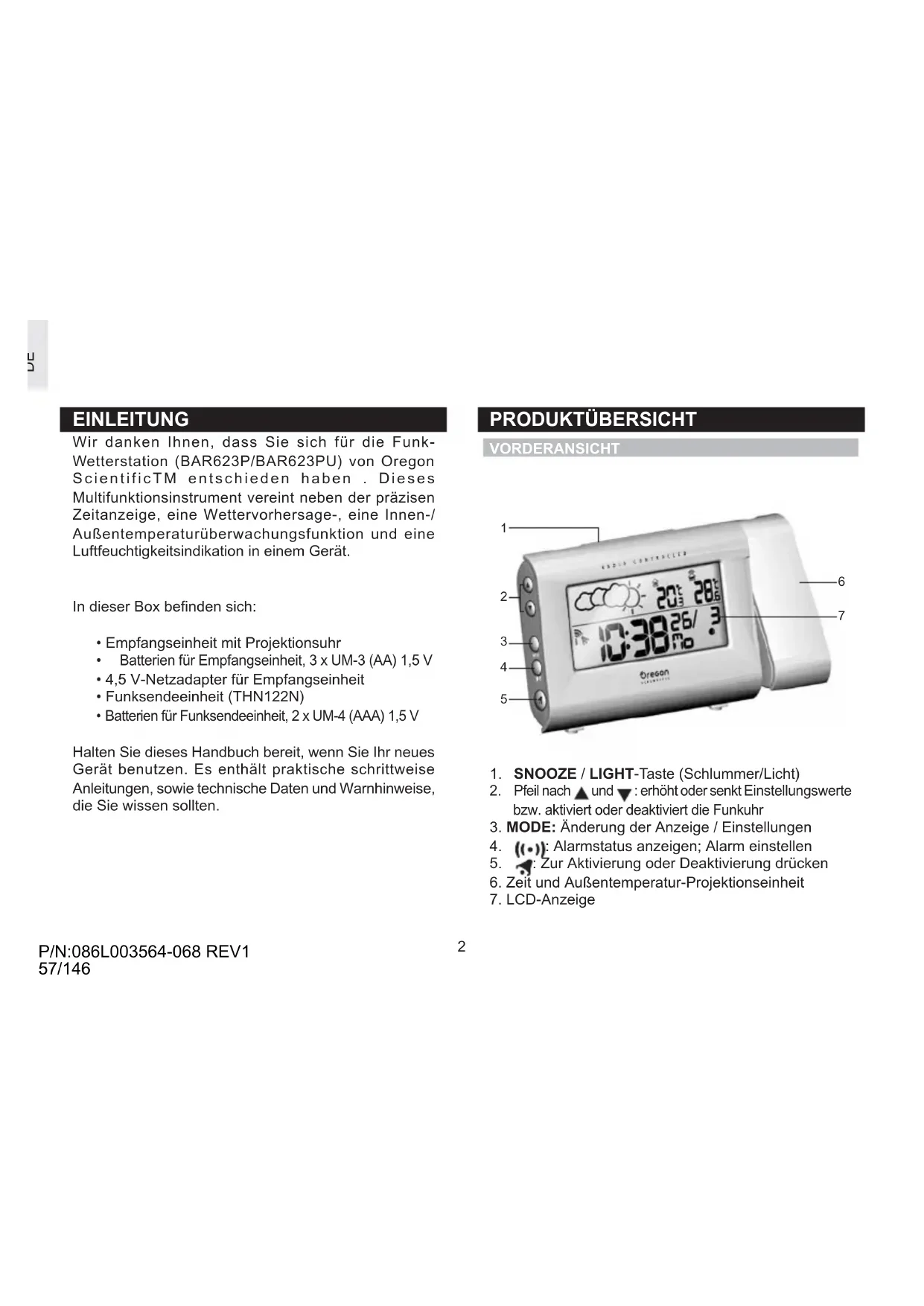 Kalender TT / MM; Wochentag in 5 Sprachen (E, D, F, I, S) Alarm Einzelner Alarm mit 2 Minuten Crescendo-Alarm 8 Minuten Schlummerfunktion (Snooze) Projektor Außentemperatur und Zeit STROMVERSORGUNG Batterien für Empfangseinheit 3 x UM-3 (AA) 1.5V Batterien für Funksendeeinheit 2 x UM-4 (AAA) 1.5V Netzadapter 4,5 V-Anschluß HINWEIS Um eine längere Lebensdauer zu erzielen, wird für dieses Gerät die Verwendung von Alkaline-Batterien empfohlen. Über OREGON SCIENTIFIC Besuchen Sie unsere Website (www.oregonscientific. de) und erfahren Sie mehr über unsere Oregon Scientific-Produkte wie zum Beispiel Digitalkameras, MP3-Player, Kinderlerncomputer und Spiele, Projektionsfunkuhren, Produkte für Gesundheit und Fitness, Wetterstationen und Digital- und Konferenztelefone. Auf der Website finden Sie auch Informationen, wie Sie im Bedarfsfall unseren Kundendienst erreichen und Daten herunterladen können. Wir hoffen, dass Sie alle wichtigen Informationen auf unserer Website finden. Für internationale Anfragen besuchen Sie bitte unsere Website: www2. oregonscientific.com/about/international/default.asp.