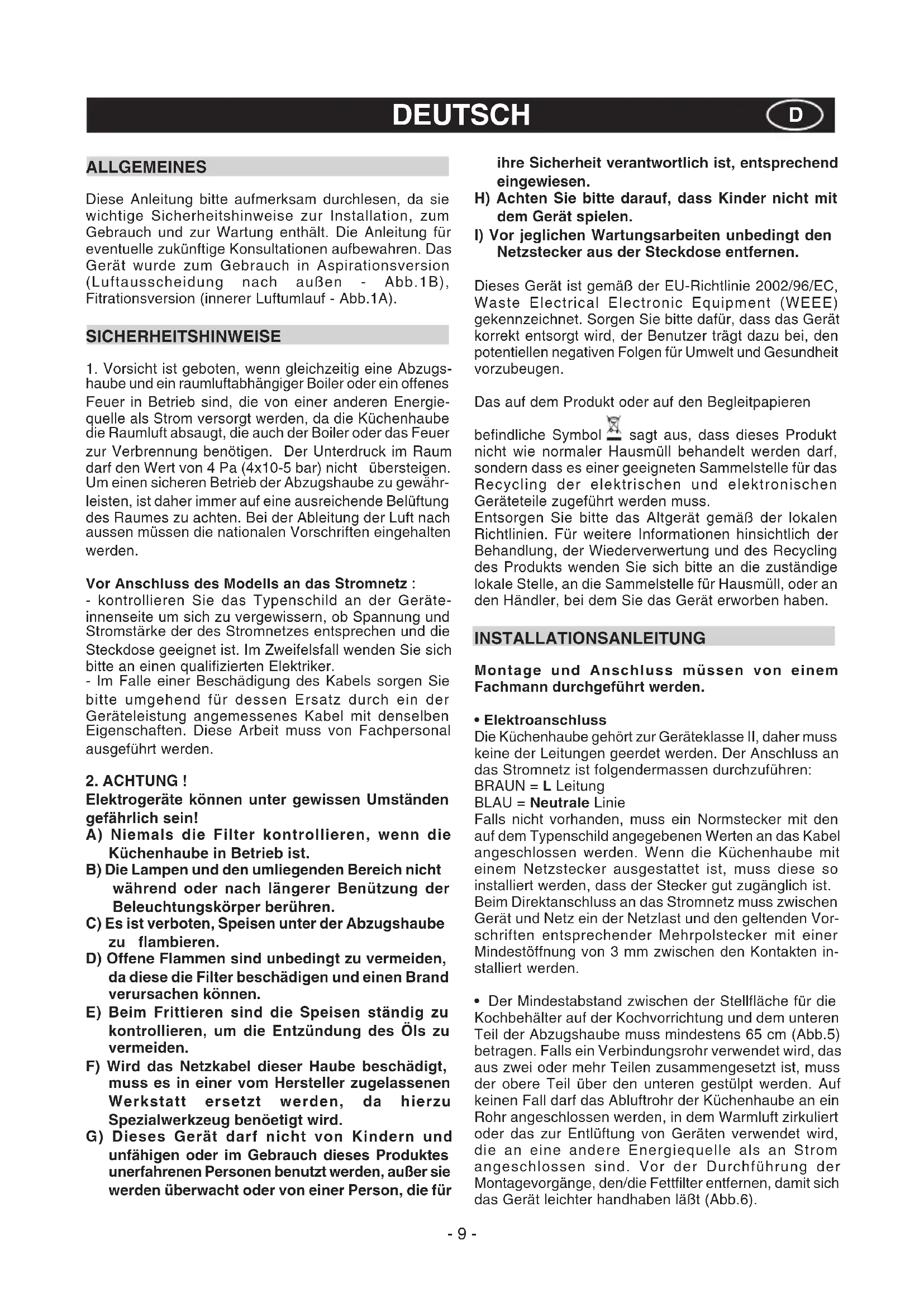 Elektrogeräte können unter gewissen Umständen gefährlich sein! A) Niemals die Filter kontrollieren, wenn die Küchenhaube in Betrieb ist. B) Die Lampen und den umliegenden Bereich nicht während oder nach längerer Benützung der Beleuchtungskörper berühren. C) Es ist verboten, Speisen unter der Abzugshaube zu flambieren. D) Offene Flammen sind unbedingt zu vermeiden, da diese die Filter beschädigen und einen Brand verursachen können. E) Beim Frittieren sind die Speisen ständig zu kontrollieren, um die Entzündung des Öls zu vermeiden. F) Wird das Netzkabel dieser Haube beschädigt, muss es in einer vom Hersteller zugelassenen Werkstatt ersetzt werden, da hierzu Spezialwerkzeug benöetigt wird. G) Dieses Gerät darf nicht von Kindern und unfähigen oder im Gebrauch dieses Produktes unerfahrenen Personen benutzt werden, außer sie werden überwacht oder von einer Person, die für ihre Sicherheit verantwortlich ist, entsprechend eingewiesen. H) Achten Sie bitte darauf, dass Kinder nicht mit dem Gerät spielen.