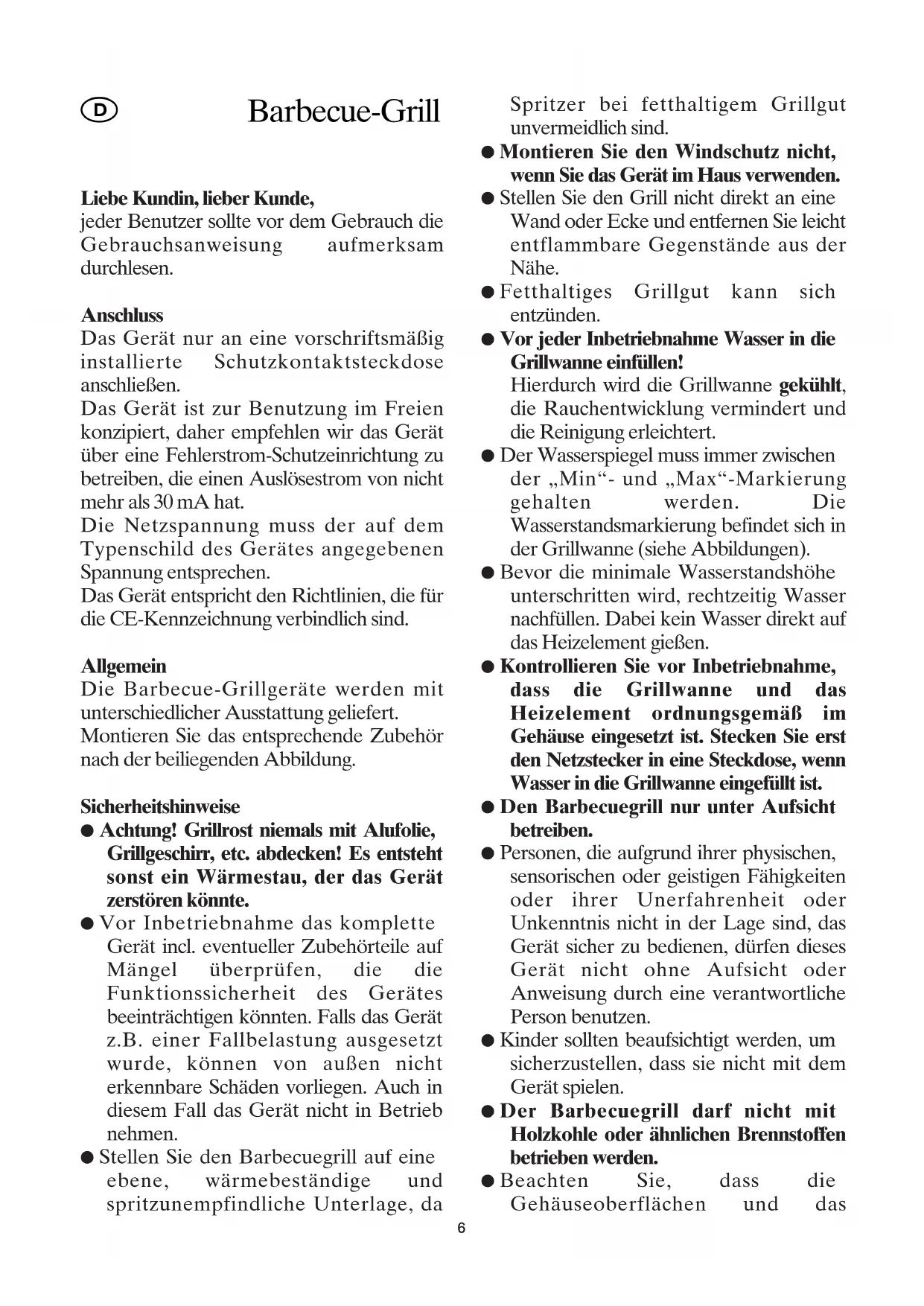 Barbecue-Grill Heizelement im Betrieb sehr heiß sind. Berühren Sie auch nach dem Abschalten das Heizelement nicht, solange es noch heiß ist. Es besteht Verbrennungsgefahr! ● Das Heizelement mit Netzzuleitung darf aus Gründen der elektrischen Sicherheit nicht mit Flüssigkeiten behandelt oder gar darin eingetaucht werden. ● Die Anschlussleitung darf nicht mit heißen Teilen in Berührung kommen. ● Überprüfen Sie die Anschlussleitung regelmäßig auf Beschädigungen. Im Falle einer Beschädigung darf das Gerät nicht benutzt werden. ● Den Netzstecker ziehen: - nach jedem Gebrauch, - bei Störung während des Betriebes, - vor jeder Reinigung. ● Wird eine Kabeltrommel verwendet, entsteht hierdurch ein Leistungsverlust. Das Kabel muss vollständig abgewickelt sein, da sich dieses sonst unzulässig erwärmen kann. Achten Sie darauf, dass die Kabeltrommel für den Gebrauch im Freien geeignet ist. ● Das Gerät nicht mit einer externen Zeitschaltuhr oder mit einem Fernsteuerungssystem (Fernbedienung) betreiben. ● Lassen Sie den Barbecuegrill erst abkühlen, bevor Sie ihn tragen und wegstellen. Das Wasser nach Gebrauch entfernen. ● Achten Sie darauf, dass der Grill nicht im Freien oder an offenen Stellen aufbewahrt wird, wo er durch Witterungseinflüsse beeinträchtigt werden könnte. ● Wird der Barbecuegrill falsch bedient, kann keine Haftung für evtl. auftretende Schäden übernommen werden. ● Der Barbecuegrill ist für den Betrieb im Haushalt bestimmt, nicht für den gewerblichen Einsatz. ● Reparaturen an Elektrogeräten müssen von Fachkräften durchgeführt werden, da Sicherheitsbestimmungen zu beachten sind und um Gefährdungen zu vermeiden. Dies gilt auch für den Austausch der Anschlussleitung. Schicken Sie daher das Gerät im Reparaturfall zu unserem Kundendienst. Die Anschrift finden Sie im Anhang der Anweisung. Grill mit zusätzlichem Untergestell: Montieren Sie das Untergestell gemäß der beiliegenden Skizze. Anschließend den Barbecuegrill mit den Standfüßen auf die Standrohre des Untergestells setzen. Achten Sie darauf, dass der Grill mit Untergestell sicher steht. Die Netzzuleitung so verlegen, dass keine Stolpergefahr besteht. Heizkörper Der Anschlusskasten ist mit einem Sicherheitsschalter ausgestattet. Nachdem die Grillwanne in das Kunststoffgehäuse eingesetzt wurde, den Heizkörper ordnungsgemäß in die Grillwanne und das Gehäuse einsetzen. Dabei wird der Sicherheitsschalter betätigt. Ist der Heizkörper nicht ordnungsgemäß eingesetzt, lässt sich dieser nicht in Betrieb nehmen. Erste Inbetriebnahme