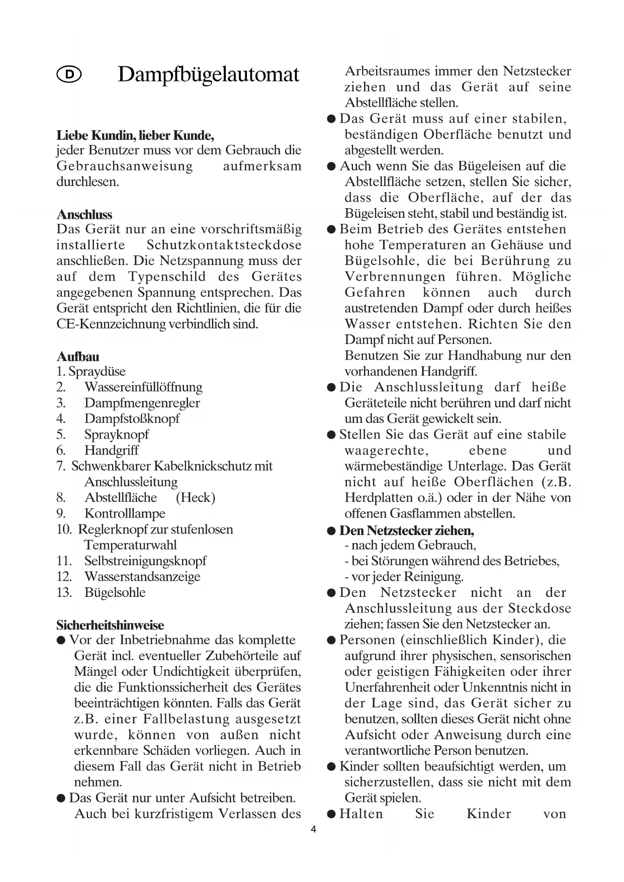 Sicherheitshinweise ● Vor der Inbetriebnahme das komplette Gerät incl. eventueller Zubehörteile auf Mängel oder Undichtigkeit überprüfen, die die Funktionssicherheit des Gerätes beeinträchtigen könnten. Falls das Gerät z.B. einer Fallbelastung ausgesetzt wurde, können von außen nicht erkennbare Schäden vorliegen. Auch in diesem Fall das Gerät nicht in Betrieb nehmen. ● Das Gerät nur unter Aufsicht betreiben. Auch bei kurzfristigem Verlassen des Arbeitsraumes immer den Netzstecker ziehen und das Gerät auf seine Abstellfläche stellen. ● Das Gerät muss auf einer stabilen, beständigen Oberfläche benutzt und abgestellt werden. ● Auch wenn Sie das Bügeleisen auf die Abstellfläche setzen, stellen Sie sicher, dass die Oberfläche, auf der das Bügeleisen steht, stabil und beständig ist. ● Beim Betrieb des Gerätes entstehen hohe Temperaturen an Gehäuse und Bügelsohle, die bei Berührung zu Verbrennungen führen. Mögliche Gefahren können auch durch austretenden Dampf oder durch heißes Wasser entstehen. Richten Sie den Dampf nicht auf Personen. Benutzen Sie zur Handhabung nur den vorhandenen Handgriff. ● Die Anschlussleitung darf heiße Geräteteile nicht berühren und darf nicht um das Gerät gewickelt sein. ● Stellen Sie das Gerät auf eine stabile waagerechte, ebene und wärmebeständige Unterlage. Das Gerät nicht auf heiße Oberflächen (z.B. Herdplatten o.ä.) oder in der Nähe von offenen Gasflammen abstellen. ● Den Netzstecker ziehen, - nach jedem Gebrauch, - bei Störungen während des Betriebes, - vor jeder Reinigung. ● Den Netzstecker nicht an der Anschlussleitung aus der Steckdose ziehen; fassen Sie den Netzstecker an. ● Personen (einschließlich Kinder), die aufgrund ihrer physischen, sensorischen oder geistigen Fähigkeiten oder ihrer Unerfahrenheit oder Unkenntnis nicht in der Lage sind, das Gerät sicher zu benutzen, sollten dieses Gerät nicht ohne Aufsicht oder Anweisung durch eine verantwortliche Person benutzen. ● Kinder sollten beaufsichtigt werden, um sicherzustellen, dass sie nicht mit dem Gerät spielen. ● Halten Sie Kinder von