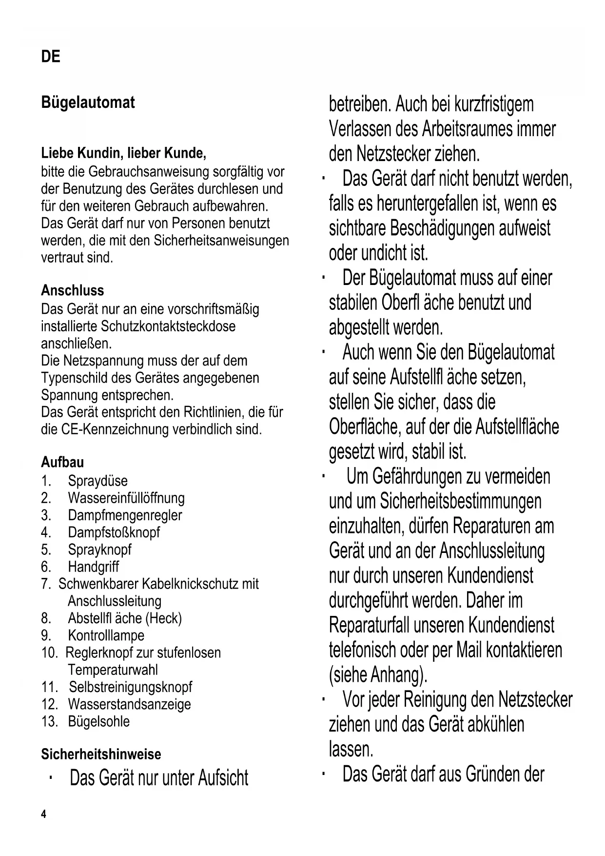 Bügelautomat Liebe Kundin, lieber Kunde, bitte die Gebrauchsanweisung sorgfältig vor der Benutzung des Gerätes durchlesen und für den weiteren Gebrauch aufbewahren. Das Gerät darf nur von Personen benutzt werden, die mit den Sicherheitsanweisungen vertraut sind. Anschluss Das Gerät nur an eine vorschriftsmäßig installierte Schutzkontaktsteckdose anschließen. Die Netzspannung muss der auf dem Typenschild des Gerätes angegebenen Spannung entsprechen. Das Gerät entspricht den Richtlinien, die für die CE-Kennzeichnung verbindlich sind. Aufbau