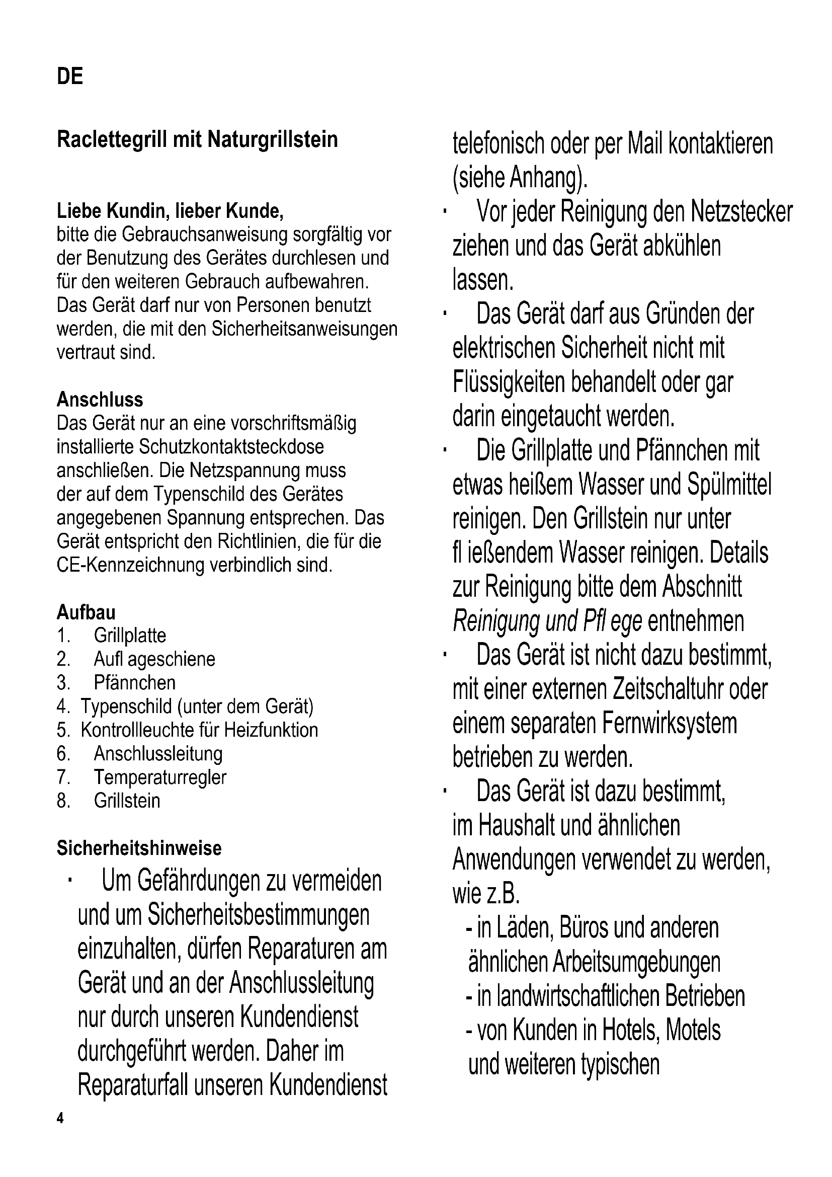 Raclettegrill mit Naturgrillstein Liebe Kundin, lieber Kunde, bitte die Gebrauchsanweisung sorgfältig vor der Benutzung des Gerätes durchlesen und für den weiteren Gebrauch aufbewahren. Das Gerät darf nur von Personen benutzt werden, die mit den Sicherheitsanweisungen vertraut sind. Anschluss Das Gerät nur an eine vorschriftsmäßig installierte Schutzkontaktsteckdose anschließen. Die Netzspannung muss der auf dem Typenschild des Gerätes angegebenen Spannung entsprechen. Das Gerät entspricht den Richtlinien, die für die CE-Kennzeichnung verbindlich sind. Aufbau