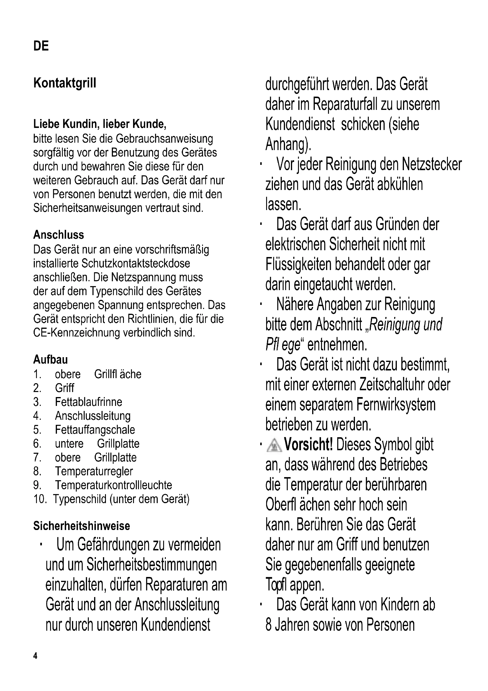 Kontaktgrill Liebe Kundin, lieber Kunde, bitte lesen Sie die Gebrauchsanweisung sorgfältig vor der Benutzung des Gerätes durch und bewahren Sie diese für den weiteren Gebrauch auf. Das Gerät darf nur von Personen benutzt werden, die mit den Sicherheitsanweisungen vertraut sind. Anschluss Das Gerät nur an eine vorschriftsmäßig installierte Schutzkontaktsteckdose anschließen. Die Netzspannung muss der auf dem Typenschild des Gerätes angegebenen Spannung entsprechen. Das Gerät entspricht den Richtlinien, die für die CE-Kennzeichnung verbindlich sind. Aufbau