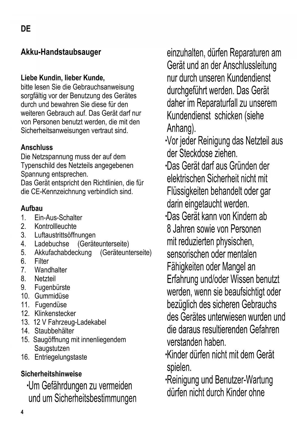 Akku-Handstaubsauger Liebe Kundin, lieber Kunde, bitte lesen Sie die Gebrauchsanweisung sorgfältig vor der Benutzung des Gerätes durch und bewahren Sie diese für den weiteren Gebrauch auf. Das Gerät darf nur von Personen benutzt werden, die mit den Sicherheitsanweisungen vertraut sind. Anschluss Die Netzspannung muss der auf dem Typenschild des Netzteils angegebenen Spannung entsprechen. Das Gerät entspricht den Richtlinien, die für die CE-Kennzeichnung verbindlich sind. Aufbau