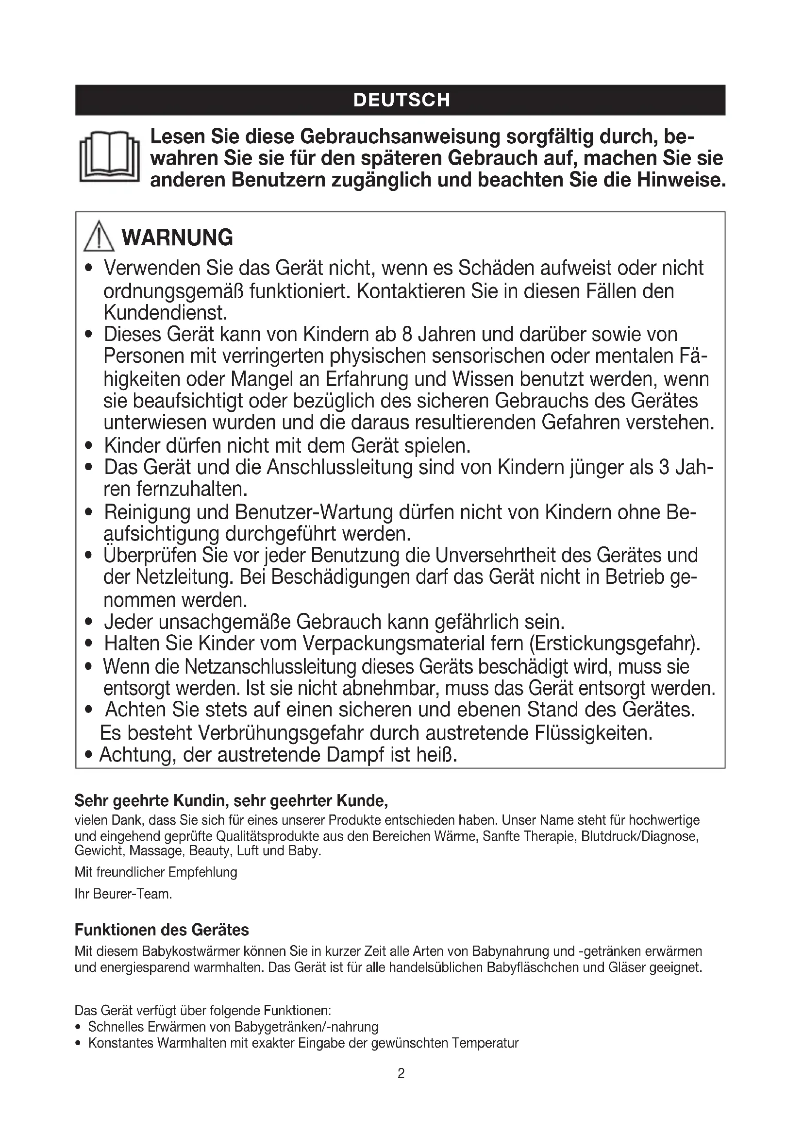 - Achtung, der austretende Dampf ist heiß. Sehr geehrte Kundin, sehr geehrter Kunde, vielen Dank, dass Sie sich für eines unserer Produkte entschieden haben. Unser Name steht für hochwertige und eingehend geprüfte Qualitätsprodukte aus den Bereichen Wärme, Sanfte Therapie, Blutdruck/Diagnose, Gewicht, Massage, Beauty, Luft und Baby. Mit freundlicher Empfehlung Ihr Beurer-Team. Funktionen des Gerätes Mit diesem Babykostwärmer können Sie in kurzer Zeit alle Arten von Babynahrung und -getränken erwärmen und energiesparend warmhalten. Das Gerät ist für alle handelsüblichen Babyfläschchen und Gläser geeignet. Das Gerät verfügt über folgende Funktionen: