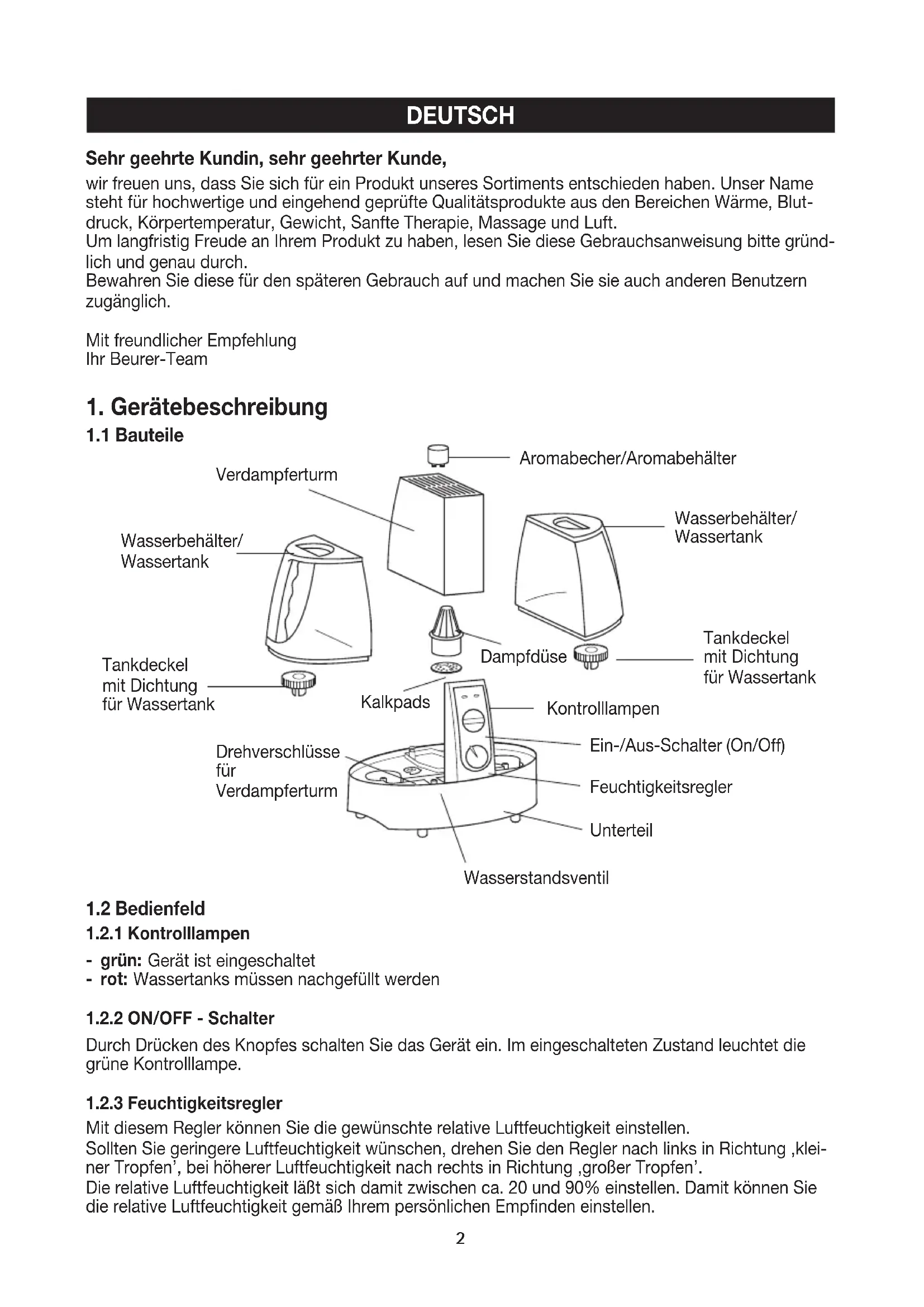 - Wasserstandsventil blockiert Beseitigung Ë Füllen Sie die Wassertanks Ë Setzen Sie die Tanks neu auf Ë Stellen Sie den Regler auf höhere Luftfeuchtigkeit Ë Zuleitung zum Verdampfer- becher z.B. durch Kalk verstopft, beheben Sie die Verstopfung Ë Schrauben Sie die Tankde- ckel fest zu Ë Setzen Sie die Dichtung fest ein Ë Reinigen Sie das Gerät Ë Füllen Sie die Wassertanks Ë Reinigen Sie das Ventil Ë Reinigen Sie das Gerät Ë Ventil gängig machen7 Dear Customer, We are pleased that you have decided in favor of a product from our range. Our name stands for high quality and exhaustively tested products from the areas of warmth, blood pressure, body tem- perature, weight, gentle therapy, massage and air.In order to have long term satisfaction from your product, please study these instructions carefully and in detail. Keep them for later use and make them available to other users. Yours sincerely Your Beurer Team