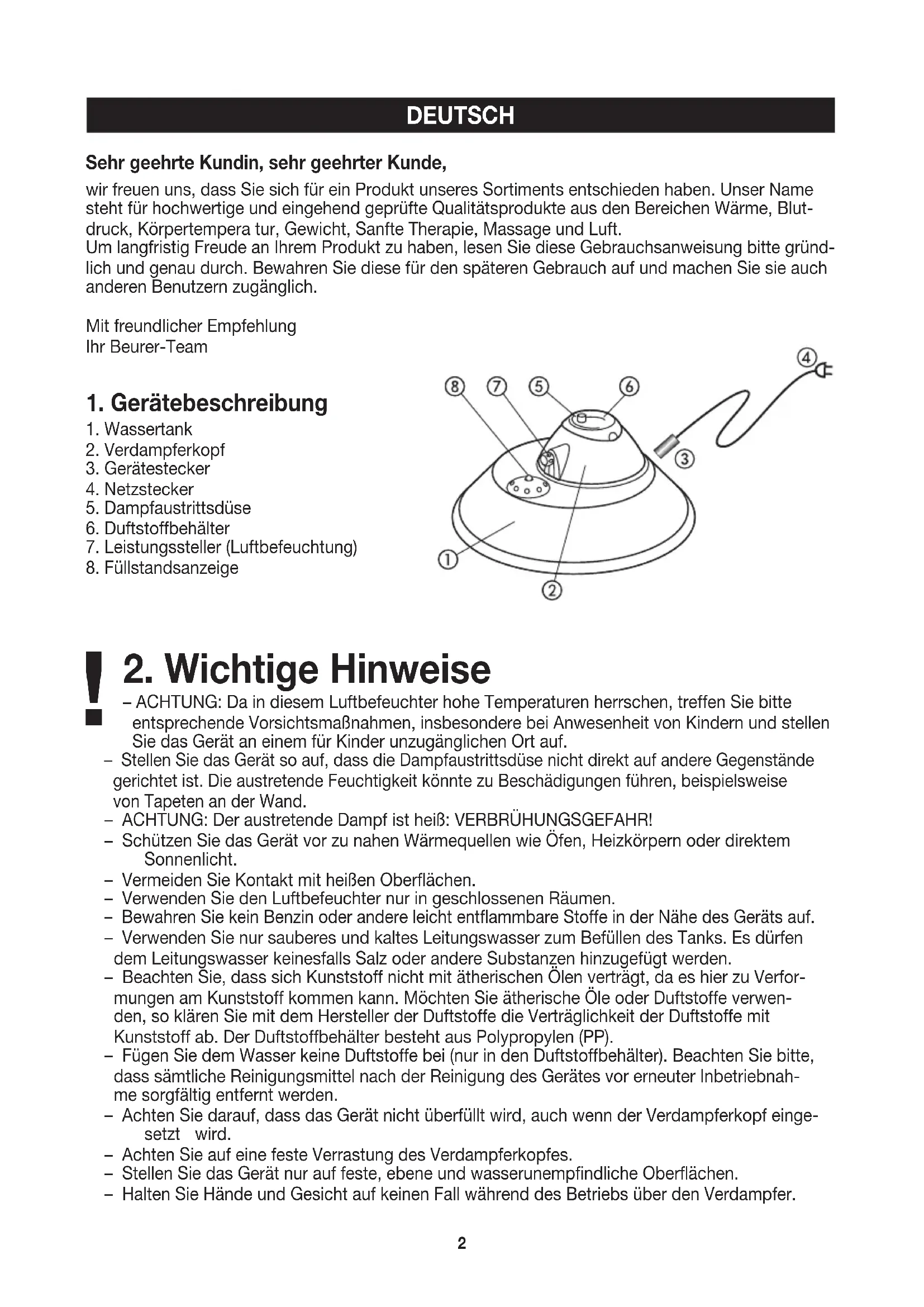– ACHTUNG: Da in diesem Luftbefeuchter hohe Temperaturen herrschen, treffen Sie bitte entsprechende Vorsichtsmaßnahmen, insbesondere bei Anwesenheit von Kindern und stellen Sie das Gerät an einem für Kinder unzugänglichen Ort auf. – Stellen Sie das Gerät so auf, dass die Dampfaustrittsdüse nicht direkt auf andere Gegenstände gerichtet ist. Die austretende Feuchtigkeit könnte zu Beschädigungen führen, beispielsweise von Tapeten an der Wand. – ACHTUNG: Der austretende Dampf ist heiß: VERBRÜHUNGSGEFAHR! – Schützen Sie das Gerät vor zu nahen Wärmequellen wie Öfen, Heizkörpern oder direktem Sonnenlicht. – Vermeiden Sie Kontakt mit heißen Oberflächen. – Verwenden Sie den Luftbefeuchter nur in geschlossenen Räumen. – Bewahren Sie kein Benzin oder andere leicht entflammbare Stoffe in der Nähe des Geräts auf. – Verwenden Sie nur sauberes und kaltes Leitungswasser zum Befüllen des Tanks. Es dürfen dem Leitungswasser keinesfalls Salz oder andere Substanzen hinzugefügt werden. – Beachten Sie, dass sich Kunststoff nicht mit ätherischen Ölen verträgt, da es hier zu Verfor- mungen am Kunststoff kommen kann. Möchten Sie ätherische Öle oder Duftstoffe verwen- den, so klären Sie mit dem Hersteller der Duftstoffe die Verträglichkeit der Duftstoffe mit Kunststoff ab. Der Duftstoffbehälter besteht aus Polypropylen (PP). – Fügen Sie dem Wasser keine Duftstoffe bei (nur in den Duftstoffbehälter). Beachten Sie bitte, dass sämtliche Reinigungsmittel nach der Reinigung des Gerätes vor erneuter Inbetriebnah- me sorgfältig entfernt werden. – Achten Sie darauf, dass das Gerät nicht überfüllt wird, auch wenn der Verdampferkopf einge- setzt wird. – Achten Sie auf eine feste Verrastung des Verdampferkopfes. – Stellen Sie das Gerät nur auf feste, ebene und wasserunempfindliche Oberflächen. – Halten Sie Hände und Gesicht auf keinen Fall während des Betriebs über den Verdampfer.