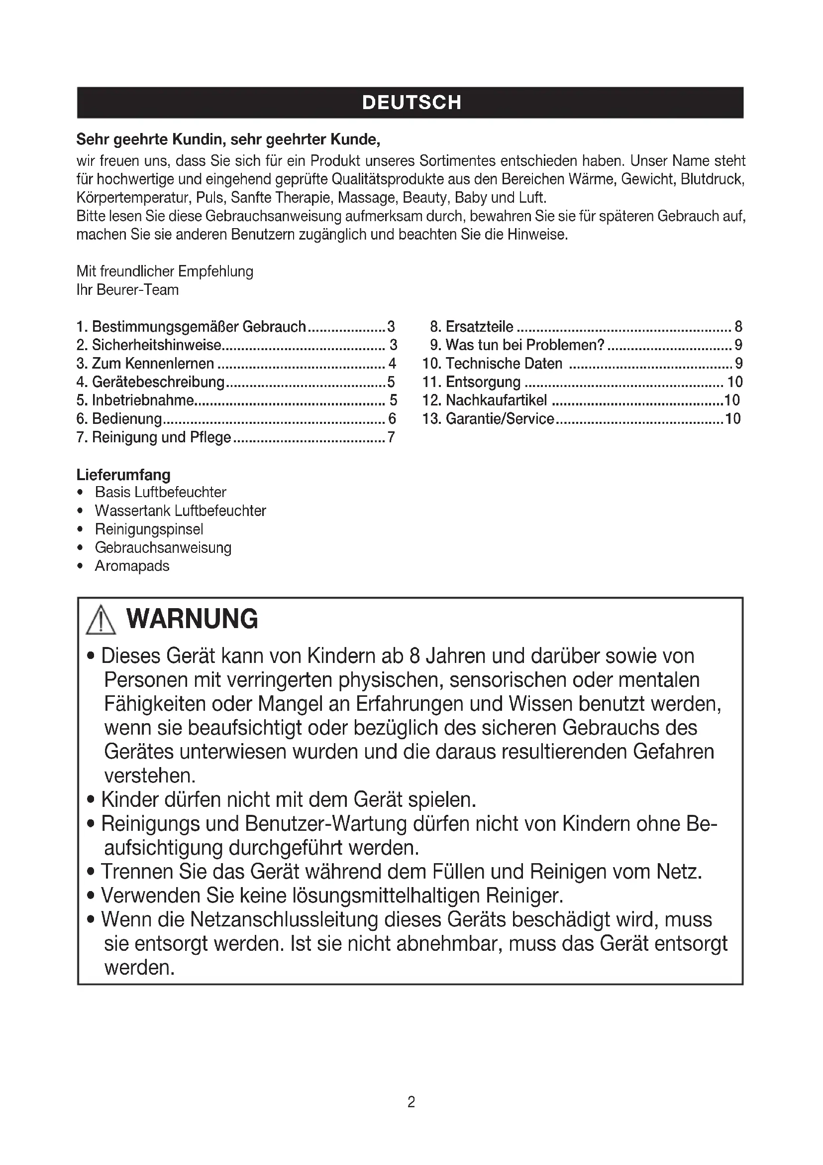 - Sobald das Gerät durch eine nicht autorisierte Werkstatt geöffnet wurde. Die gesetzlichen Gewährleistungen des Kunden bleiben durch die Garantie unberührt. Für Geltendmachung eines Garantiefalles innerhalb der Garantiezeit ist durch den Kunden der Nachweis des Kaufes zu führen. Die Garantie ist innerhalb eines Zeitraumes von 3 Jahren ab Kaufdatum gegenüber der Beurer GmbH, Ulm (Germany) geltend zu machen. Bitte wenden Sie sich im Falle von Reklamationen an unseren Service unter folgendem Kontakt: Service Hotline: Tel.: +49 (0) 731 / 39 89-144 E-Mail: kd@beurer.de www.beurer.com Fordern wir Sie zur Übersendung des defekten Produktes auf, ist das Produkt an folgende Adresse zu senden: Beurer GmbH Servicecenter Lessingstraße 10 b 89231 Neu-Ulm Germany11 Dear Customer Thank you for choosing one of our products. Our name stands for high-quality, thoroughly tested products for applications in the areas of heat, weight, blood pressure, body temperature, pulse, gentle therapy, mas- sage, beauty, baby and air. Please read these instructions for use carefully and keep them for later use, be sure to make them accessible to other users and observe the information they contain. With kind regards, Your Beurer team Included in delivery