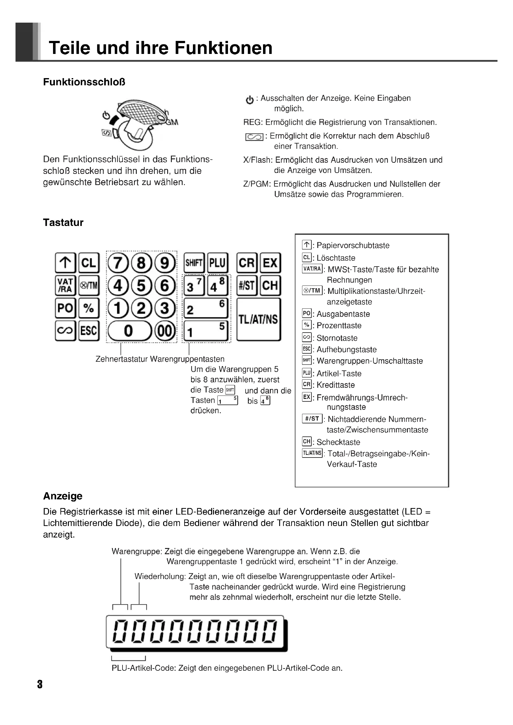 - Zur vollständigen elektrischen Trennung vom Netz den Netzstecker ziehen. WICHTIG! Bevor die Registrierkasse zum ersten Mal benutzt wird, muß diese zuerst zurückgestellt und danach die drei neuen R6- oder LR6-Batterien (Größe AA) eingesetzt werden. Folgen Sie immer den Bedienungsschritten, die im Abschnitt “Vorbereitung der Registrierkasse” beschrieben sind. Nach dem Öffnen des Verpackungskartons ist sicherzustellen, daß sämtliche im Abschnitt “Technische Daten” aufgeführten Zubehörteile vorhanden sind. Deutsch A102_01(D) 05.4.18 5:37 PM Page 22 Inhaltsverzeichnis Teile und ihre Funktionen..................................................................3 Bei fehlerhaften Eingaben .................................................................4 Vorbereitung der Registrierkasse.....................................................5 Schnellstart-Bedienungsschritte ......................................................7 Programmierung von Datum und Uhrzeit..............................................8 Programmierung der Mehrwertsteuer....................................................8 Programmierung der Warengruppen.....................................................9 Ausführung allgemeiner Verkaufsregistrierungen (Warengruppenregistrierungen).............................................................9 Abruf/Nullstellung von Verkaufsdaten..................................................11 Verschiedene Markmale für Verkaufsregistrierungen ..................12 PLU-Artikel-Registrierungen ................................................................12 Praktische Verkaufsregistrierungen .....................................................12 MWSt-Berechnung ..............................................................................13 Verwendung der Prozenttaste bei Aufschlägen und Abschlägen........13 Fremdwährungsumrechnung...............................................................14 Kein-Verkauf .......................................................................................14 Retouren ..............................................................................................14 Nicht-addierender Nummerncode........................................................14 Registrierung von bezahlten Rechnungen und Ausgaben ..................14 Korrekturen ..........................................................................................15 Abruf und Nullstellung der Umsätze ..............................................15 EURO-Übergangsfunktion ...............................................................17 Weiterführende Programmierung ...................................................19 Programmierung eines vorgewählten Einzelpreises für jede Warengruppe .......................................................................................19 PLU-Programmierung..........................................................................19 Programmierung der Prozenttaste ......................................................19 Programmierung der Fremdwährungs-Umrechnungstaste .................20 Druckformat-Programmierung .............................................................20 Verschiedene Programmierungen .......................................................21 Programmierung der fortlaufenden Kassenbonnummer .....................21 EURO-Programmierung ......................................................................22 Programmierung der Rundung (für australisches Steuersystem) .......22 Programmierung des Geheimcodes....................................................22 Programmierung zum Ausdruck des MWSt-Satzes und Nettobetrages auf dem Kassenbon.....................................................23 Überprüfen der programmierten Registrierkassen- einstellungen.....................................................................................24 Wartung .............................................................................................25 Handhabung der Schublade................................................................25 Austausch der Papierrolle ...................................................................25 Austausch der Batterien ......................................................................26 Austausch des Druckfarbrollers...........................................................26 Bei Stromausfall oder Papierstau........................................................26 Bevor Sie den Kundendienst anfordern ..............................................27 Technische Daten ................................................................................27 Deutsch A102_01(D) 05.4.18 5:37 PM Page 33 Teile und ihre Funktionen Funktionsschloß Tastatur Anzeige Die Registrierkasse ist mit einer LED-Bedieneranzeige auf der Vorderseite ausgestattet (LED = Lichtemittierende Diode), die dem Bediener während der Transaktion neun Stellen gut sichtbar anzeigt. o: Papiervorschubtaste c: Löschtaste V: MWSt-Taste/Taste für bezahlte Rechnungen x: Multiplikationstaste/Uhrzeit- anzeigetaste p: Ausgabentaste %: Prozenttaste v: Stornotaste e: Aufhebungstaste s: Warengruppen-Umschalttaste P: Artikel-Taste R: Kredittaste E: Fremdwährungs-Umrech- nungstaste S: Nichtaddierende Nummern- taste/Zwischensummentaste C: Schecktaste t: Total-/Betragseingabe-/Kein- Verkauf-Taste : Ausschalten der Anzeige. Keine Eingaben möglich. REG: Ermöglicht die Registrierung von Transaktionen. : Ermöglicht die Korrektur nach dem Abschluß einer Transaktion. X/Flash: Ermöglicht das Ausdrucken von Umsätzen und die Anzeige von Umsätzen. Z/PGM: Ermöglicht das Ausdrucken und Nullstellen der Umsätze sowie das Programmieren. Den Funktionsschlüssel in das Funktions- schloß stecken und ihn drehen, um die gewünschte Betriebsart zu wählen. Zehnertastatur Warengruppentasten Um die Warengruppen 5 bis 8 anzuwählen, zuerst die Taste s und dann die Tasten ! bis $ drücken. Wiederholung: Zeigt an, wie oft dieselbe Warengruppe