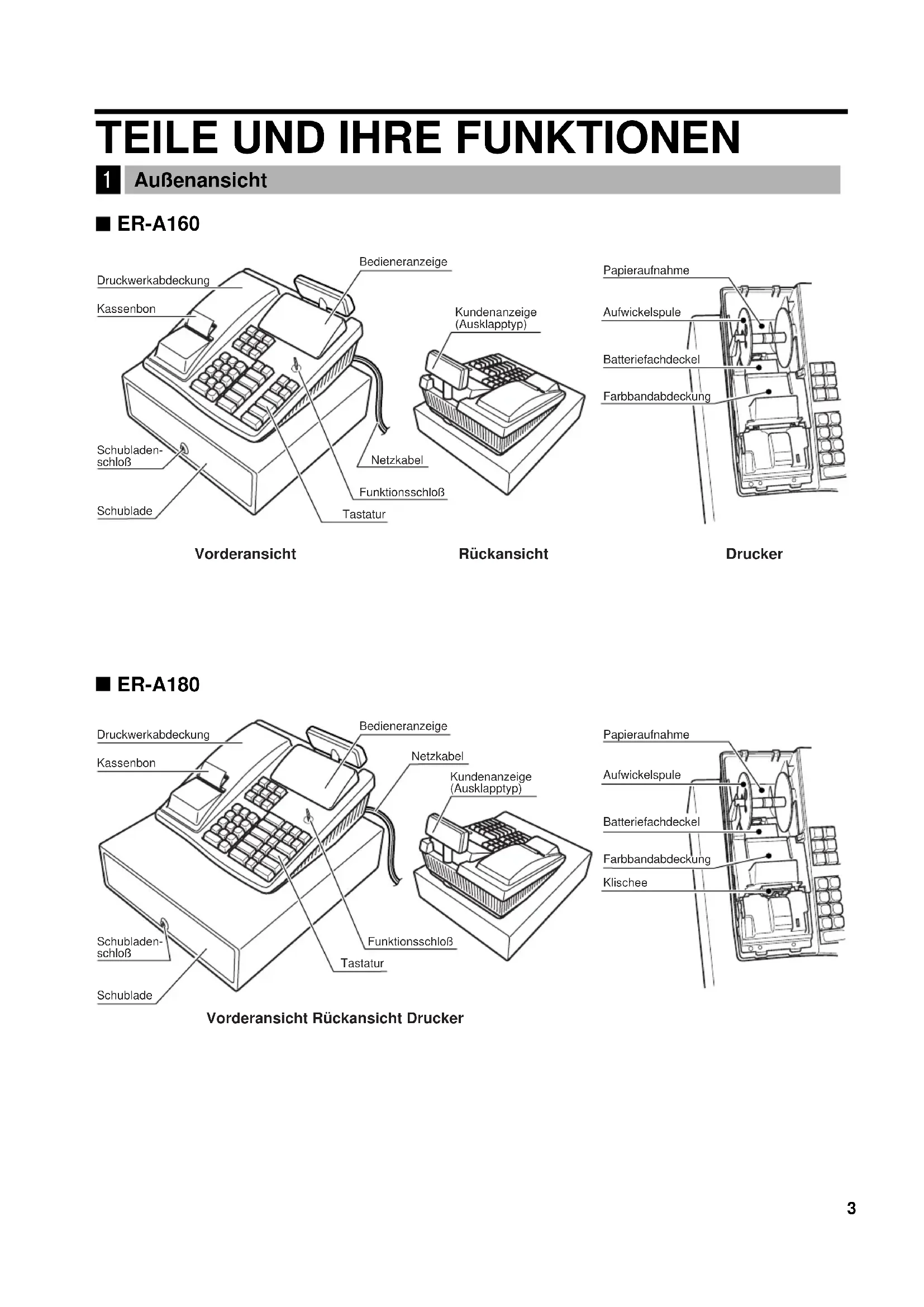 - Specifications and appearance subject to change without notice for improvement.EINLEITUNG Wir danken Ihnen, daß Sie sich für den Erwerb des elektronischen Kassensystems, Modell ER-A160/ER- A180, entschieden haben. Lesen Sie bitte diese Bedienungsanleitung vor Inbetriebnahme der Registrierkasse sorgfältig durch, um in der Lage zu sein, das hochwertige System mit allen seinen Funktionen richtig und problemlos bedienen zu können. Diese Bedienungsanleitung sollte sorgfältig aufbewahrt werden, damit sie im Fall von Bedienungsproblemen jederzeit griffbereit ist. Vor der Initialisierung der Registrierkasse keine Batterien in diese einsetzen. Vor der Inbetriebnahme der Registrierkasse muß sie zuerst initialisiert und dann die Batterien eingesetzt werden. Anderenfalls führt es zur Zerstörung der Speicherinhalte und zur Störung der Registrierkasse. Zum Initialisieren der Registrierkasse oder Einsetzen der Batterien beziehen Sie sich bitte auf die Seite 6. WICHTIG