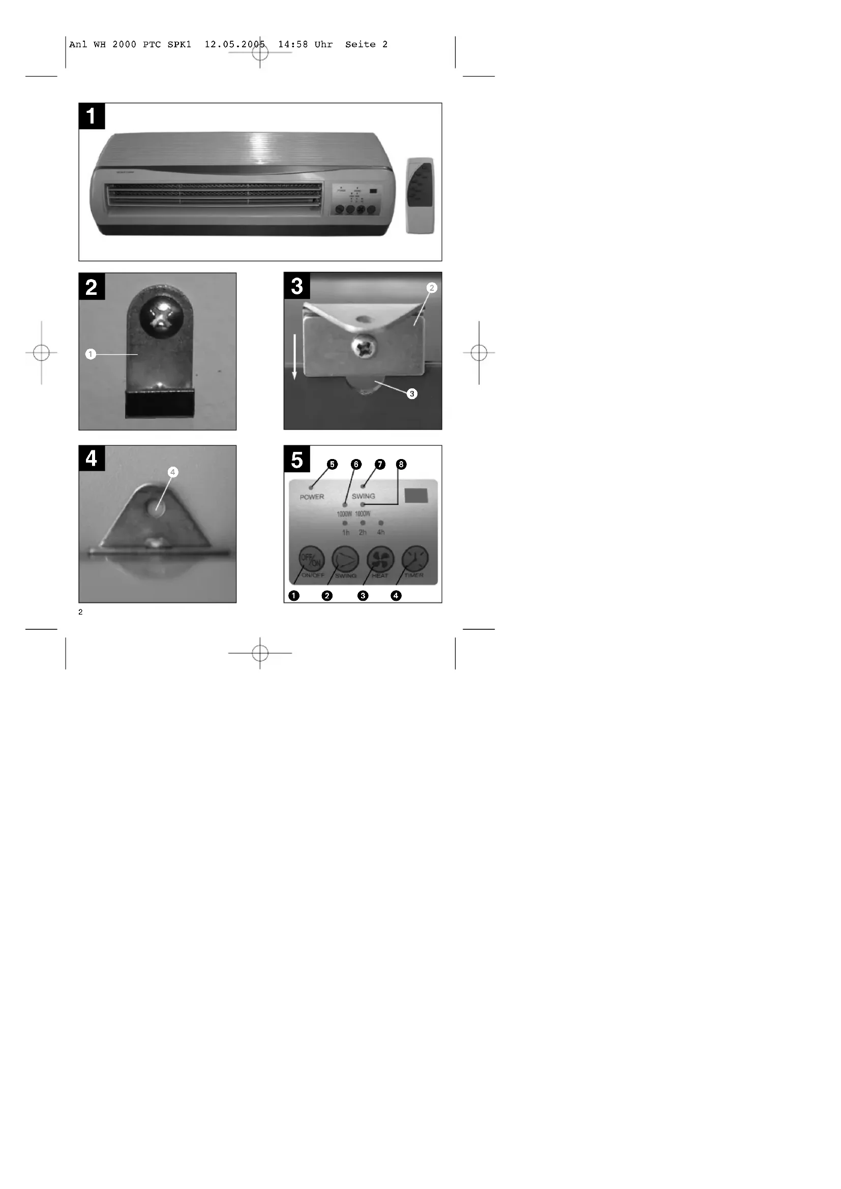 Anl WH 2000 PTC SPK1 12.05.2005 14:58 Uhr Seite 34 Wandhaken (1) an der Wand befestigen. 앬 Anschließend wird das Gerät zusätzlich mit einer Halterung (2) an der Wand fixiert. Schieben Sie die Halterung bis zum Anschlag in die dafür vorgesehene Kerbe (3) des Gehäuses und ziehen Sie die Halterung am Gehäuse fest. 앬 Hängen Sie das Gerät in die Wandhaken ein. 앬 Markieren Sie das Bohrloch (4), bohren Sie das Loch, setzen Sie den Dübel ein und befestigen Sie die Halterung mittels der beigelegten Schraube an der Wand. Hinweis: Die Netzleitung wird nach oben durch die dafür vorgesehene Kerbe ausgeführt.