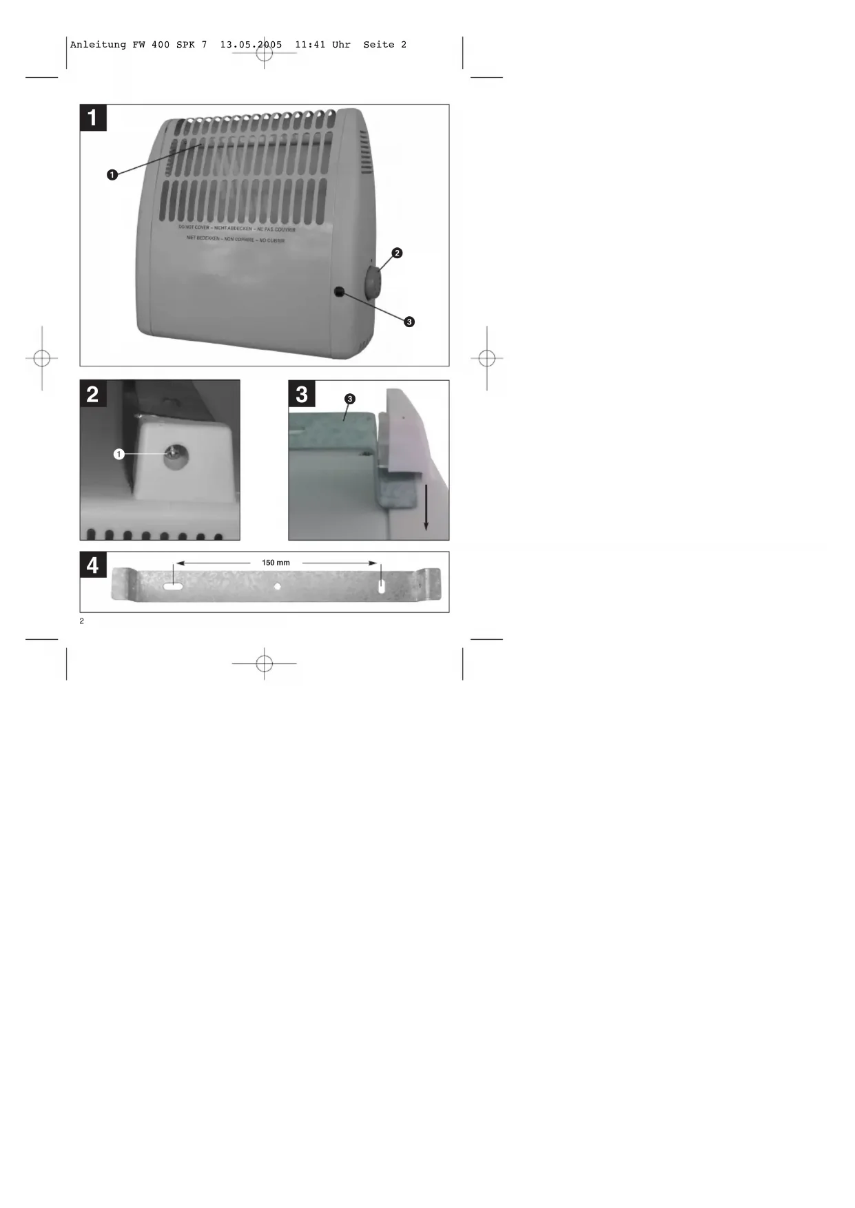 Anleitung FW 400 SPK 7 13.05.2005 11:41 Uhr Seite 34 Rückwand des Heizers ab. 앬 Position der Bohrlöcher an der Wand markieren, Löcher bohren, Dübel einsetzen 앬 Wandhalterung waagerecht an Wand schrauben 앬 Gehäuserückwand des Heizers in die an die Wand montierte Wandhalterung schieben und mit den seitlichen Schrauben sichern.
