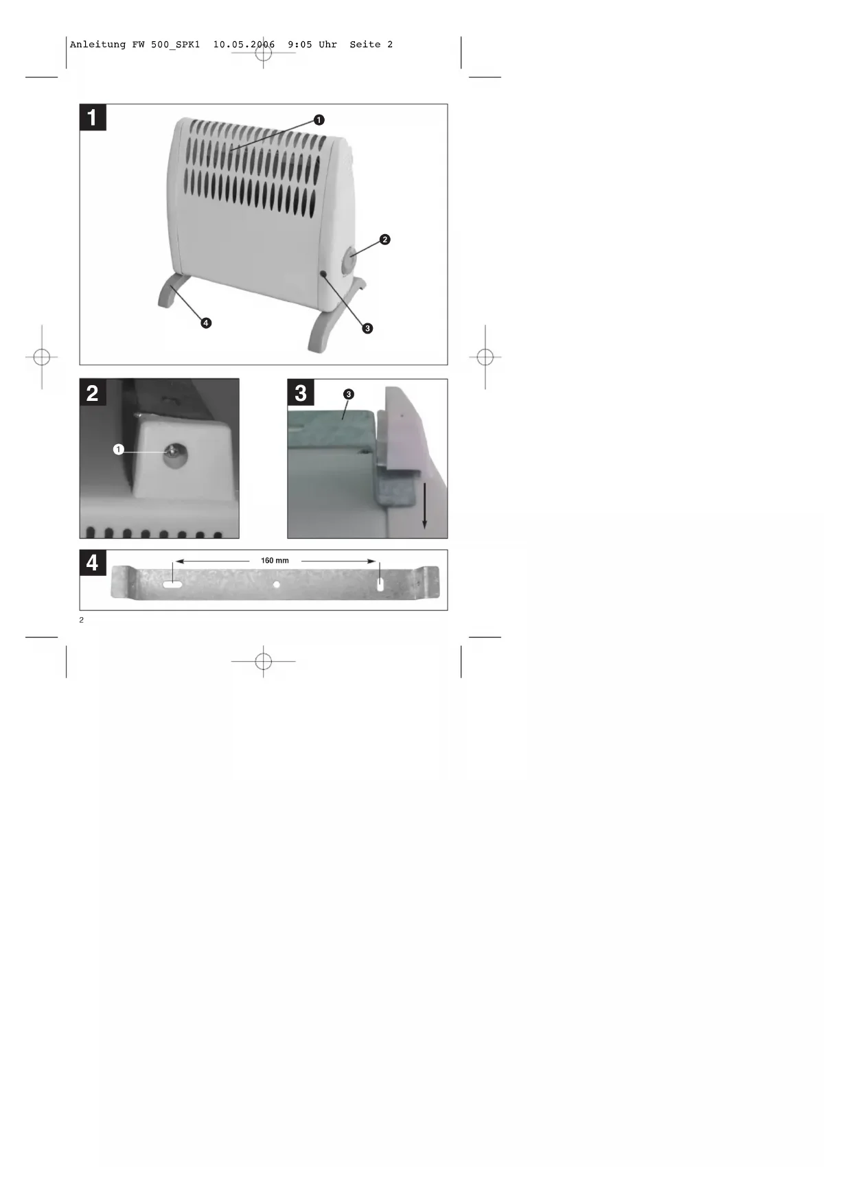 Anleitung FW 500_SPK1 10.05.2006 9:05 Uhr Seite 45 Installationen (z.B. Wasserrohre) befinden. Achten Sie auf festen, waagerechten Sitz des Gerätes an der Wand. Entfernen Sie die beiden seitlichen Sicherungsschrauben (1) mit denen die Wandhalterung am Heizer befestigt ist und schieben Sie die Wandhalterung (2) von der Rückwand des Heizers ab. Position der Bohrlöcher an der Wand markieren, Löcher bohren, Dübel einsetzen Wandhalterung waagerecht an Wand schrauben Gehäuserückwand des Heizers in die an die Wand montierte Wandhalterung schieben und mit den seitlichen Schrauben sichern.