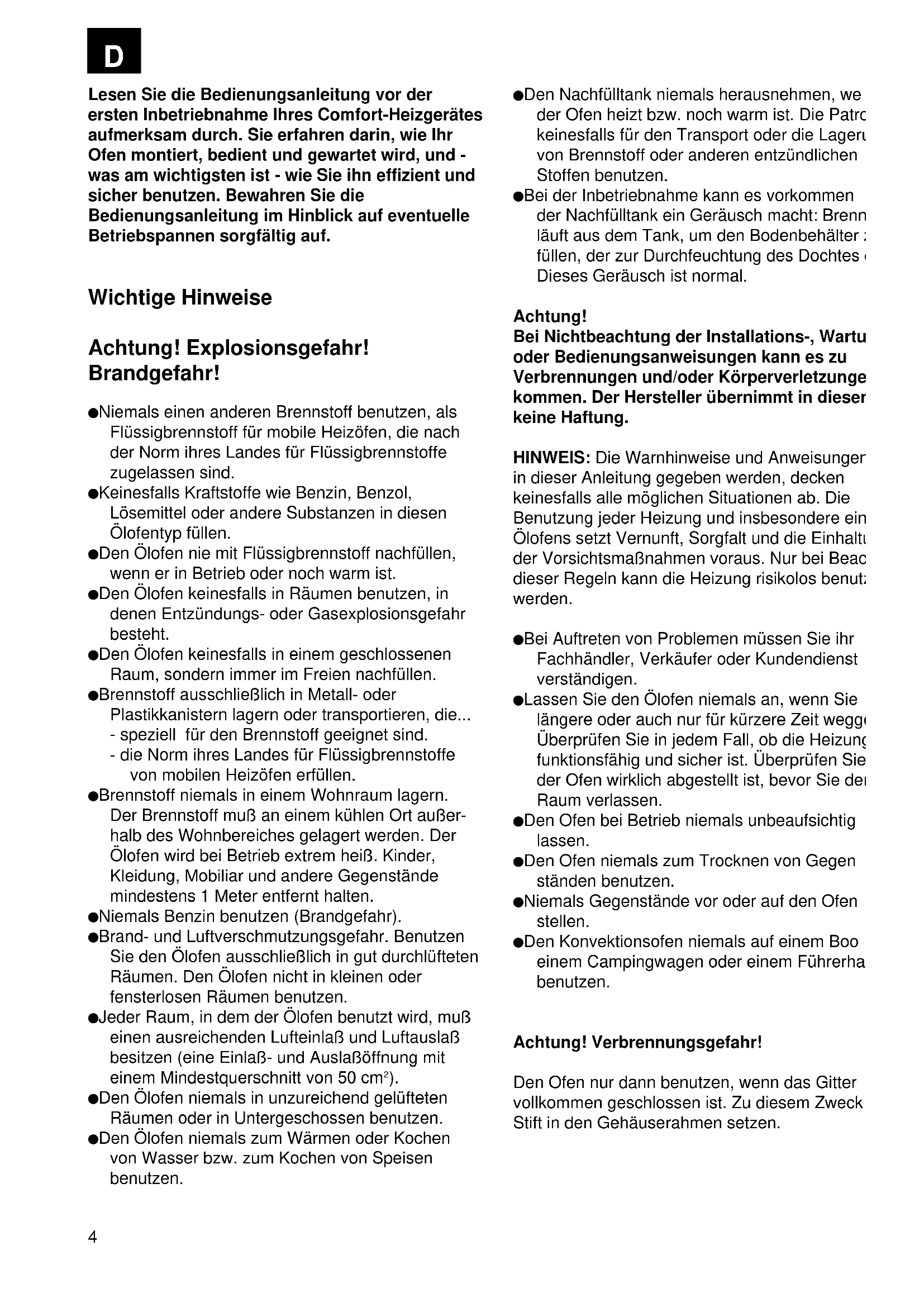 Lesen Sie die Bedienungsanleitung vor der ersten Inbetriebnahme Ihres Comfort-Heizgerätes aufmerksam durch. Sie erfahren darin, wie Ihr Ofen montiert, bedient und gewartet wird, und - was am wichtigsten ist - wie Sie ihn effizient und sicher benutzen. Bewahren Sie die Bedienungsanleitung im Hinblick auf eventuelle Betriebspannen sorgfältig auf. Wichtige Hinweise Achtung! Explosionsgefahr! Brandgefahr! Niemals einen anderen Brennstoff benutzen, als Flüssigbrennstoff für mobile Heizöfen, die nach der Norm ihres Landes für Flüssigbrennstoffe zugelassen sind. Keinesfalls Kraftstoffe wie Benzin, Benzol, Lösemittel oder andere Substanzen in diesen Ölofentyp füllen. Den Ölofen nie mit Flüssigbrennstoff nachfüllen, wenn er in Betrieb oder noch warm ist. Den Ölofen keinesfalls in Räumen benutzen, in denen Entzündungs- oder Gasexplosionsgefahr besteht. Den Ölofen keinesfalls in einem geschlossenen Raum, sondern immer im Freien nachfüllen. Brennstoff ausschließlich in Metall- oder Plastikkanistern lagern oder transportieren, die... - speziell für den Brennstoff geeignet sind. - die Norm ihres Landes für Flüssigbrennstoffe von mobilen Heizöfen erfüllen. Brennstoff niemals in einem Wohnraum lagern. Der Brennstoff muß an einem kühlen Ort außer- halb des Wohnbereiches gelagert werden. Der Ölofen wird bei Betrieb extrem heiß. Kinder, Kleidung, Mobiliar und andere Gegenstände mindestens 1 Meter entfernt halten. Niemals Benzin benutzen (Brandgefahr). Brand- und Luftverschmutzungsgefahr. Benutzen Sie den Ölofen ausschließlich in gut durchlüfteten Räumen. Den Ölofen nicht in kleinen oder fensterlosen Räumen benutzen. Jeder Raum, in dem der Ölofen benutzt wird, muß einen ausreichenden Lufteinlaß und Luftauslaß besitzen (eine Einlaß- und Auslaßöffnung mit einem Mindestquerschnitt von 50 cm