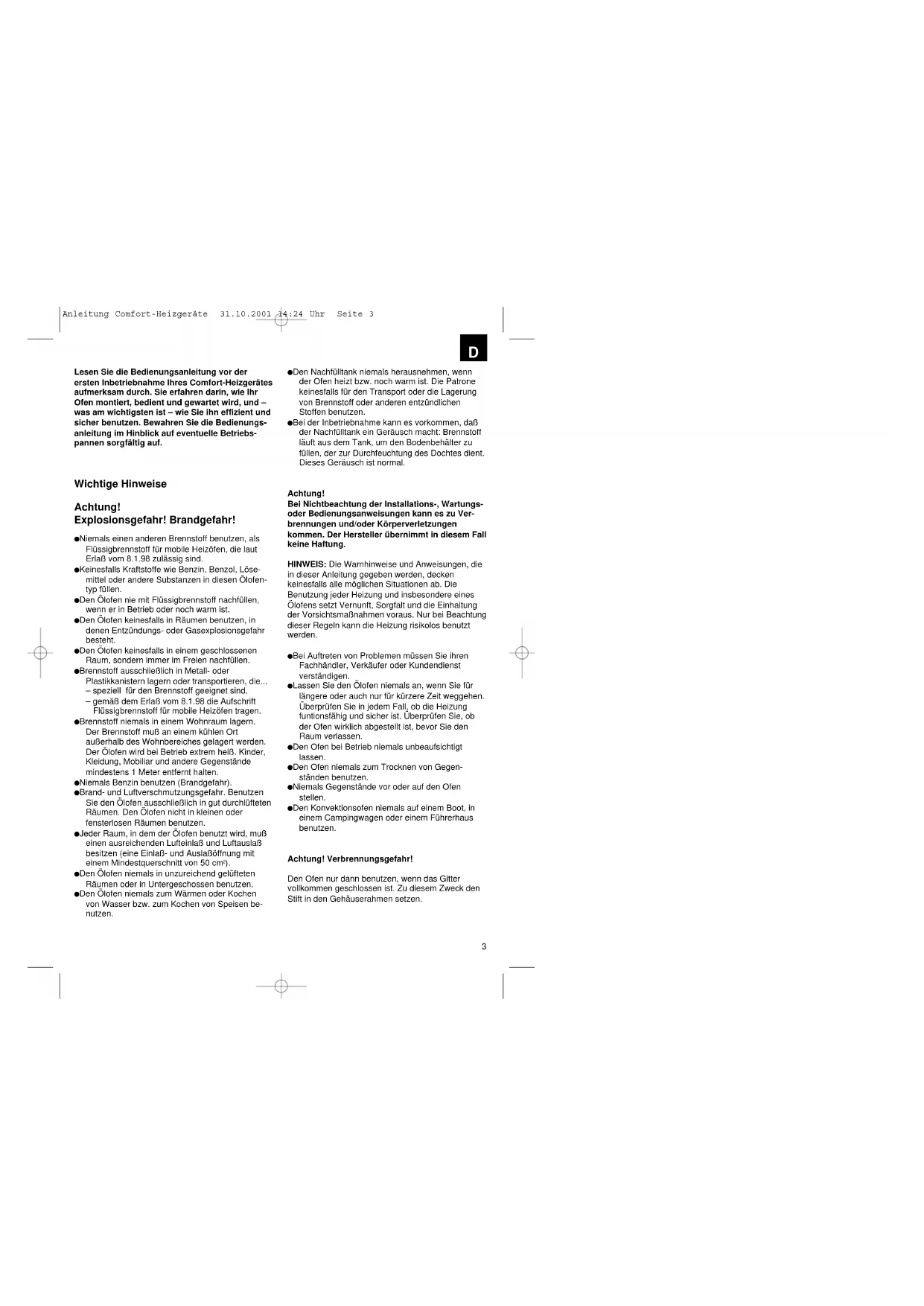 Den Ölofen niemals in unzureichend gelüfteten Räumen oder in Untergeschossen benutzen. Den Ölofen niemals zum Wärmen oder Kochen von Wasser bzw. zum Kochen von Speisen be- nutzen. Den Nachfülltank niemals herausnehmen, wenn der Ofen heizt bzw. noch warm ist. Die Patrone keinesfalls für den Transport oder die Lagerung von Brennstoff oder anderen entzündlichen Stoffen benutzen. Bei der Inbetriebnahme kann es vorkommen, daß der Nachfülltank ein Geräusch macht: Brennstoff läuft aus dem Tank, um den Bodenbehälter zu füllen, der zur Durchfeuchtung des Dochtes dient. Dieses Geräusch ist normal. Achtung! Bei Nichtbeachtung der Installations-, Wartungs- oder Bedienungsanweisungen kann es zu Ver- brennungen und/oder Körperverletzungen kommen. Der Hersteller übernimmt in diesem Fall keine Haftung. HINWEIS: Die Warnhinweise und Anweisungen, die in dieser Anleitung gegeben werden, decken keinesfalls alle möglichen Situationen ab. Die Benutzung jeder Heizung und insbesondere eines Ölofens setzt Vernunft, Sorgfalt und die Einhaltung der Vorsichtsmaßnahmen voraus. Nur bei Beachtung dieser Regeln kann die Heizung risikolos benutzt werden. Bei Auftreten von Problemen müssen Sie ihren Fachhändler, Verkäufer oder Kundendienst verständigen. Lassen Sie den Ölofen niemals an, wenn Sie für längere oder auch nur für kürzere Zeit weggehen. Überprüfen Sie in jedem Fall, ob die Heizung funtionsfähig und sicher ist. Überprüfen Sie, ob der Ofen wirklich abgestellt ist, bevor Sie den Raum verlassen. Den Ofen bei Betrieb niemals unbeaufsichtigt lassen. Den Ofen niemals zum Trocknen von Gegen- ständen benutzen. Niemals Gegenstände vor oder auf den Ofen stellen. Den Konvektionsofen niemals auf einem Boot, in einem Campingwagen oder einem Führerhaus benutzen. Achtung! Verbrennungsgefahr! Den Ofen nur dann benutzen, wenn das Gitter vollkommen geschlossen ist. Zu diesem Zweck den Stift in den Gehäuserahmen setzen. Anleitung Comfort-Heizgeräte 31.10.2001 14:24 Uhr Seite 3D